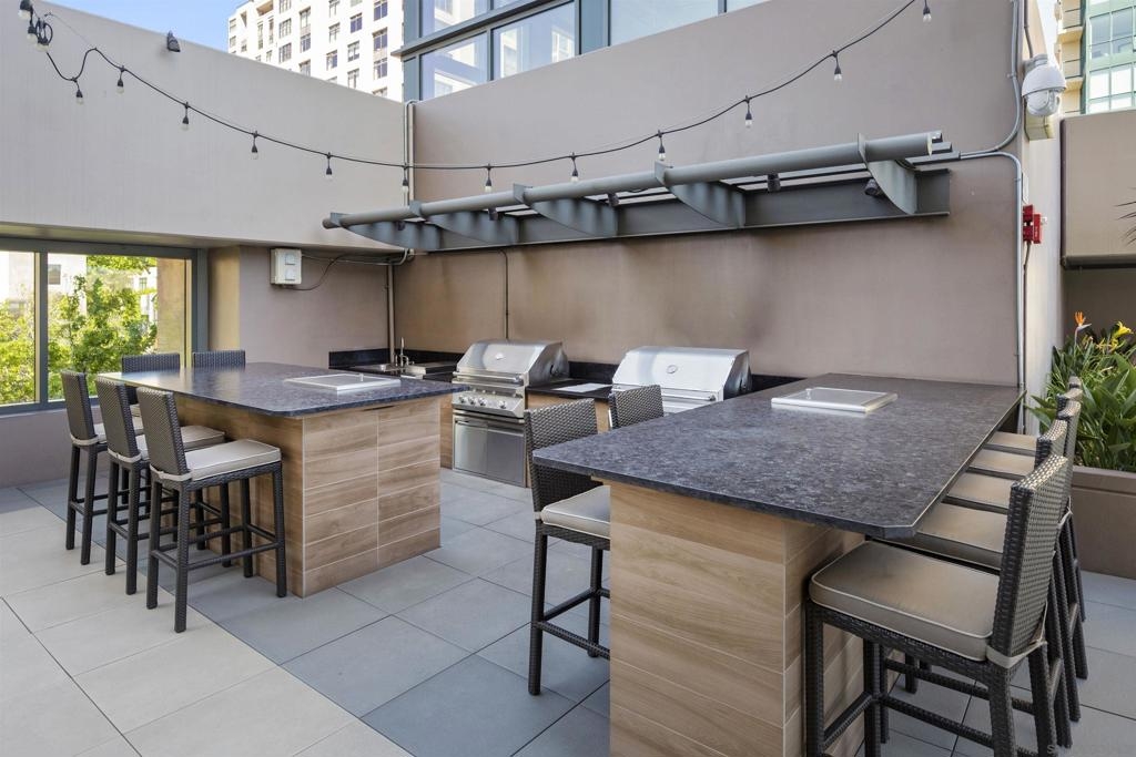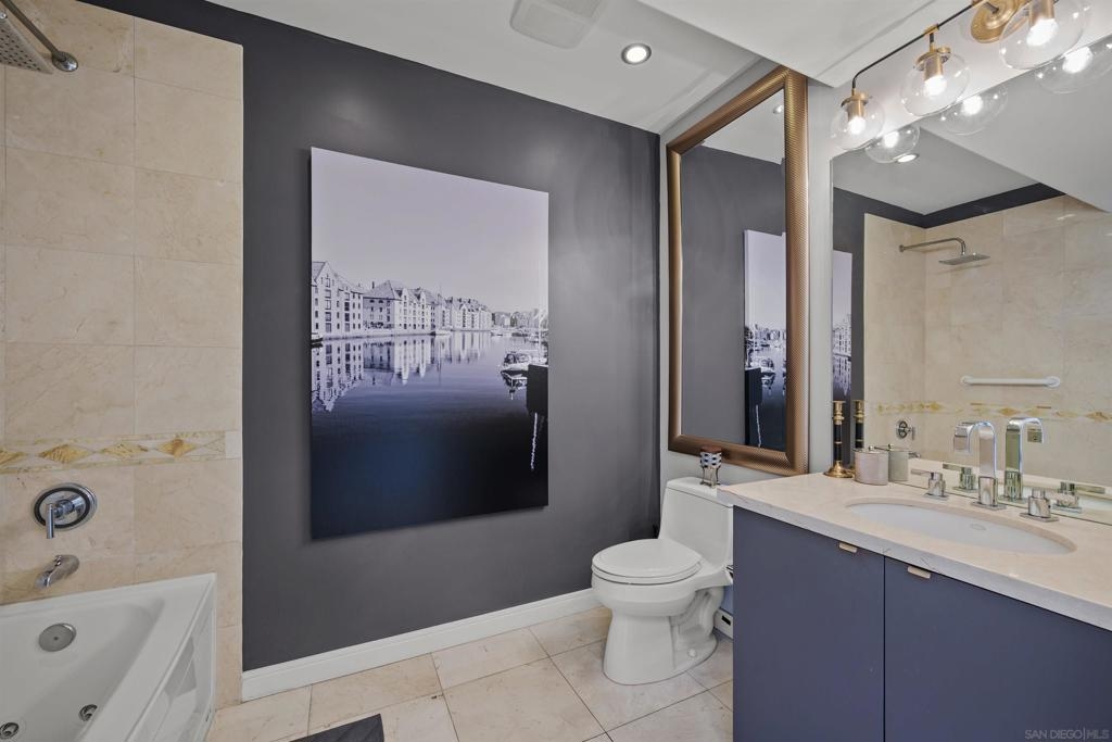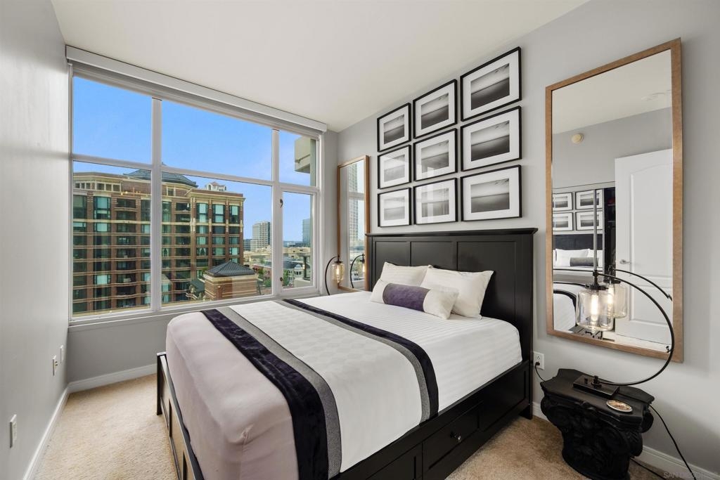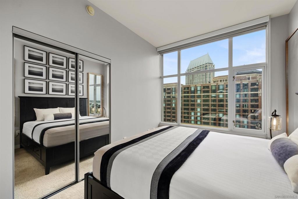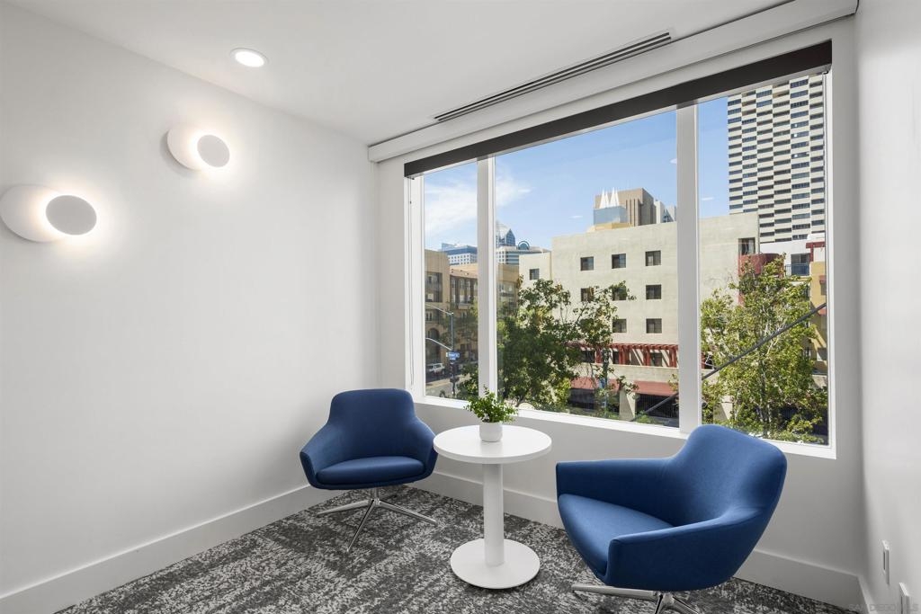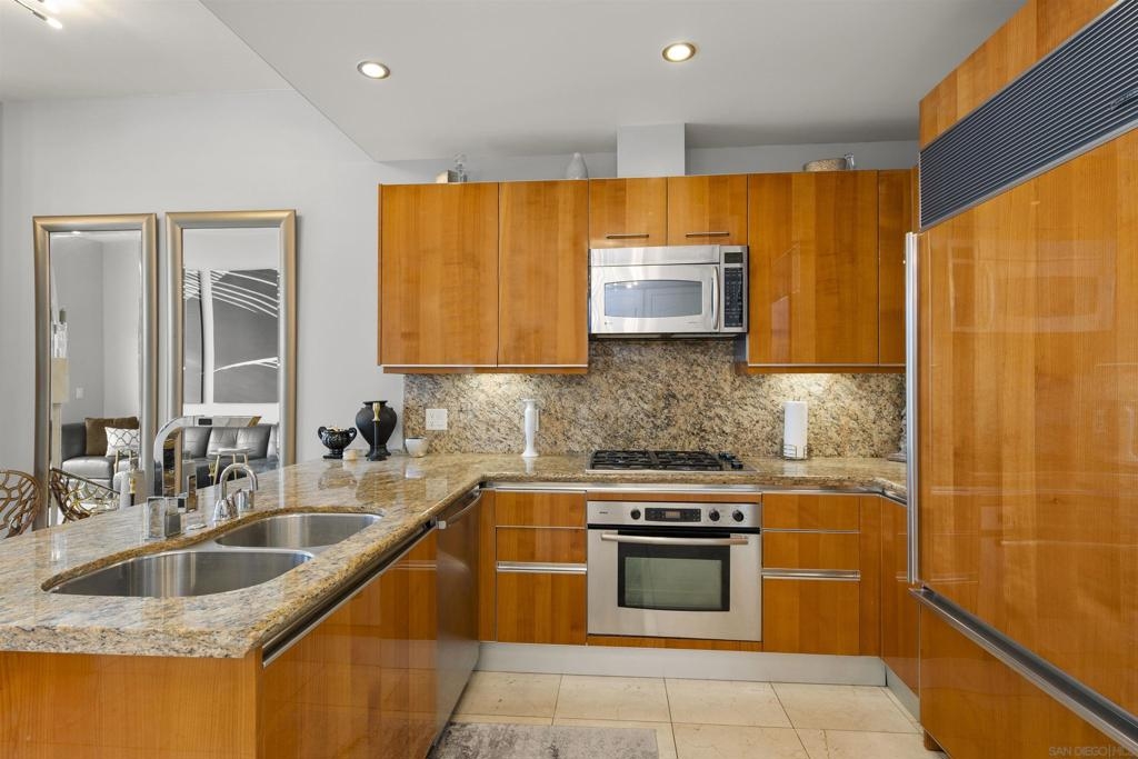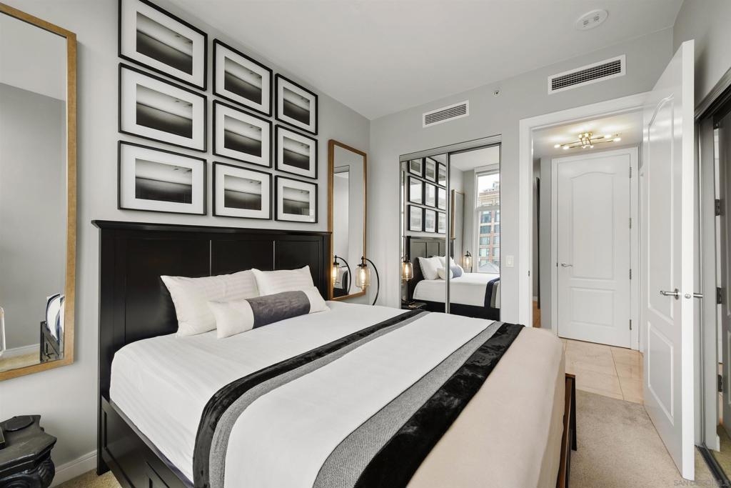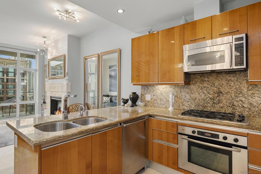 BAY VIEWS FOR UNDER $600K. Discover modern sophistication at The Pinnacle, where contemporary living reaches new heights. This 7th floor residence features soaring 10-foot ceilings, sleek marble flooring, an ambient electric fireplace, and a private west-facing balcony with captivating views of the San Diego Bay. The open kitchen features an integrated Sub-Zero refrigerator, Bosch appliances, Snaidero Italian cabinetry, newer designer paint and ultra modern light fixtures throughout. The bathroom features a soaking tub and shower combo, and recently updated cabinetry and countertop. Ideally situated in the heart of the Marina District, this turnkey residence delivers an exceptional urban lifestyle. Enjoy one deeded full size parking space as well as a storage unit. Inquire about Seller credit toward HOA dues. Welcome to The Pinnacle—where life reaches new heights of luxury and convenience. Nestled in the heart of the Marina District, this premier residence places you just steps from San Diego’s most iconic destinations: scenic Waterfront Park, vibrant Seaport Village, The Headquarters, the reimagined Children’s Park, and the world-class Rady Shell at Jacobs Park. At The Pinnacle, residents are treated to an unmatched suite of amenities: a stunningly designed lobby with full-service concierge, a state-of-the-art fitness center with steam and sauna rooms, a heated Olympic-style pool, a resort-style outdoor kitchen and BBQ area, a resident lounge and meeting room with a fully equipped kitchen, and even a furnished guest suite for visiting friends and family. Immerse yourself in the Pinnacle of Downtown living where elegance, comfort, and location converge. Builder brochure cites the unit as 737 sq. ft., tax records how 669 sq. ft.