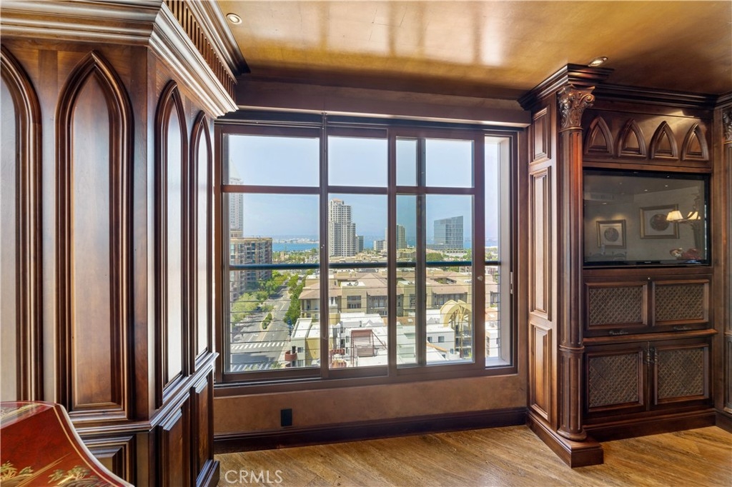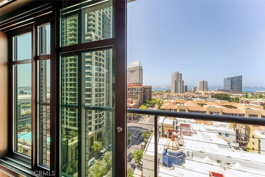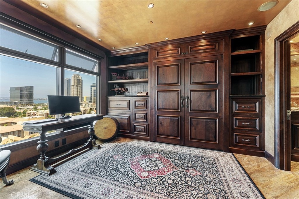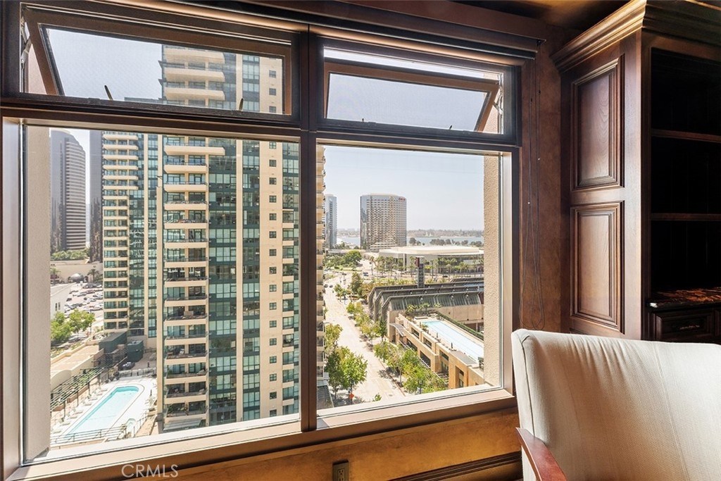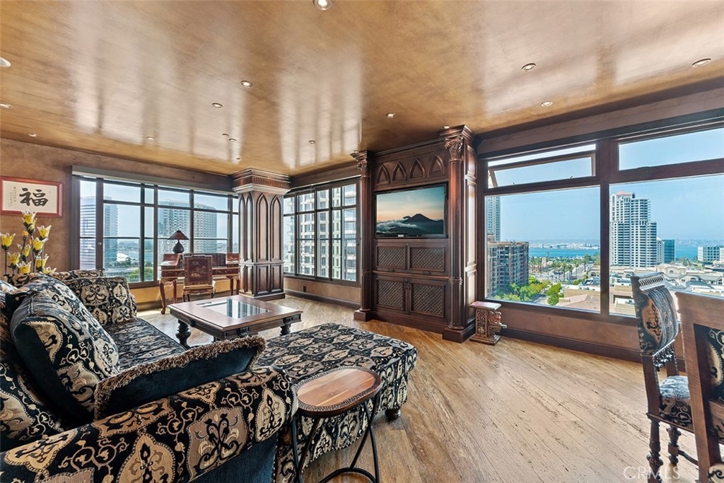 Experience the elegance of old-world craftsmanship in this handcrafted, Italian-inspired, single-level residence. Designed with Accordion-style windows that fully open to showcase sweeping southern and western views of San Diego Bay, the Coronado Bridge, distant ocean horizons, and breathtaking sunsets. Exquisite details abound throughout the home, including Italian marble and granite, solid walnut cabinetry, Venetian plaster walls, and hand-laid gold and silver leaf ceilings. The 200-year-old Moroccan double doors serve as a striking focal point, blending global artistry with European sophistication. The open floor plan evokes the grandeur of a 17th-century European estate, where every element has been meticulously crafted to reflect a time when artisanship was paramount. The ambiance is one of timeless opulence, elevating this home to the pinnacle of luxury high-rise living in San Diego. (Gourmet Kitchen & Entertaining Features) The chef's kitchen includes a Sub-Zero refrigerator/freezer, Viking range hood and gas top, built-in Monogram microwave and oven and a newly installed Bosch dishwasher. Along with a custom 220-bottle refrigerated wine cellar/cabinet is a floor to ceiling pantry with built-in drawers and shelves. (Recent Building Updates) The building has recently experienced thoughtful renovations, including two resident lounges, new outdoor/indoor furniture, an upgraded, heated pool and a reimagined lobby/reception space, (still in finishing phase), paid for by the HOA's dues. Renaissance also carries a relatively high reserve of 5-6 Mil. (Additional Notable Features) - Updated bathrooms featuring new toilets, bidet, and showerheads, Walnut-crafted Murphy bed, Two secured parking spaces, Two private storage cages in the garage (one oversized), One additional airconditioned storage room located on the *1 level. This one-of-a-kind masterpiece is a rare opportunity to own a residence where historic inspiration meets modern luxury.