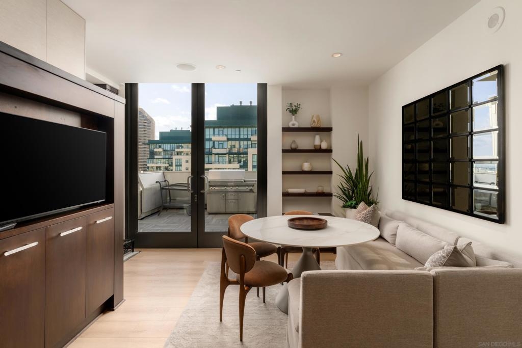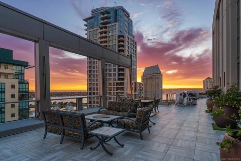 Welcome to Renaissance Penthouse Residence 2204, a recently renovated, top-floor, two-story home occupying the entire southern half of the building with over 2,400 sq. ft of private outdoor living space. This rare residence offers sweeping views with mountains to the east, Downtown and Coronado to the south, and expansive bay and ocean views to the west. Recent renovations include wide plank luxury vinyl flooring throughout the main living areas, plush new carpeting in the primary suite and office, smooth-finished walls, fresh paint, custom drapery, upgraded hardware, and a redesigned powder room. The home features multiple living and entertaining spaces, including formal living and dining areas, a family room with an Onyx stone wet bar and fireplace, a private office, and a 6-zone Sonos sound system. There is also the option to install an elevator. The primary suite offers a massive walk-in closet, a dedicated vanity area, and a spacious two-person shower. The kitchen is finished with Taj Mahal quartzite countertops and full-height backsplashes, a Wolf gas range, dual Sub-Zero frig/freezers, 2 sinks, and 2 dishwashers. Additional highlights include custom railings by artist Linda Joanoue, 3 hand-blown, Chihuly-inspired glass chandeliers, and a temperature-controlled 300+ bottle wine refrigerator. Designed for entertaining, this home can comfortably host over 150 guests. Offered with 3 parking spaces and 3 large storage lockers, this penthouse presents a rare opportunity to own a one-of-a-kind residence in the heart of Downtown.