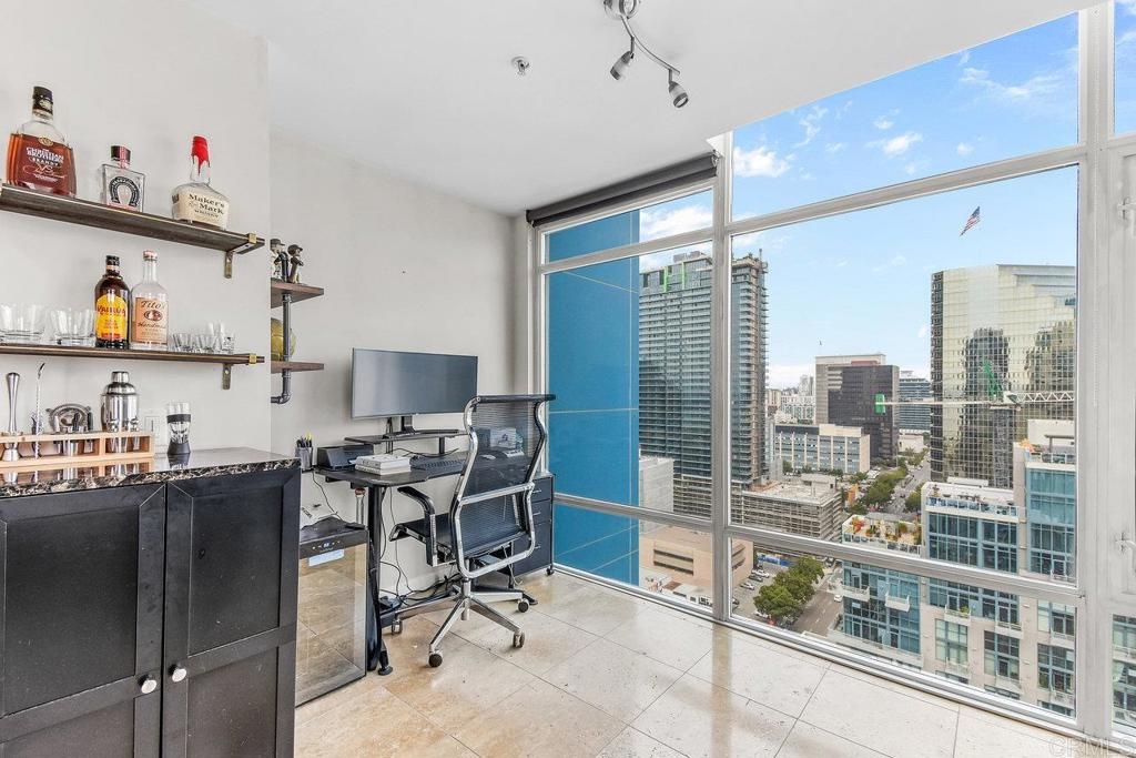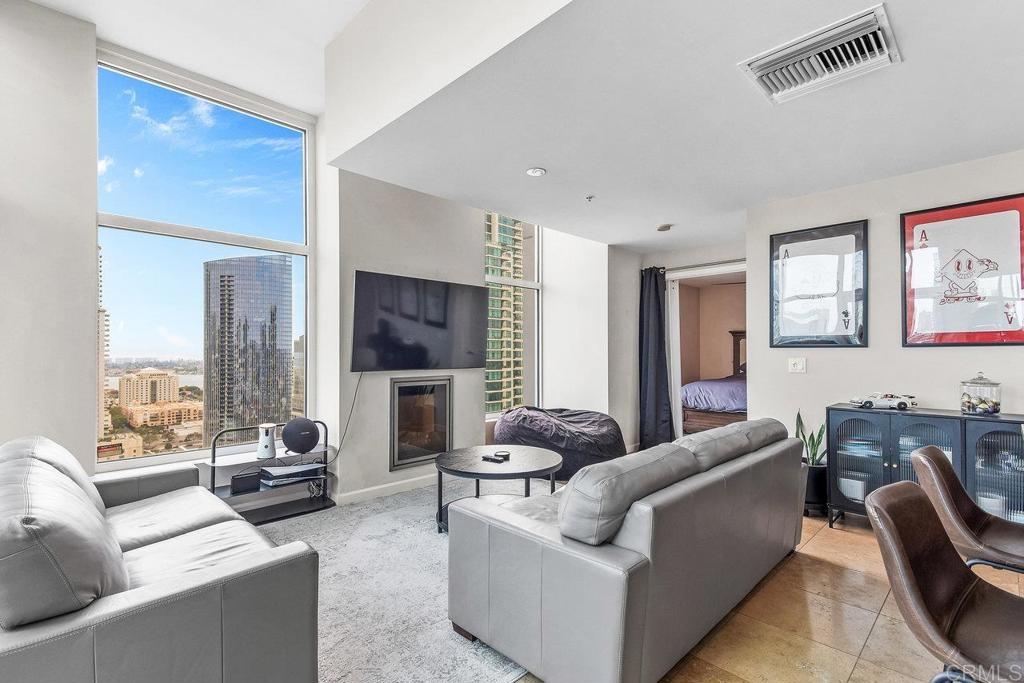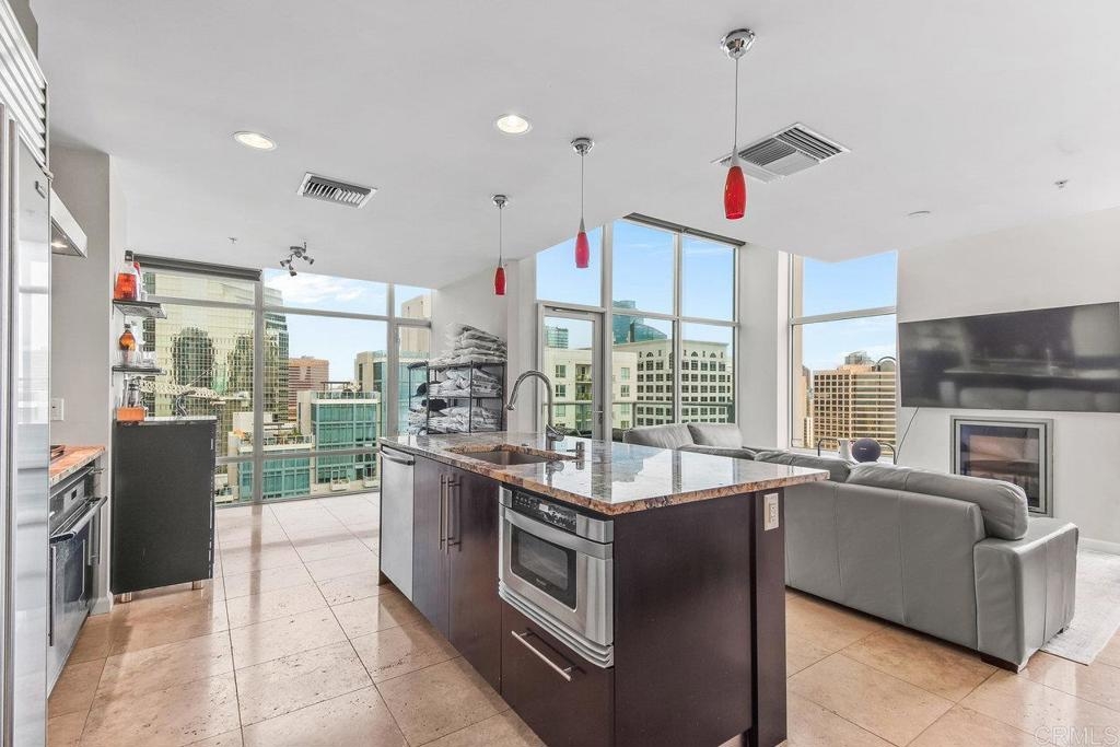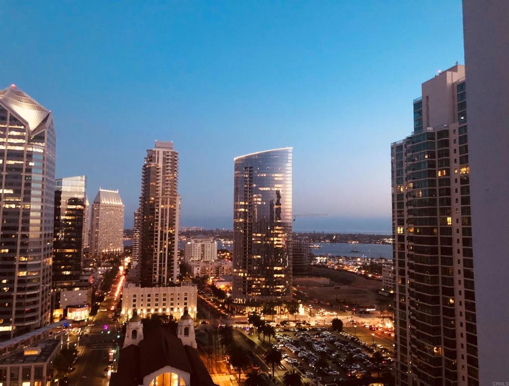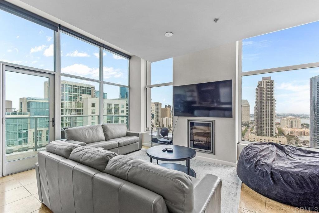 Experience breathtaking cityscape, water bay and ocean views from this exquisite southeast corner residence located on the 23rd floor of the prestigious Sapphire Tower. This junior penthouse features luxurious finishes, travertine flooring, floor-to-ceiling windows, an electric fireplace, and a stunning open-concept kitchen. The kitchen is equipped with top-of-the-line stainless steel appliances, including a 5-burner Dacor range with a large oven, a Sub-Zero refrigerator, and granite countertops with a central island. The primary bedroom offers a spacious walk-in closet, and the large balcony provides breathtaking views. The complex offers access to a resort-style pool, hot tub, barbecues, sauna, fitness room, party room, theater, and 24-hour staffed front desk security. Enjoy luxurious living in the heart of the city, steps away from Little Italy, Waterfront, and Seaport Village. This is an ideal place to enjoy stunning evenings. Come and make it your own!