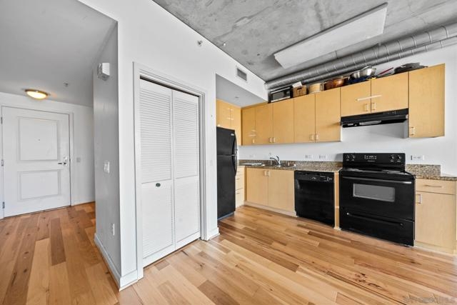 Open city views from this larger than usual 10th floor sunny studio residence at Smart Corner. Delight in the easy to maintain BRAND NEW wood floors, custom paint, upgraded lighting, private balcony, and loft-like cement accents. Relax and take in the city, and even a peek-a-boo Coronado bridge view from the private, east-facing balcony that spans the width of the entire loft space. Washer/dryer, refrigerator and 1 parking space (224 on P3) included Equipment: Dryer, Washer Sewer: Sewer Connected Topography: LL