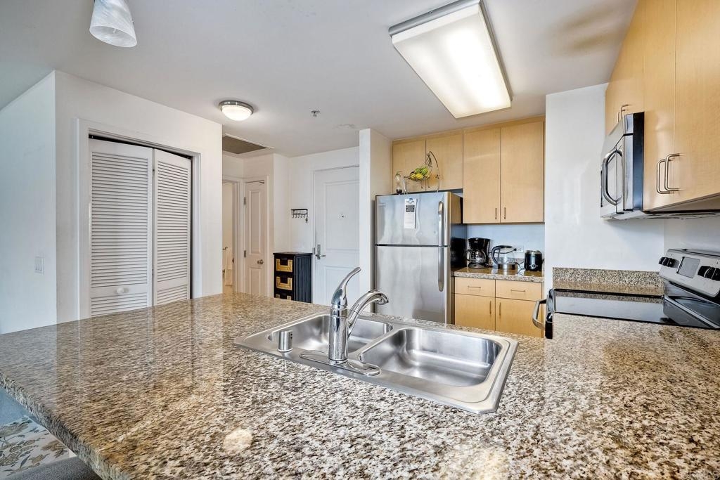Amazingly large condo in the Smart Corner complex! Features include stainless steel appliances, granite counter tops and stacked washer/dryer. The unit faces to an open & bright view of the street and has one assigned parking spot! The complex offers full amenities: roof top jaccuzi, BBQ/lounge & gym. Walk to Gaslamp, Petco Park and enjoy downtown!