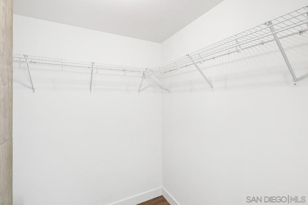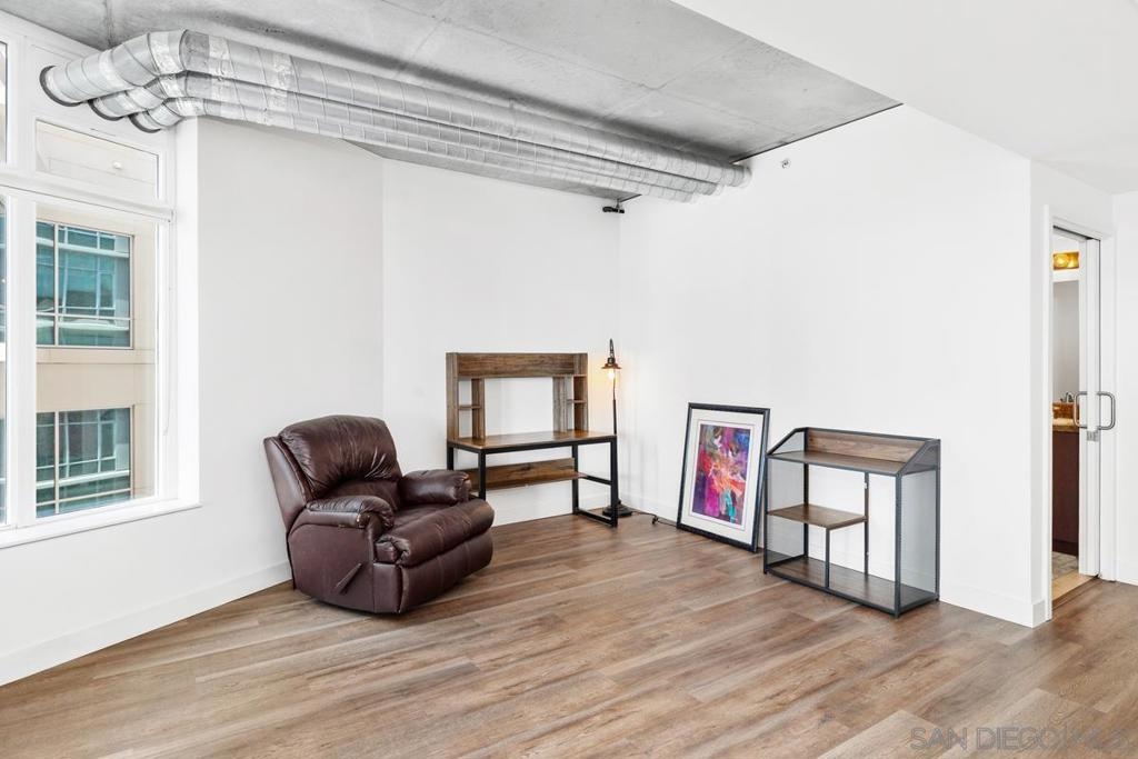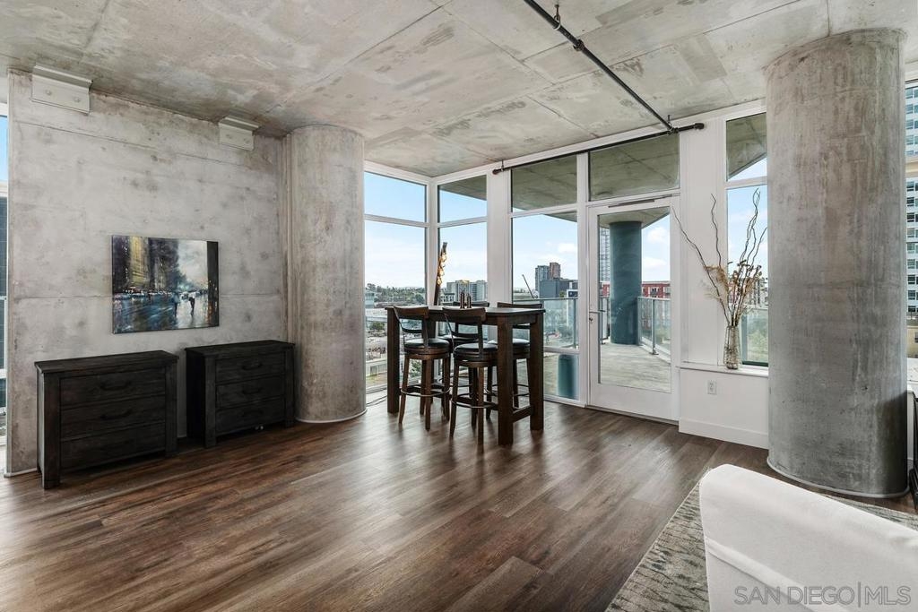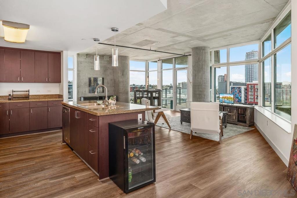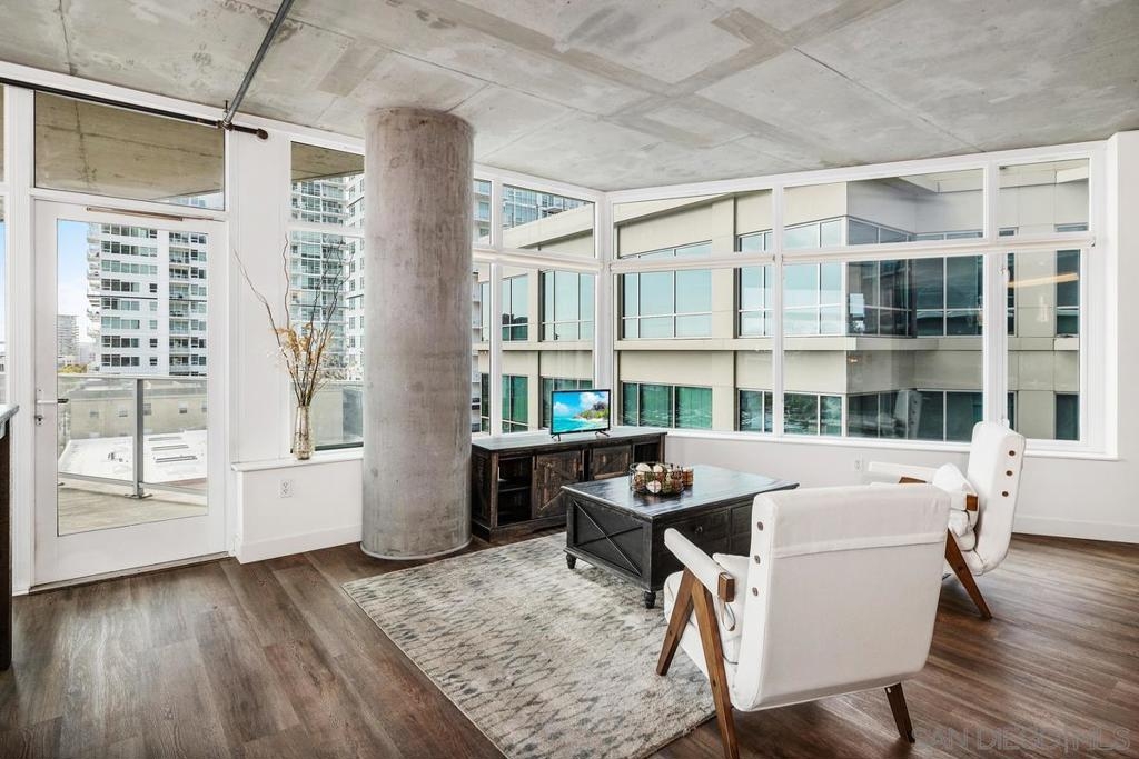 BEST PRICE CONDO IN SMART CORNER * LARGE PRIVATE BALCONY * 2 CAR PARKING * AMAZING CITY VIEWS. Welcome to Smart Corner, where modern design meets the energy of city living. This expansive 5th-floor corner unit offers 1,422 square feet of stylish, open-concept space with soaring ceilings, exposed concrete accents, and walls of windows that flood the home with natural light. This complex is VA approved! The spacious kitchen is perfect for gathering, featuring a central island with a breakfast bar, stainless steel appliances, and ample cabinetry. The open floor plan flows seamlessly into the living and dining areas, while a large covered balcony invites you to enjoy sweeping city views. The split-bedroom layout features 2 well-defined bedroom areas: a generous primary suite boasting a walk-in closet and ensuite bath, plus an open secondary bedroom area and full bath ideal for guests or a home office. This home includes in-unit laundry and two tandem parking spaces, offering convenience and ease of living. At Smart Corner, you’ll enjoy resort-style amenities including a rooftop terrace with 360° views of the city and bay, a community garden, BBQ area, hot tub, and onsite management with security. Perfectly situated, you’re just blocks from Balboa Park and minutes from Downtown, Little Italy, Petco Park, and San Diego Bay, with easy access to freeways and public transit. Experience the very best of urban living in one of San Diego’s most vibrant communities. Technically, this is a zero-bedroom/studio with open rooms. This complex is VA approved!