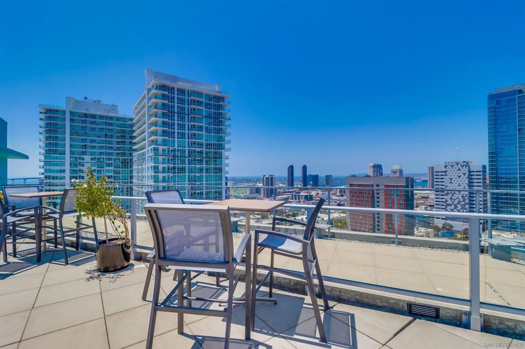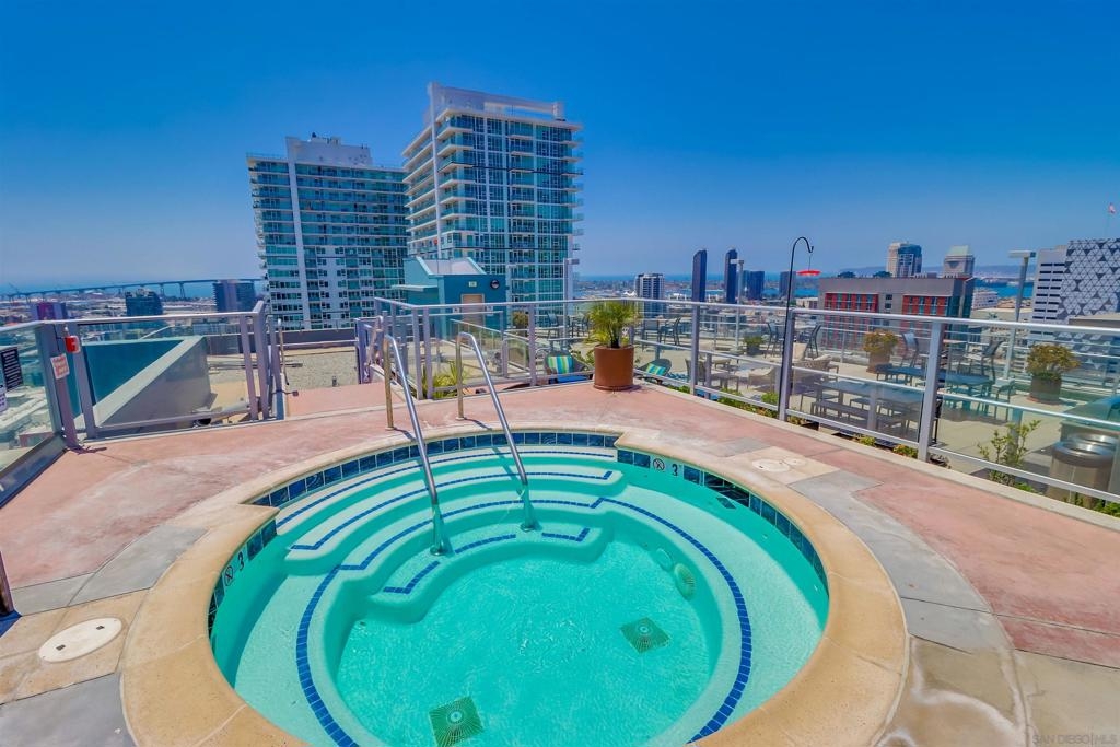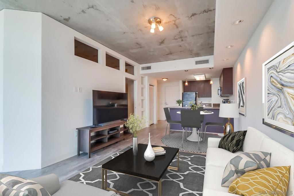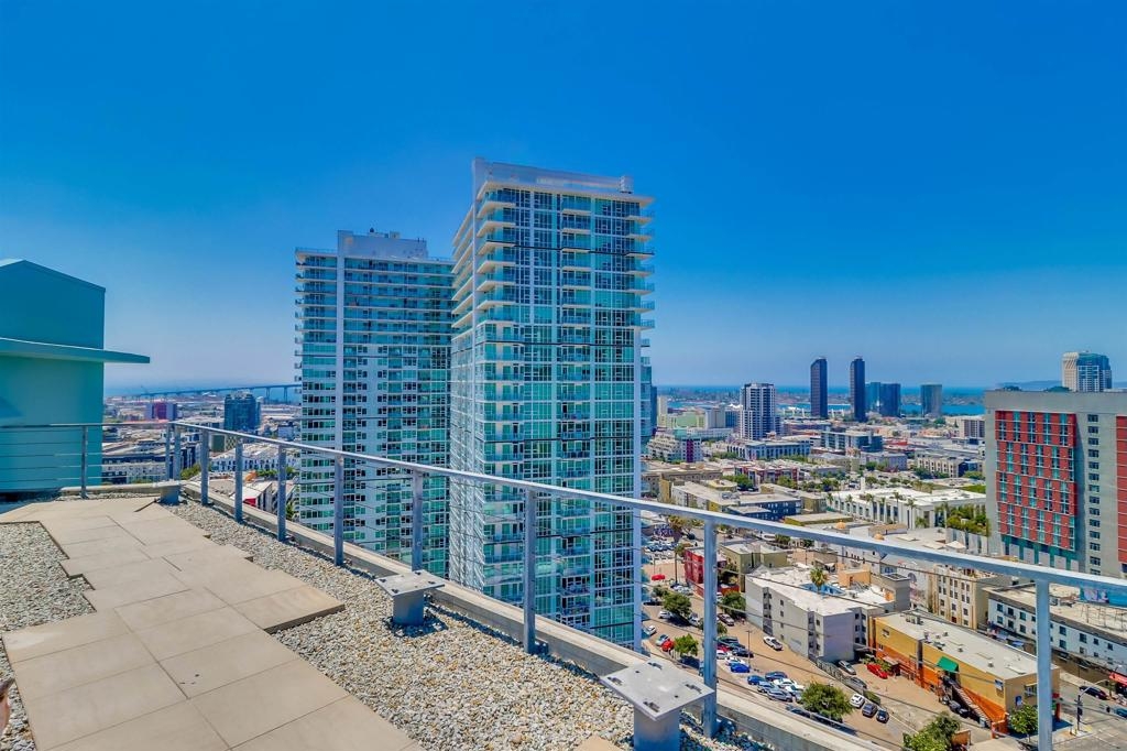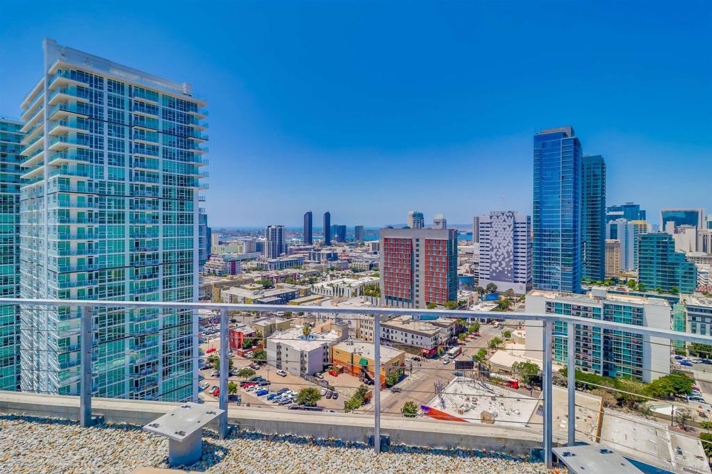 Urban chic at an incredible value! This immaculate 1-bedroom condo features tall ceilings, concrete accent walls and ceilings, exposed A/C ducts, a wall of windows, wood floors, and a light-filled den perfect for a home office. Enjoy a gourmet kitchen with European cabinets and granite counters, custom shelving, a private balcony, and in-unit washer/dryer. Includes secured garage parking. Amenities: rooftop terrace, spa, gym, 24-hour security. Walk to top dining and shopping! Has been a successful rental for our sellers. Downtown urban chic at an unbeatable price! This immaculate 1-bedroom condo blends industrial charm with modern comfort, featuring concrete accent walls and ceilings, exposed A/C ducts, tall ceilings, warm wood floors, a wall of windows, and abundant natural light. A spacious, sun-filled den offers the perfect home office. The gourmet kitchen shines with European cabinetry, granite countertops, and custom shelving. Enjoy a private balcony, in-unit washer/dryer, and a secured garage parking space. Building amenities are top-tier: a 20th-floor rooftop terrace with outdoor kitchen and dining, a spa/hot tub with views of Balboa Park, sundeck with loungers, a fully equipped fitness center, and 24-hour security for peace of mind. Centrally located with easy access to major highways, the airport, Balboa Park, and San Diego’s beautiful beaches, this home places you in the heart of it all. Just steps to downtown’s best restaurants, shops, and vibrant nightlife—this is stylish city living at its finest.