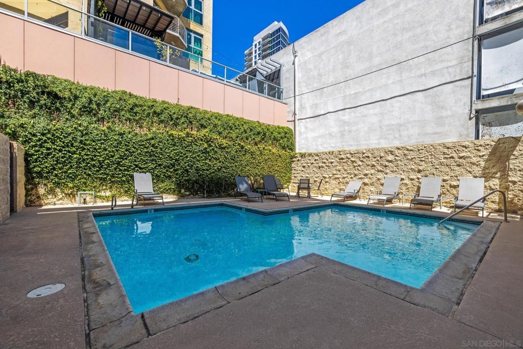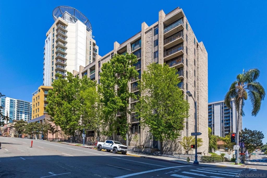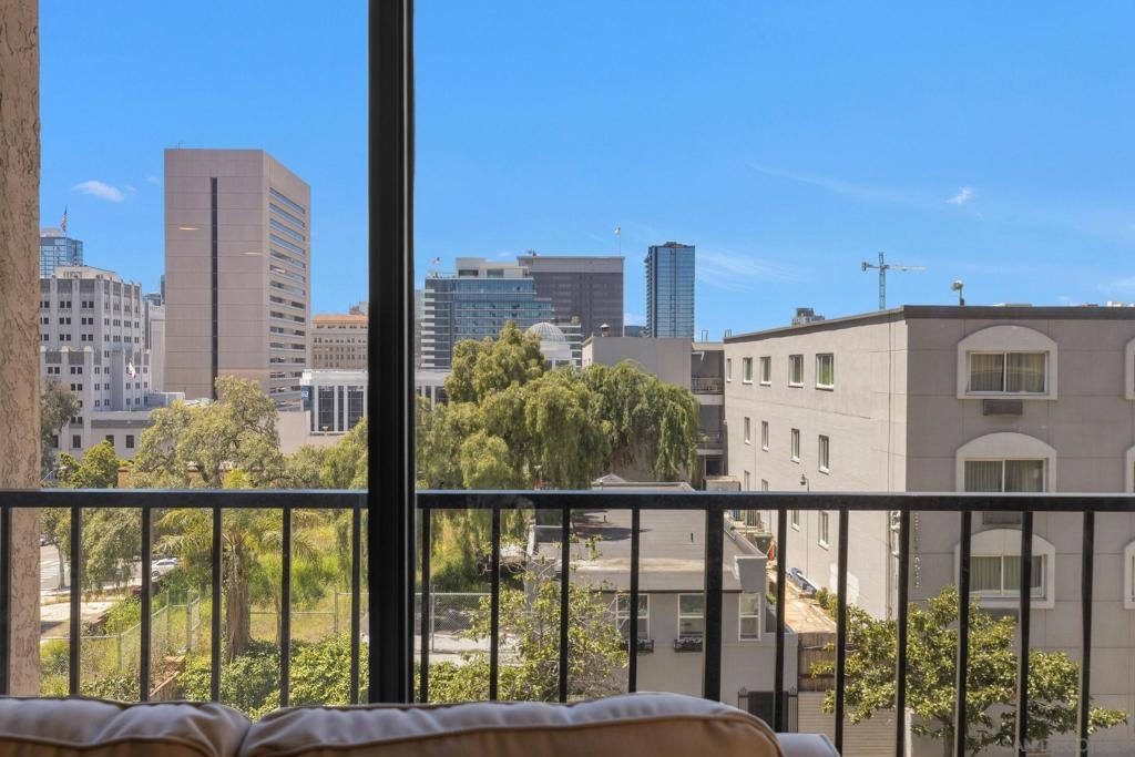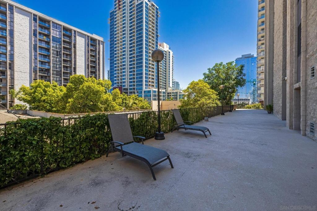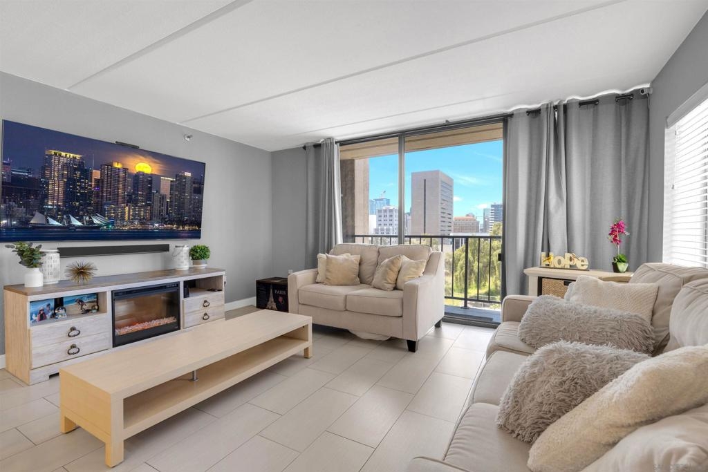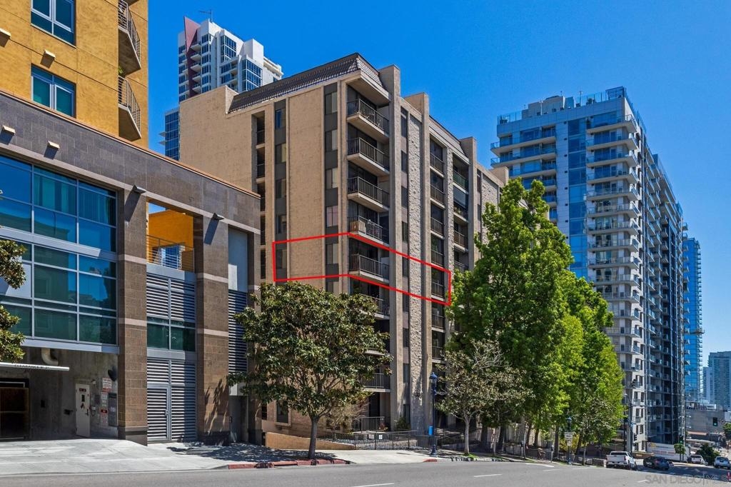 Welcome to Symphony Terrace in the Cortez Hill neighborhood of downtown San Diego. Enjoy the cool cross breezes in this Northwest corner location with a lot of natural light and great city views from the living room and balcony. The primary bedroom has lovely views of the tree tops. Modern, classic finishes like quartz countertops, contemporary appliances, and tile flooring have been upgraded in this home. There is a walk-in shower and closet in the main suite. There are two parking spots and a storage locker included. Fantastic building features include a guest suite, sizable lobby, pool, fitness center, sauna, steam room, bike room, and a poolside barbecue. Cortez Hill offers easy freeway access and is a short walk to Little Italy and the Gaslamp Quarter.