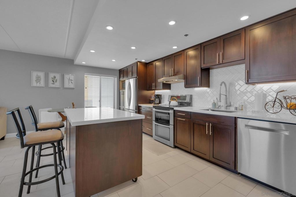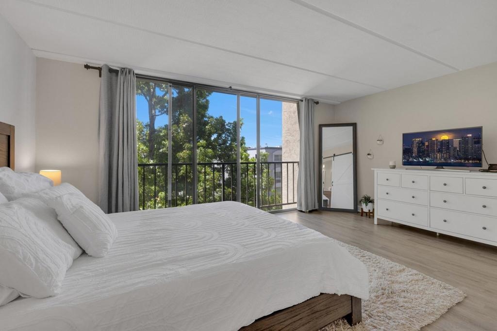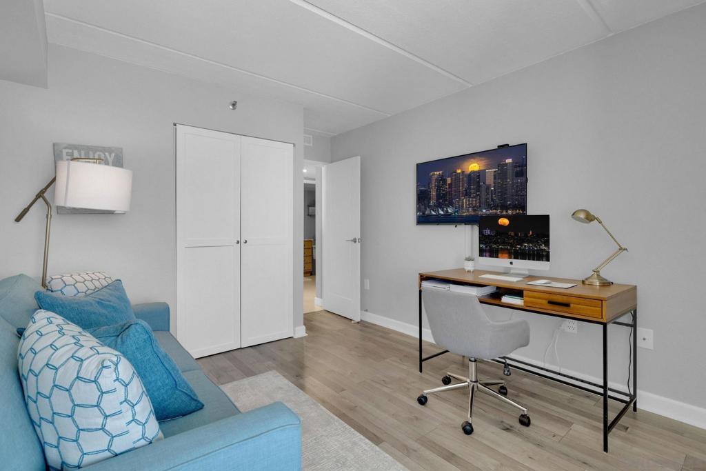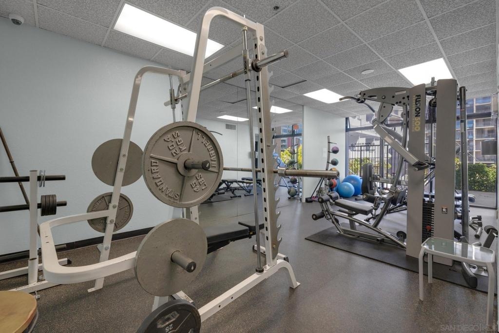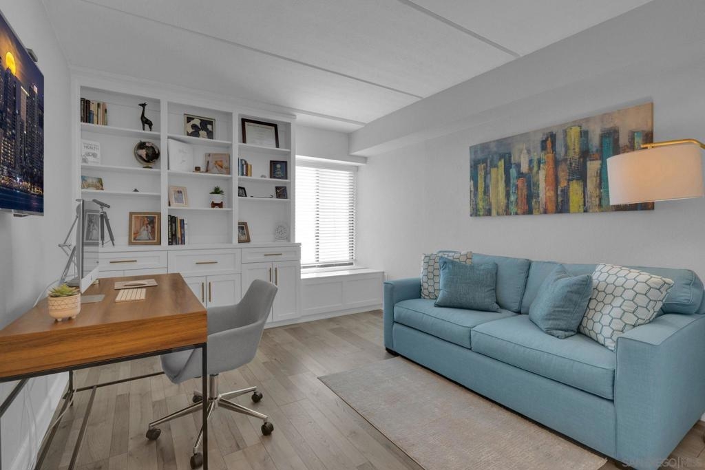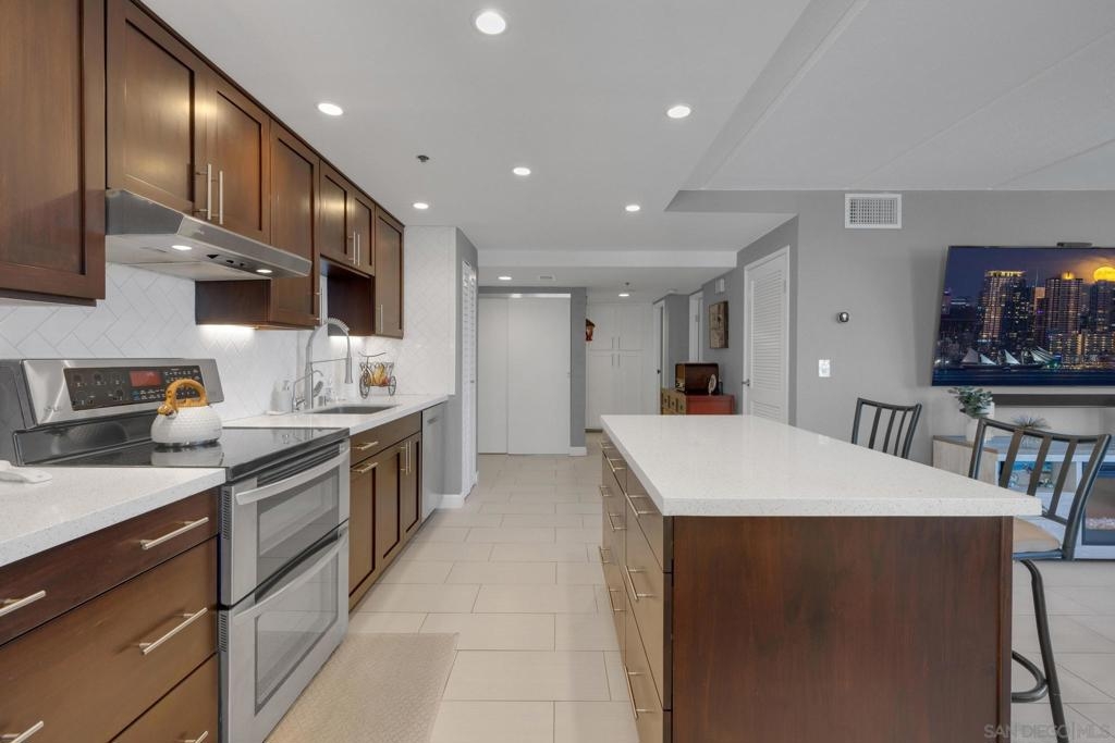 Welcome to Symphony Terrace in the Cortez Hill neighborhood of downtown San Diego. Enjoy the cool cross breezes in this Northwest corner location with a lot of natural light and great city views from the living room and balcony. The primary bedroom has lovely views of the tree tops. Modern, classic finishes like quartz countertops, contemporary appliances, and tile flooring have been upgraded in this home. There is a walk-in shower and closet in the main suite. There are two parking spots and a storage locker included. Fantastic building features include a guest suite, sizable lobby, pool, fitness center, sauna, steam room, bike room, and a poolside barbecue. Cortez Hill offers easy freeway access and is a short walk to Little Italy and the Gaslamp Quarter.