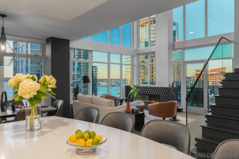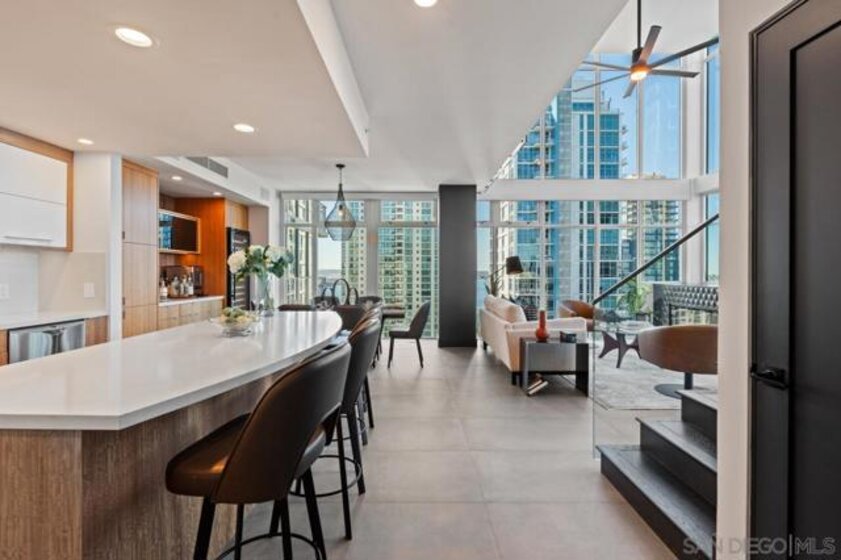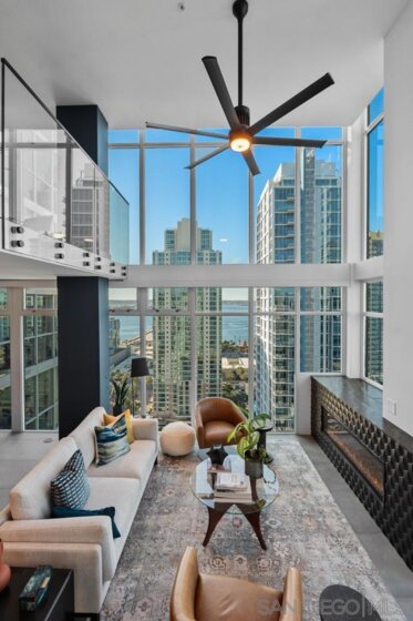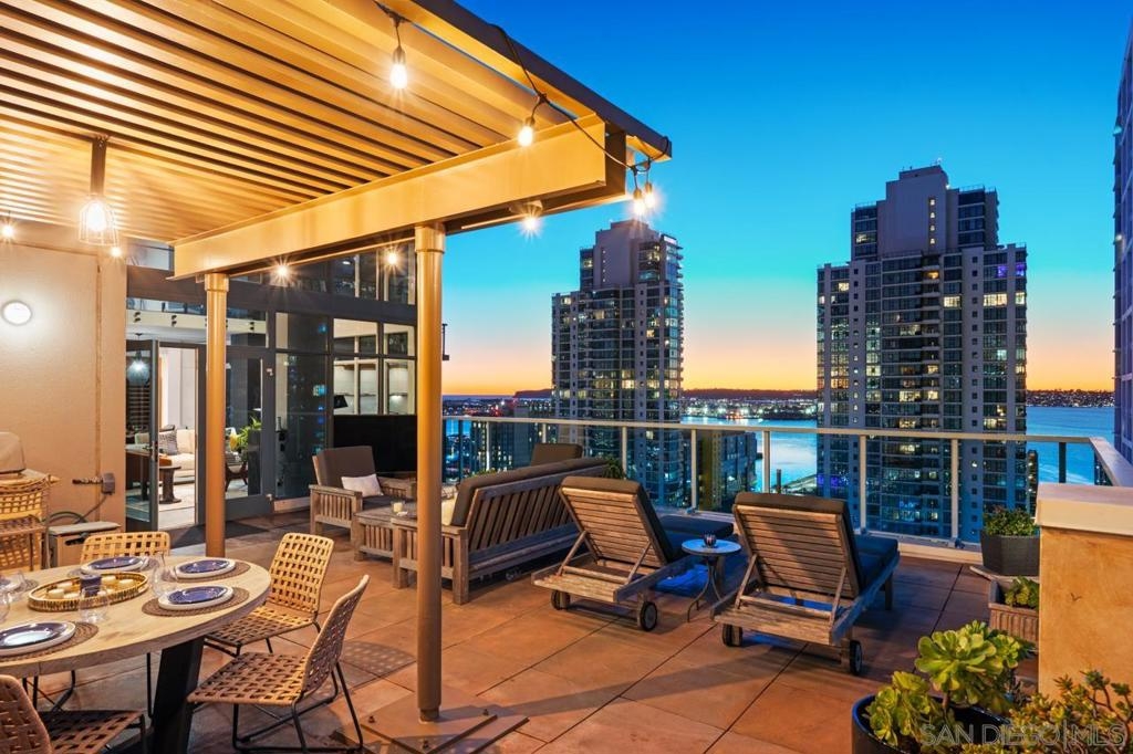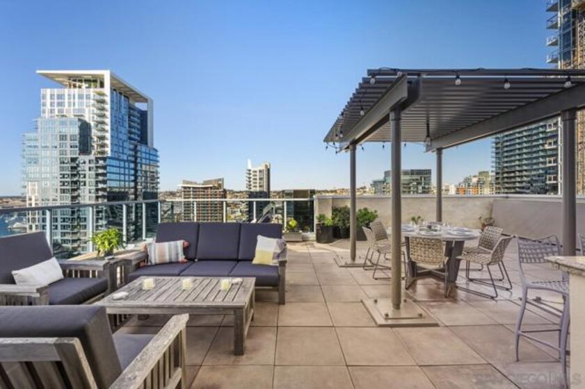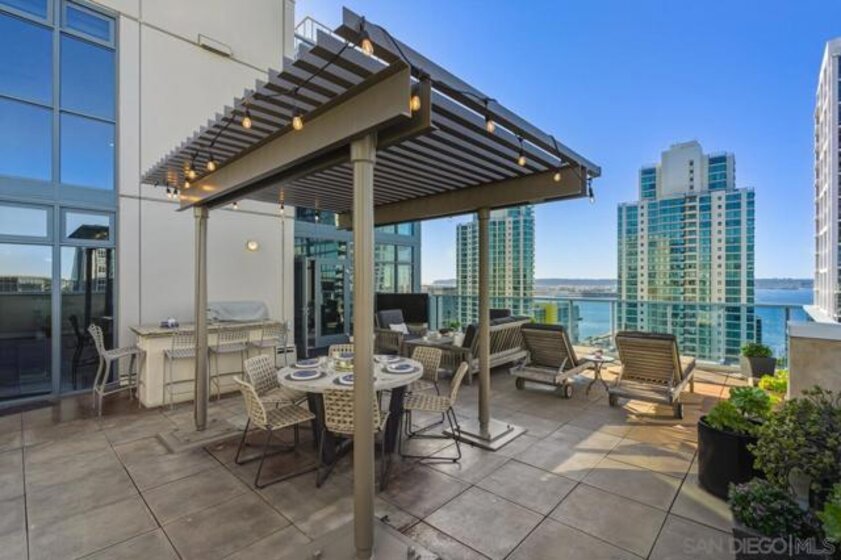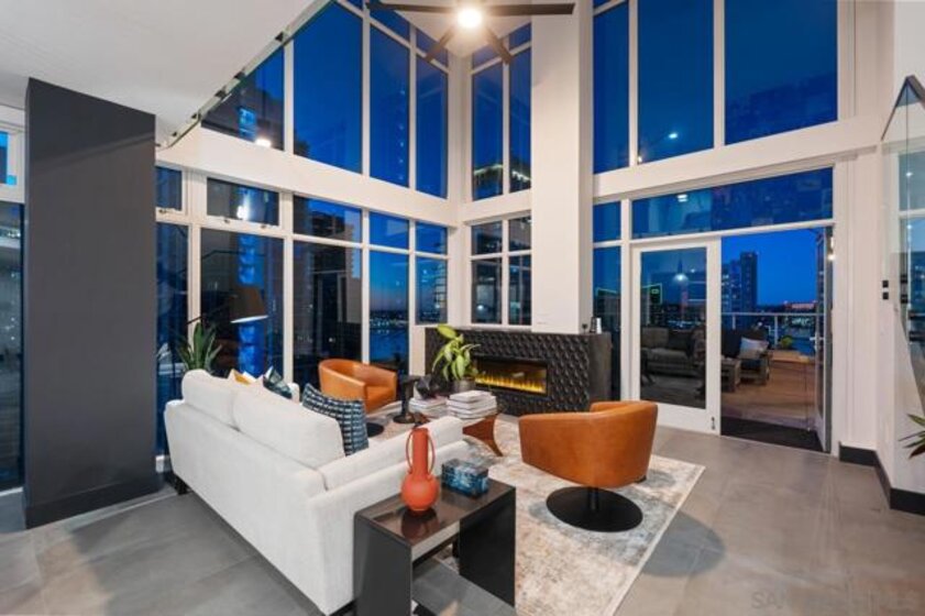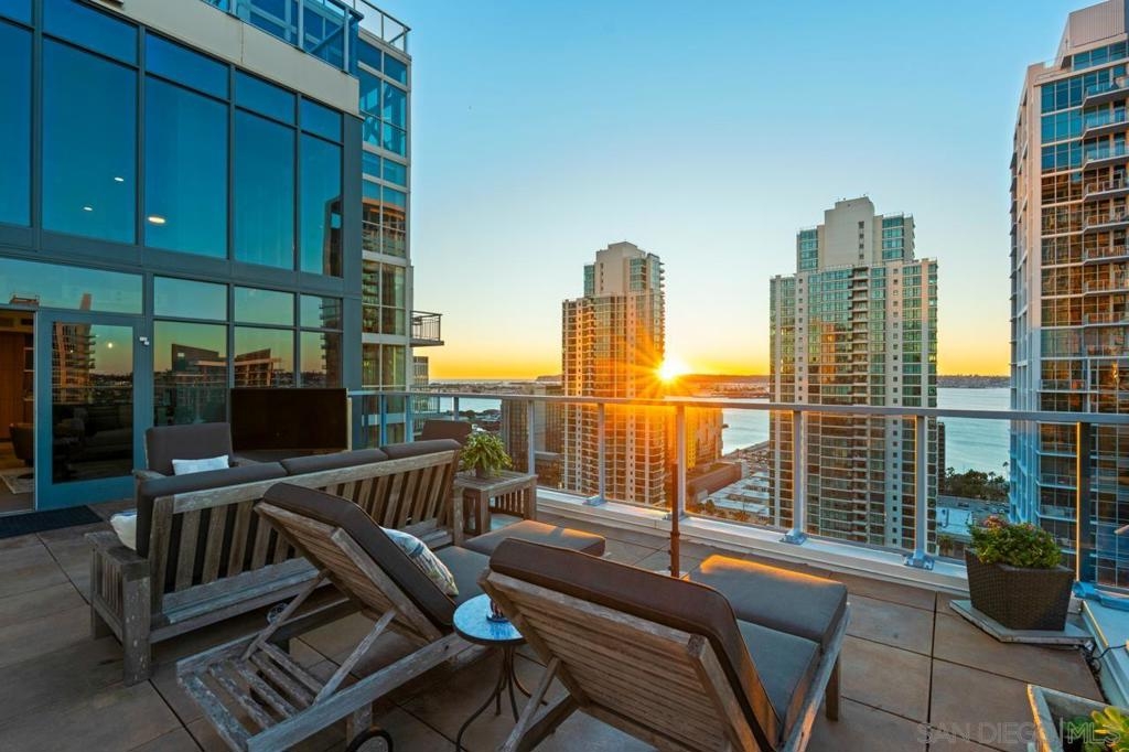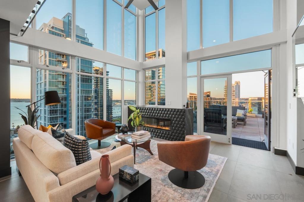 Range pricing: $2.4-$2.6. An extraordinary penthouse in the highly sought-after TREO building, which lies on the edge of Little Italy, offering one of the largest private patios in all of Downtown—more than 1,200 sq. ft.. Designed for elevated indoor-outdoor entertaining, the expansive terrace captures sweeping City and Bay views and breathtaking sunsets at every turn. In fact, the extraordinary views can be enjoyed from multiple rooms, with floor-to-ceiling windows to maximize light and those awesome city/bay views. Experience luxuriously appointed, state-of-the-art finishes, custom cabinetry, premium stone surfaces, designer lighting, and high-end appliances throughout. The open-concept layout is perfectly balanced with both private and intimate spaces, while a separate laundry room adds everyday convenience. Additional highlights include two dedicated parking spaces and a private storage unit. Every detail reflects meticulous craftsmanship, elevated materials, and refined design, creating a rare, sophisticated retreat in the heart of downtown. Just steps from Little Italy’s celebrated dining, waterfront promenade, and vibrant cultural attractions, this penthouse delivers an unparalleled urban lifestyle. Please read attached upgrade list and supplement. This residence has been thoughtfully enhanced and professionally redesigned from top to bottom with a comprehensive collection of high-end upgrades, blending innovation, comfort, and refined design throughout. The kitchen has been recently elevated for both performance and style, featuring a custom pantry with pull-out shelving, Fisher & Paykel dual-drawer dishwasher, JennAir built-in microwave drawer, Kraus oversized single-basin sink, Electrolux Icon five-burner gas range, and a double oven with convection and three adjustable racks. A Sub-Zero refrigerator with built-in ice maker anchors the space with timeless luxury. Adjacent dining and entertaining areas include a 196-bottle temperature-controlled wine cooler and a custom built-in bar, ideal for hosting at scale. The living area is centered around a Dimplex fireplace with a custom recessed television (included), paired with a statement ceiling fan controlled by remote. The primary bathroom has been newly curated with spa-level features, including Toto Washlet bidet system with remote controls, a Japanese soaking tub with massage jets, and an indulgent Mr. Steam shower with isteamX function, built-in speakers, and premium fixtures. Dual, side-by-side recessed medicine cabinets offer mirrored fronts with interior power outlets, complemented by motion-activated floor lighting for a seamless, elevated experience. Throughout the residence, enjoy remote-controlled window shades, Google Fiber internet, updated NextGen4 smart thermostats with 3 controls across three HVAC zones, offering both comfort and efficiency. A new stacked LG washer and dryer adds convenience, while all 3 bedrooms feature walk-in closets that provide generous, well-designed storage. Every enhancement has been artfully executed to deliver a luxurious, intuitive high-rise living experience—where technology, design, and comfort converge effortlessly.