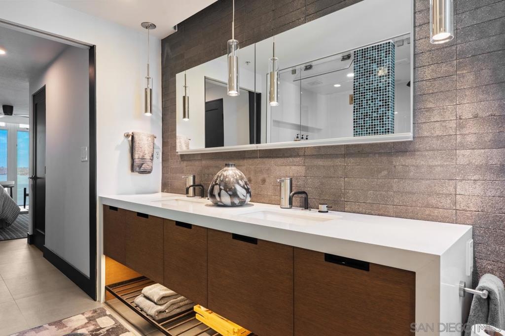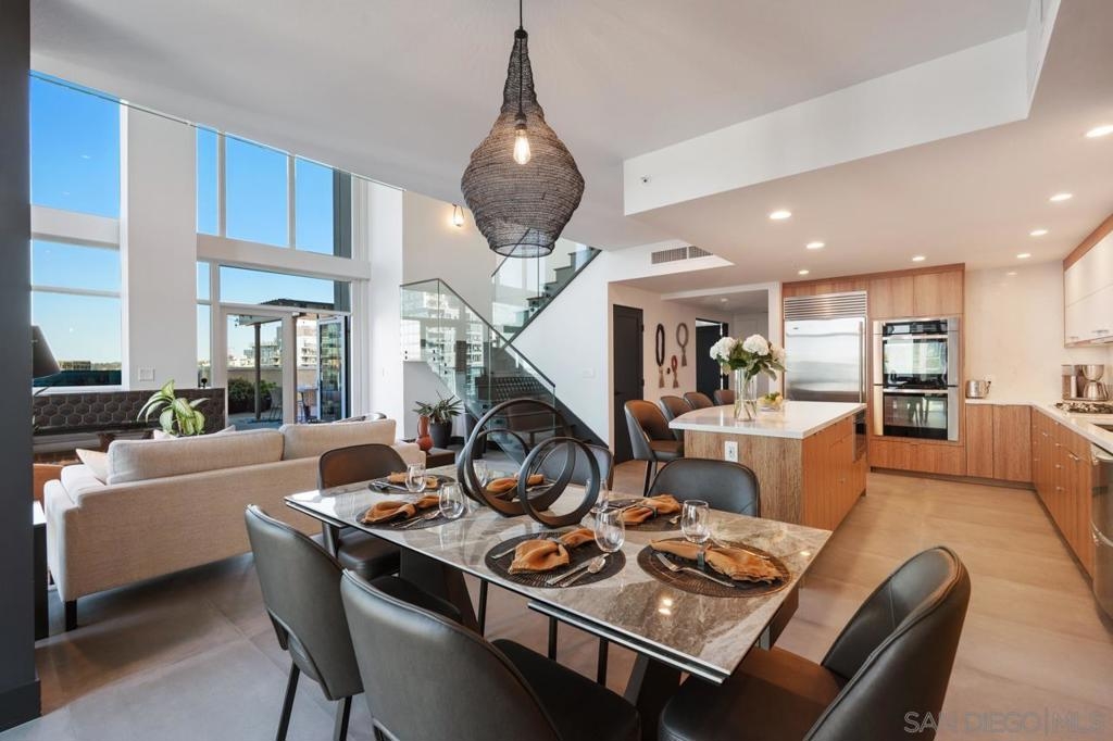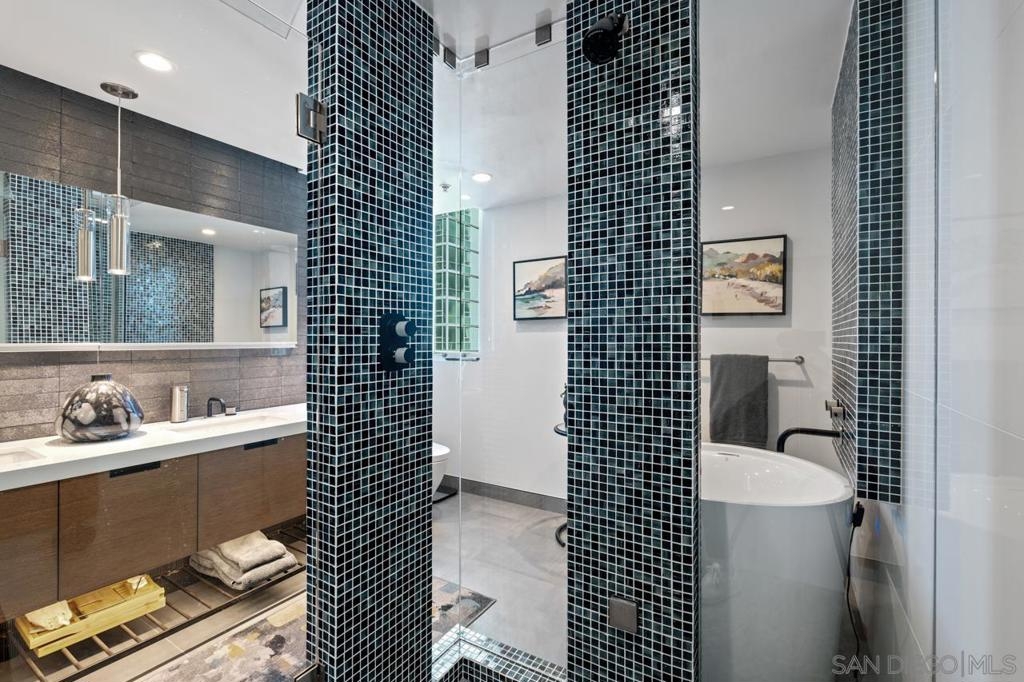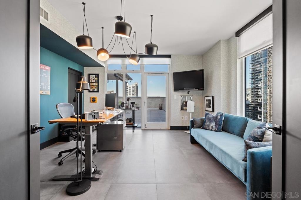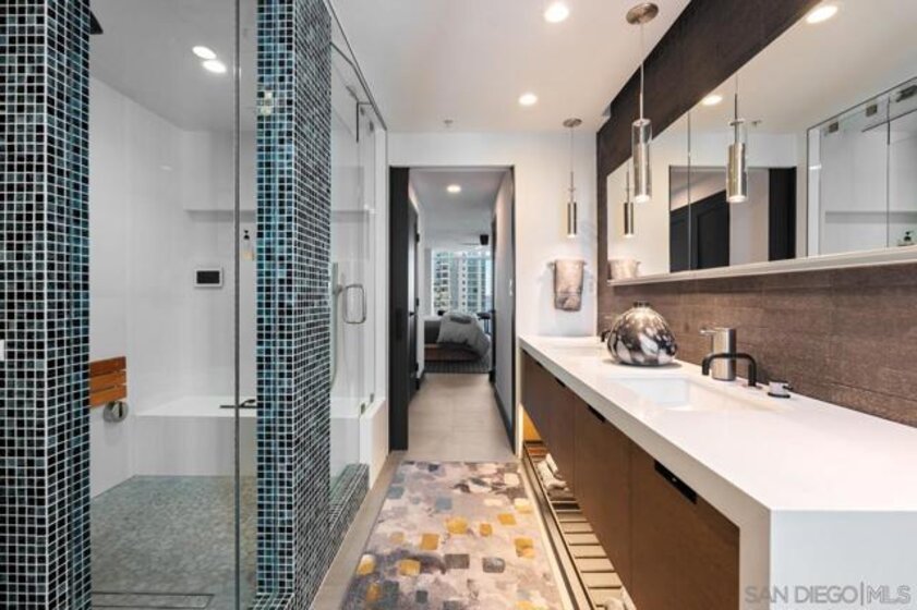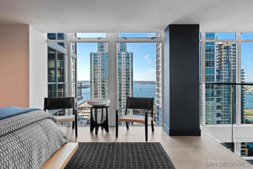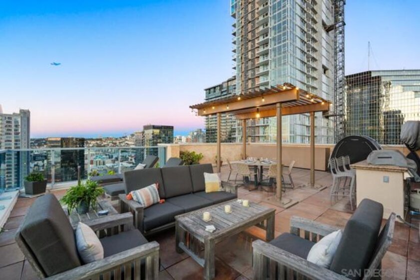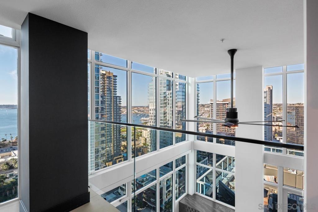 Range pricing: $2.4-$2.6. An extraordinary penthouse in the highly sought-after TREO building, which lies on the edge of Little Italy, offering one of the largest private patios in all of Downtown—more than 1,200 sq. ft.. Designed for elevated indoor-outdoor entertaining, the expansive terrace captures sweeping City and Bay views and breathtaking sunsets at every turn. In fact, the extraordinary views can be enjoyed from multiple rooms, with floor-to-ceiling windows to maximize light and those awesome city/bay views. Experience luxuriously appointed, state-of-the-art finishes, custom cabinetry, premium stone surfaces, designer lighting, and high-end appliances throughout. The open-concept layout is perfectly balanced with both private and intimate spaces, while a separate laundry room adds everyday convenience. Additional highlights include two dedicated parking spaces and a private storage unit. Every detail reflects meticulous craftsmanship, elevated materials, and refined design, creating a rare, sophisticated retreat in the heart of downtown. Just steps from Little Italy’s celebrated dining, waterfront promenade, and vibrant cultural attractions, this penthouse delivers an unparalleled urban lifestyle. Please read attached upgrade list and supplement. This residence has been thoughtfully enhanced and professionally redesigned from top to bottom with a comprehensive collection of high-end upgrades, blending innovation, comfort, and refined design throughout. The kitchen has been recently elevated for both performance and style, featuring a custom pantry with pull-out shelving, Fisher & Paykel dual-drawer dishwasher, JennAir built-in microwave drawer, Kraus oversized single-basin sink, Electrolux Icon five-burner gas range, and a double oven with convection and three adjustable racks. A Sub-Zero refrigerator with built-in ice maker anchors the space with timeless luxury. Adjacent dining and entertaining areas include a 196-bottle temperature-controlled wine cooler and a custom built-in bar, ideal for hosting at scale. The living area is centered around a Dimplex fireplace with a custom recessed television (included), paired with a statement ceiling fan controlled by remote. The primary bathroom has been newly curated with spa-level features, including Toto Washlet bidet system with remote controls, a Japanese soaking tub with massage jets, and an indulgent Mr. Steam shower with isteamX function, built-in speakers, and premium fixtures. Dual, side-by-side recessed medicine cabinets offer mirrored fronts with interior power outlets, complemented by motion-activated floor lighting for a seamless, elevated experience. Throughout the residence, enjoy remote-controlled window shades, Google Fiber internet, updated NextGen4 smart thermostats with 3 controls across three HVAC zones, offering both comfort and efficiency. A new stacked LG washer and dryer adds convenience, while all 3 bedrooms feature walk-in closets that provide generous, well-designed storage. Every enhancement has been artfully executed to deliver a luxurious, intuitive high-rise living experience—where technology, design, and comfort converge effortlessly.