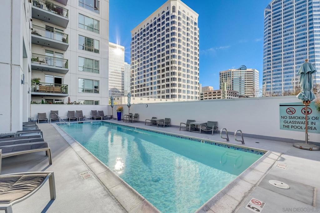 Location, Location, Location! This ideal Little Italy/Columbia District location allows you to enjoy all that Little Italy has to offer while offering a quieter neighborhood with easy access to the Harbor and Marina District. Light & bright, this one bedroom condo offers an open floor plan, fireplace, covered balcony accessed by both the living room and bedroom, well-equipped kitchen with ample cabinetry, counter space and stainless appliances, spacious bath, in-unit laundry and plenty of closet space - all of this at a great price and the perfect opportunity to create your own space! TREO is a well maintained community with low HOA dues and offers a pool, spa, fitness center, community room, BBQs, concierge, & 24-hour security. Walk to shops, restaurants, Santa Fe Train Depot, waterfront and so much more! Minutes to the airport, Balboa Park and Beach Communities!