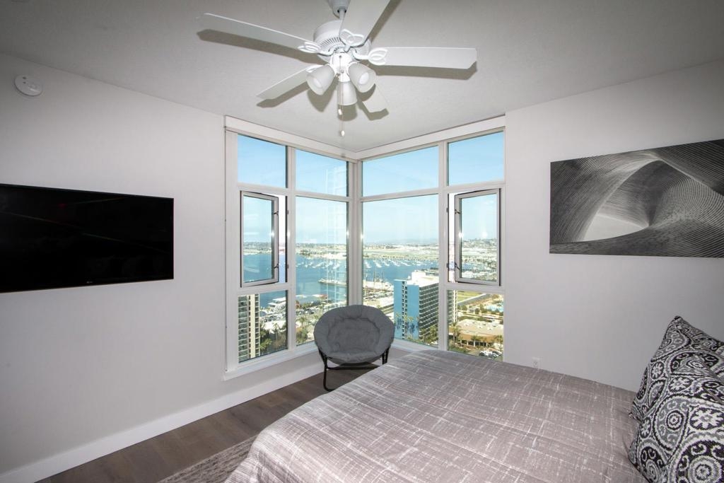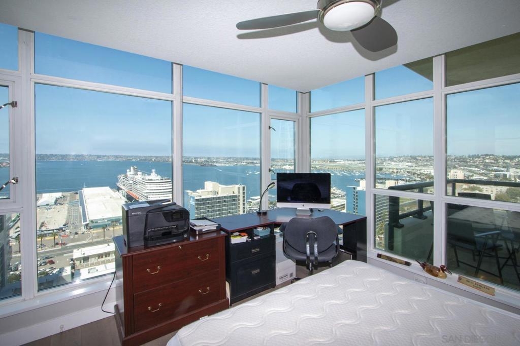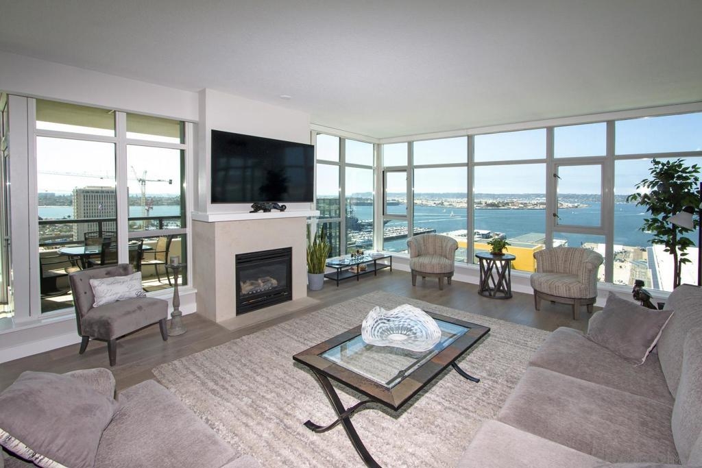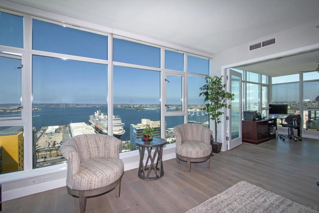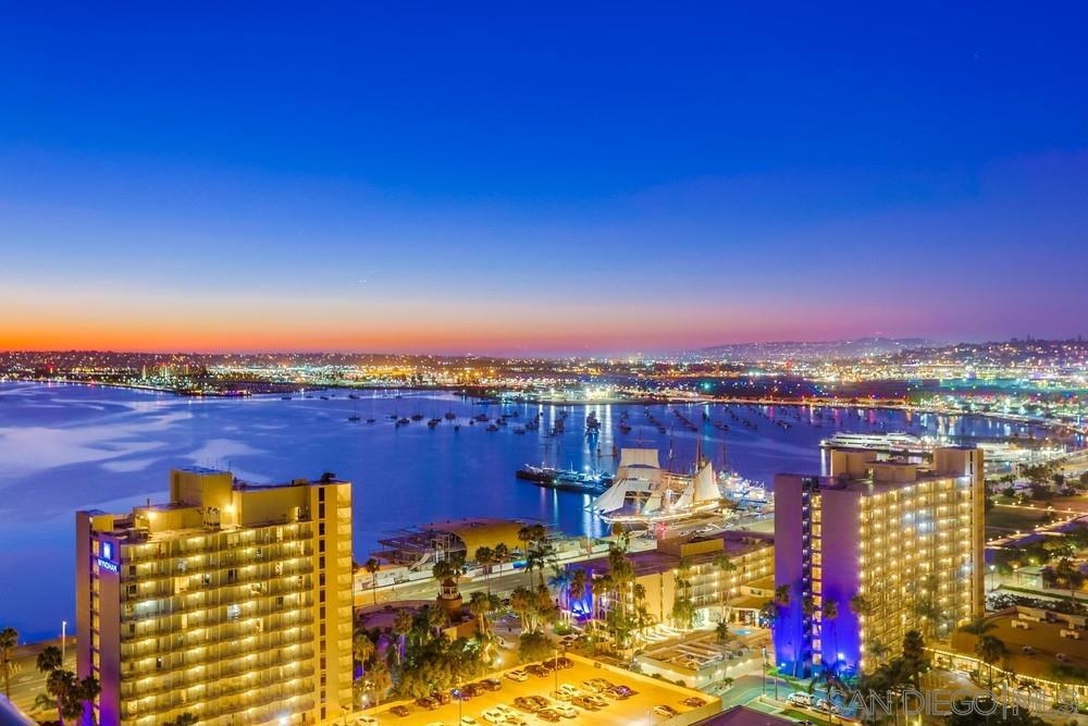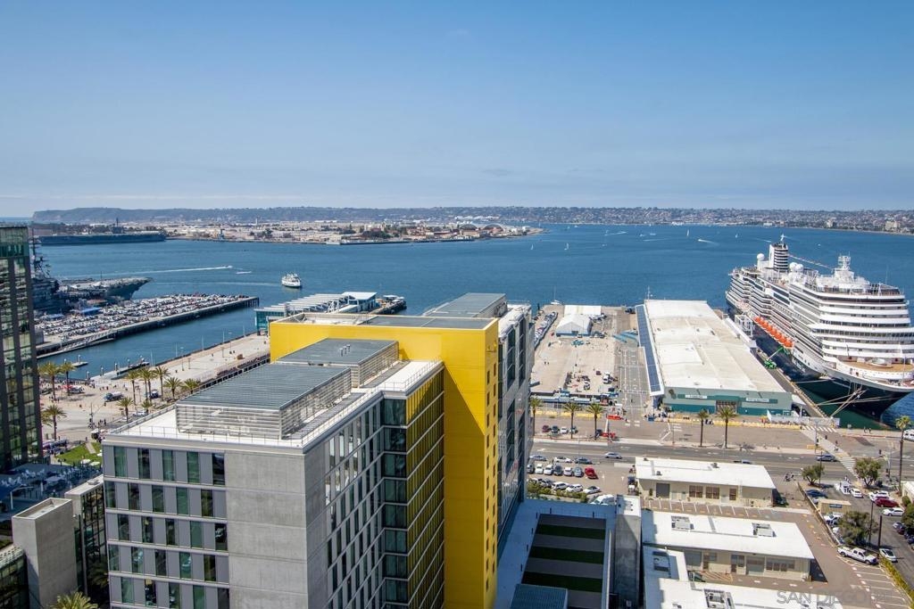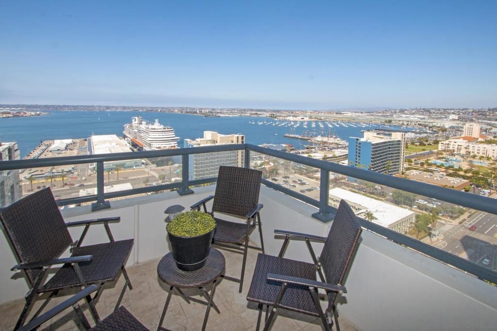 Stunning, stylish, fully furnished, exquisite 2022 remodel, move-in ready. Sweeping 180 degree panoramic Pacific Ocean views from La Jolla to Mexico from this spectacular 23rd floor downtown waterfront condo overlooking cruise ships, sailboats, marine traffic and gorgeous sunsets from the premier location on San Diego Bay. The most sought after 3 bedroom floor plan on the Front Porch of Millionaire's Row. Tasteful interior furnishings. Totally remodeled kitchen, dining room, living room, bedrooms, bathrooms & flooring. Floor to ceiling views from most every window + two balconies for wonderful entertaining. Includes Webpass internet and Amazon Fire Stick streaming services to three TVs. Turn key beautiful remodel! Remodeled light and bright kitchen with new countertops, S/S sink, single handle faucet fixture, reverse osmosis water filtration system and backsplash; new triple paned windows, LED lights throughout, new ceiling fans, new bathroom vanities, countertops, toilets, shower and wood vinyl flooring; and newly painted condo with color coordinated designer paints. Like new GE washer and dryer. Upgraded double hanging rods and double shelves in closets for additional hanging and stacking clothing. Separate Living Room and Master Bedroom patios (totaling 300 square feet) overlooking San Diego Bay. Two prime side by side parking spaces (each 9'x18') assigned to this unit on the premier P1 parking level plus a large private assigned 7ft x 4 ft x 8ft deep chain link storage unit (224 cu. ft.) in the fob locked storage room close by on the premier P1 level in the gated, underground parking area. The Grande South at Santa Fe Place combines exceptional architecture, extraordinary views, spacious landscaped gardens, private tree lined courtyards, visitor’s suite with parking to accommodate guests & family, and total comfort to its owners. Like no other. Located in downtown San Diego’s premier Columbia District, it rises 39 stories high with 221 residences directly above and the front door to San Diego Bay, providing spectacular 270 degree views of the Pacific Ocean and downtown San Diego Skyline. For those owners working from home, the front office/3rd bedroom adjacent to the living room has absolutely the most gorgeous setting over San Diego Bay and the Pacific ocean. The Grande South features all the luxuries of the finest resorts including 24 hour concierge service plus physical and closed circuit surveillance camera security, onsite professional property management, facilities director and building maintenance staff, 80 ft. outdoor swimming pool and spa, fully equipped fitness center, separate sauna and steam rooms with private men’s and women’s locker rooms with showers, central water conditioning system, window cleaning, 24 hour roaming attendant, water, electric fireplace, bicycle storage, huge meeting room and lounge area next to the newly designed lobby with full kitchen, entertainment and bar areas. Resident access only to all entrances and parking. Walking distance to international cruise ships, Little Italy, the Gaslamp District, Seaport Village, Waterfront Park, the Embarcadero, the USS Midway aircraft carrier museum, a multitude of shops and restaurants, the future Manchester Gateway project and much more. Five minutes to the San Diego Airport; PETCO Park, home of the San Diego Padres; Sea World and, of course, the famous San Diego Zoo. You have everything at your fingertips.