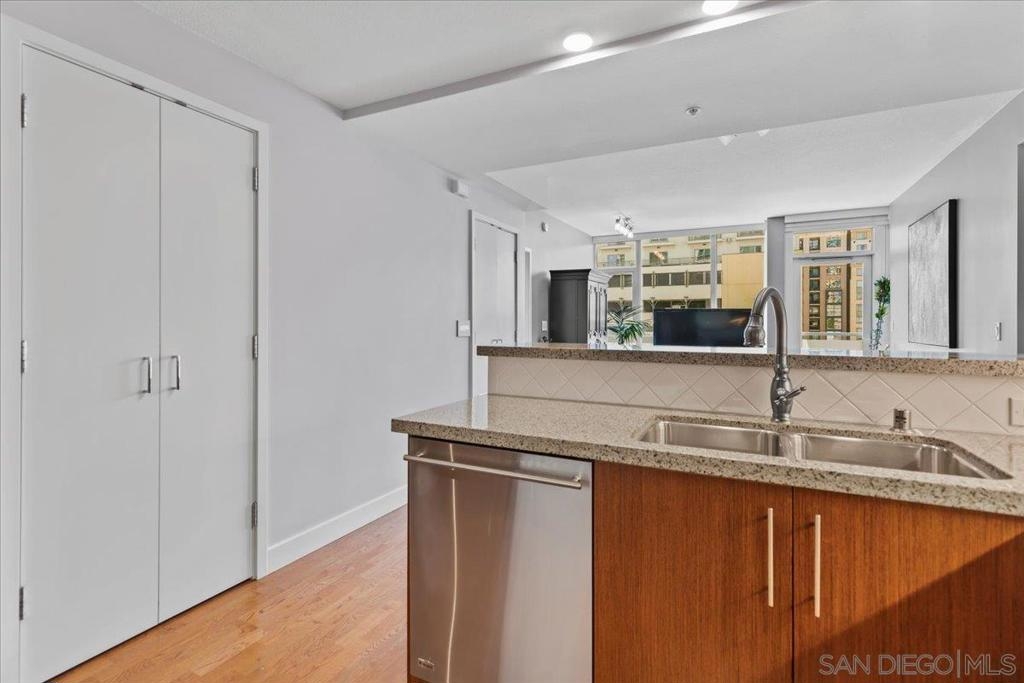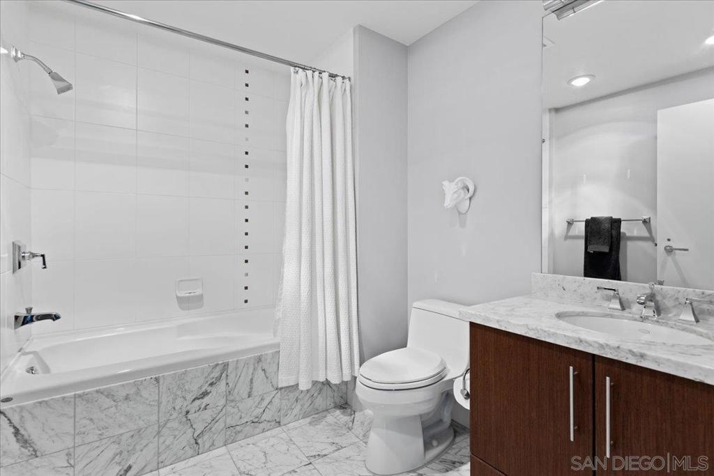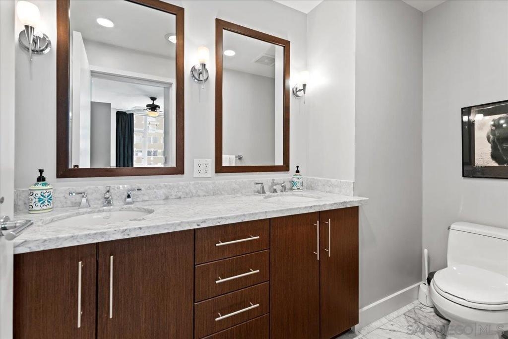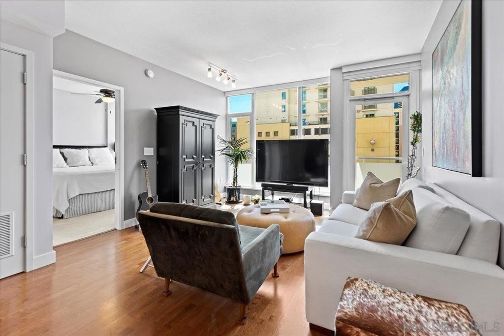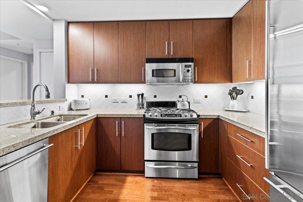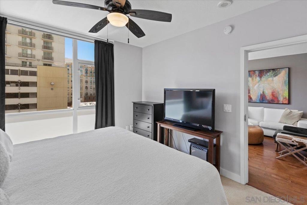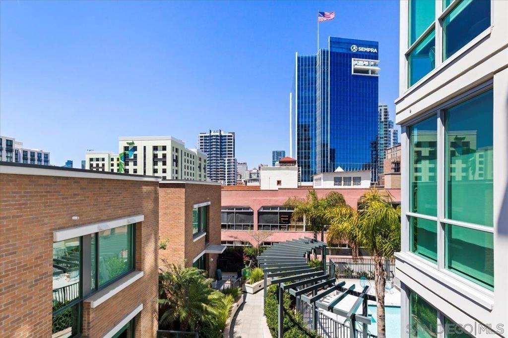 Stunning 2-bedroom, 2-bathroom residence in the coveted building of The Legend! This home boasts an airy and luminous floor plan with a spacious view balcony, featuring hardwood flooring, expansive floor-to-ceiling windows with custom shades, central air and heat, recessed lighting, and a kitchen adorned with granite countertops, designer cabinetry, tile backsplash, and stainless steel appliances. The primary suite offers dual vanity sinks, tile surround, and a walk-in closet. Secured parking and storage are included! The sought-after amenities in this community encompass security, a rooftop lounge with firepits, BBQ area, indoor kitchen, and panoramic views of the Ballpark and Gallagher Square. Additional amenities include a sparkling pool, spa, steam room, sauna, and fitness center. Enjoy a short stroll to top-rated restaurants, coffee shops, Petco Park and all the attractions of East Village! Near Balboa Park, beaches and easy freeway access. This property is a must-see!