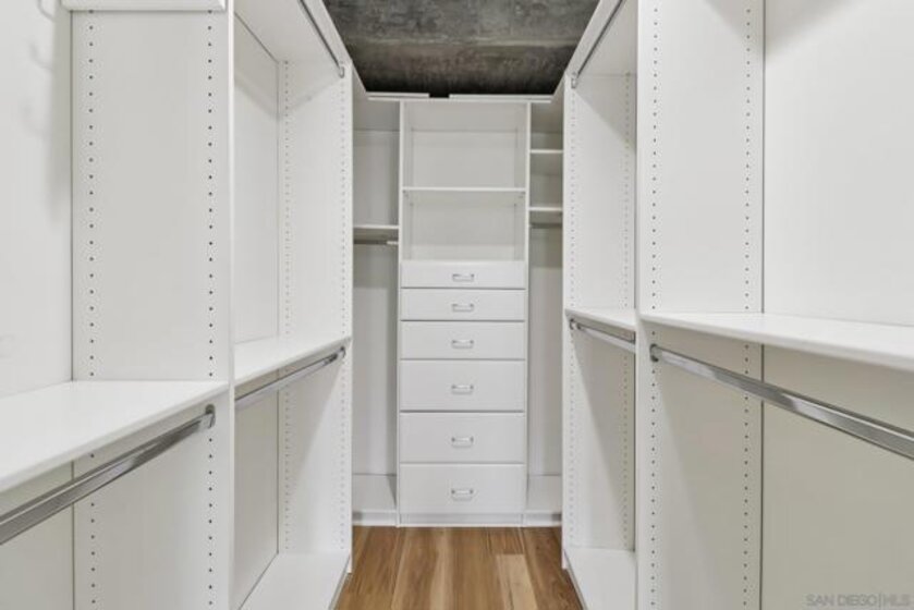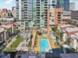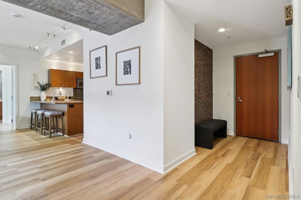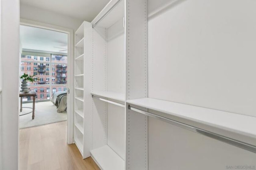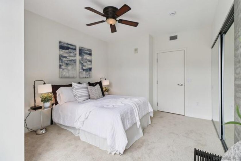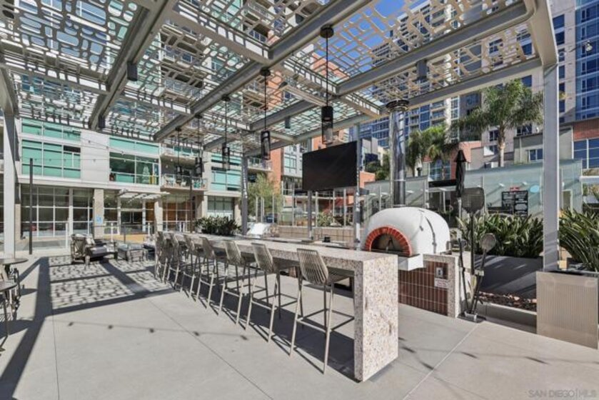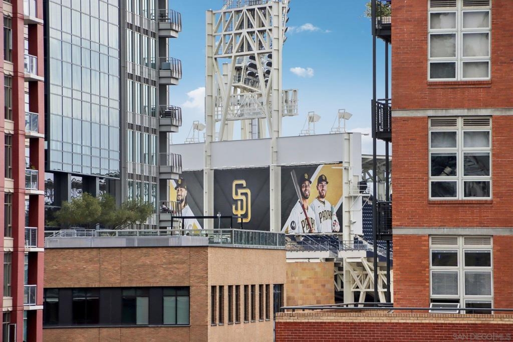 Experience elevated urban living at The Mark in Downtown San Diego’s vibrant East Village. This spacious 2-bedroom, 2-bath residence offers approximately 1,228 sq ft of thoughtfully designed living space, blending modern upgrades with striking architectural elements. An ideal split-bedroom floor plan ensures privacy, with both bedrooms and bathrooms offering generous space and comfort. Inside, an open-concept layout unfolds with floor-to-ceiling windows that flood the home with natural light and city vistas, along with expansive living and dining areas perfect for everyday living and entertaining. The kitchen is well-appointed with quality appliances, dual wine refrigerators, and ample storage, creating a functional and refined culinary space. Both bathrooms showcase distinctive custom rock wall accents, adding a bold, spa-inspired aesthetic, while the large walk-in closet with built-ins offers exceptional organization. Step outside to a private patio overlooking park-like grounds with pool and green space views—ideal for relaxing or hosting guests. Additional highlights include in-unit laundry, a dedicated storage locker, and two side-by-side parking spaces in a secure garage. Residents enjoy resort-style amenities including a pool and spa, fitness center, concierge service, and 24-hour security, all just moments from Petco Park and the Gaslamp Quarter.