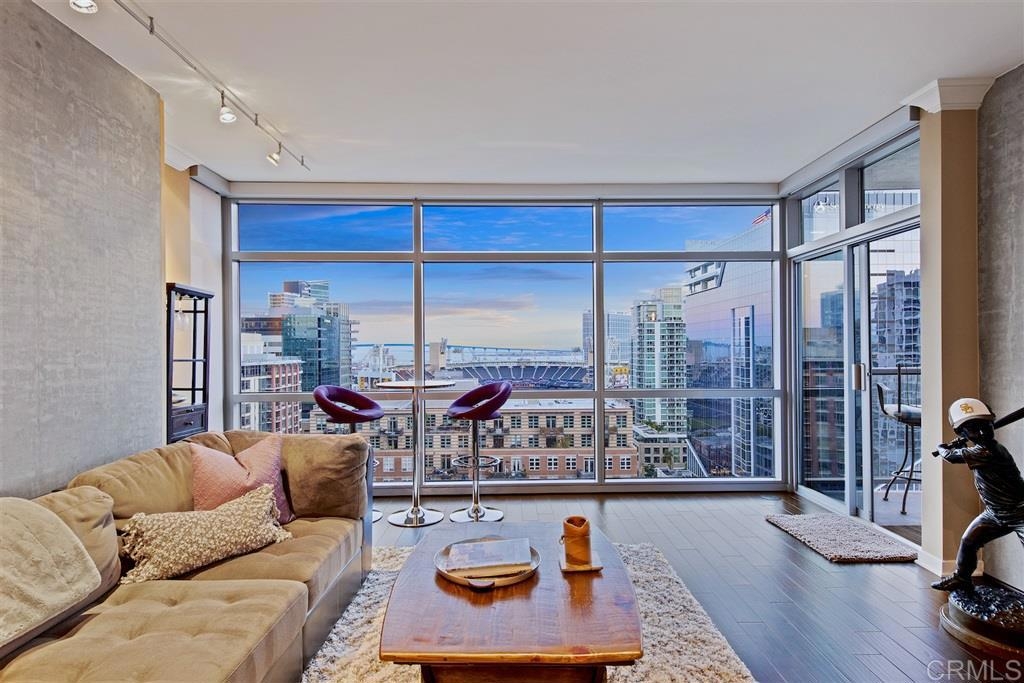 Chic & sophisticated best describe this gorgeous residence at The Mark. Stunning floor to ceiling views from every room capture the Coronado Bridge, Petco Park & sunsets over Pt Loma. Rich, espresso wood flooring, crown molding & "rock candy" track lighting are just a few of the designer upgrades. Master includes walk in closet, ensuite bath, marble countertops, step in shower & custom built ins. Private guest room features walk in closet, custom built in cabinetry & balcony access. See supplement. [Supplement]: The functional floor plan showcases 'split' bedrooms providing optimal privacy for guests or home office. Custom cabinetry and efficiently designed closet systems give way to ample in unit storage. Elegant European style cabinetry, granite slab counter-tops & stainless GE appliances complement the gourmet kitchen. Recent upgrades include espresso engineered flooring throughout; new master bathroom tile flooring, crown molding, custom overhead lighting in living room with decorative 'rock candy' fixtures. Two conveniently located separate (non-tandem) parking spaces and generous storage unit are included. The Mark is recognized as one of Downtown San Diego's premiere luxury communities. The exquisite outdoor common area spaces provide residents many opportunities to embrace San Diego's temperate climate. Relax at the 55' lap pool w/sundeck & hydrotherapy spa. To maintain a healthy lifestyle don't miss a work out at the on site gym. The serene park-like outdoor area is equipped with BBQ stations. Full time lobby concierge and security are onsite to assist residents and their guests.