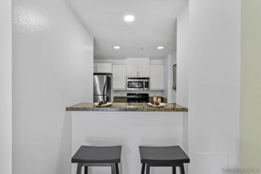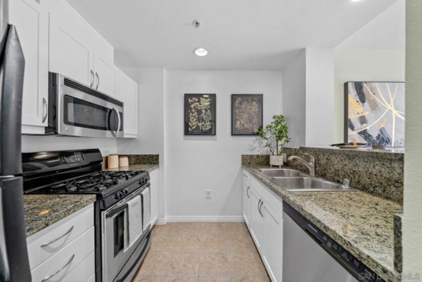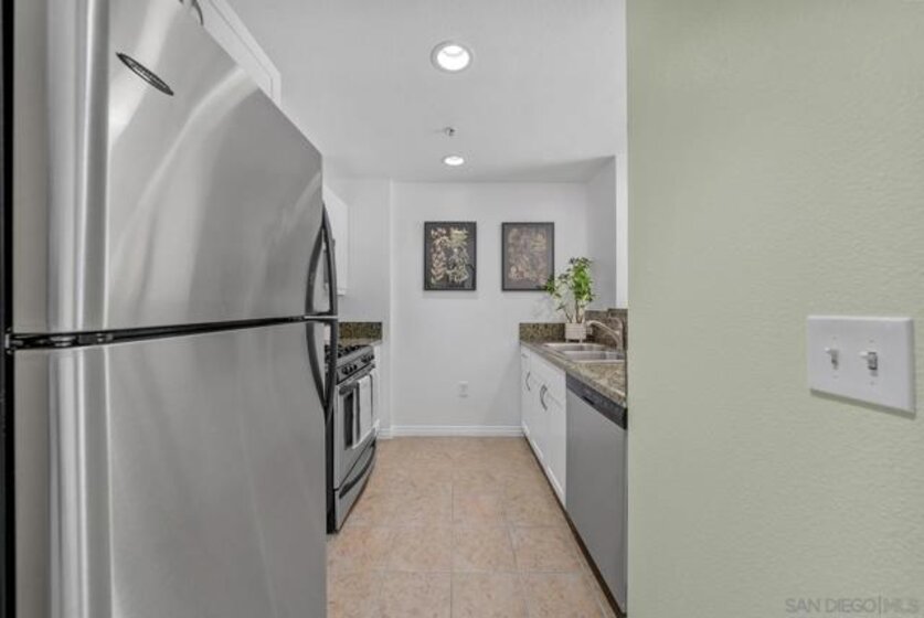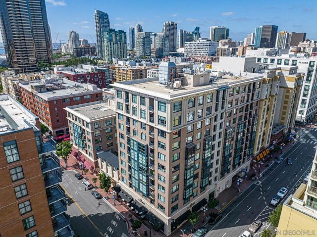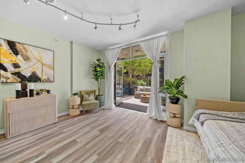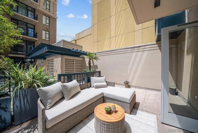 Welcome to your new home in the vibrant and historic Gaslamp Quarter of Downtown San Diego! Enjoy the vibrant urban lifestyle with everything you need just steps away. Petco Park is only one block away, making this an ideal spot for sports enthusiasts. The light and bright condo features a huge, oversized private patio that faces a quiet courtyard, perfect for entertaining guests or enjoying a peaceful evening outdoors. French doors from the living area open directly onto the patio, enhancing and expanding the living space. The kitchen is designed for those who love to cook, featuring gas cooking and stainless steel appliances. It includes a refrigerator, ensuring you have everything you need to prepare delicious meals at home. In-unit washer and dryer are included, adding to the convenience of urban living. The home comes with one assigned parking space conveniently located across from elevator lobby, a valuable asset in the busy downtown area.