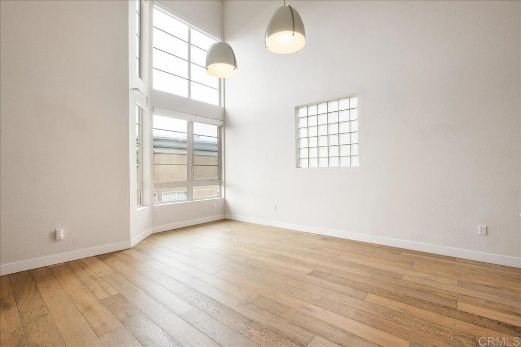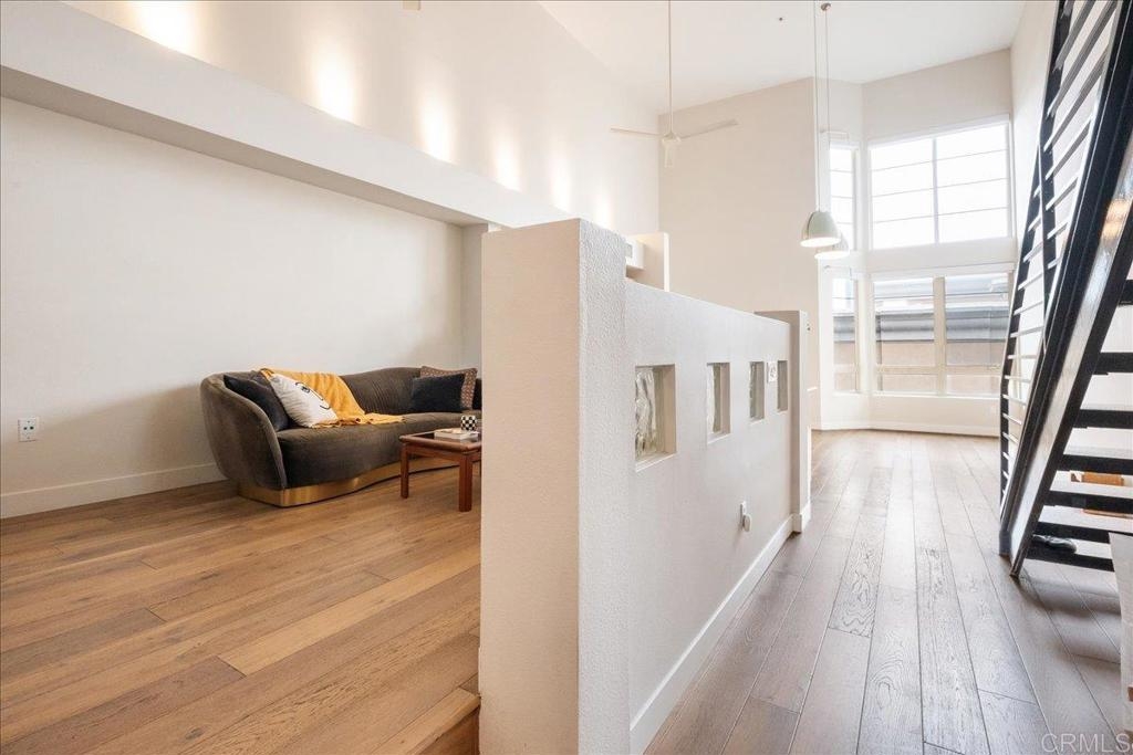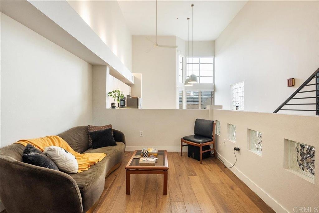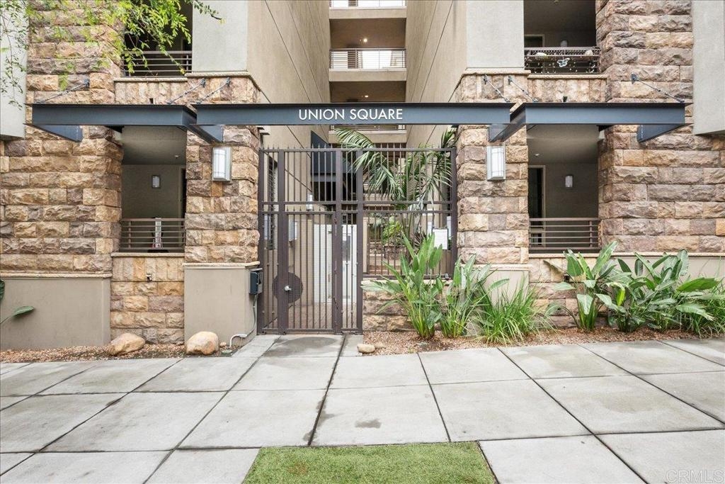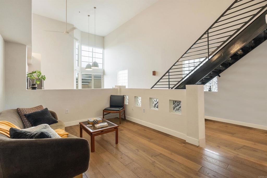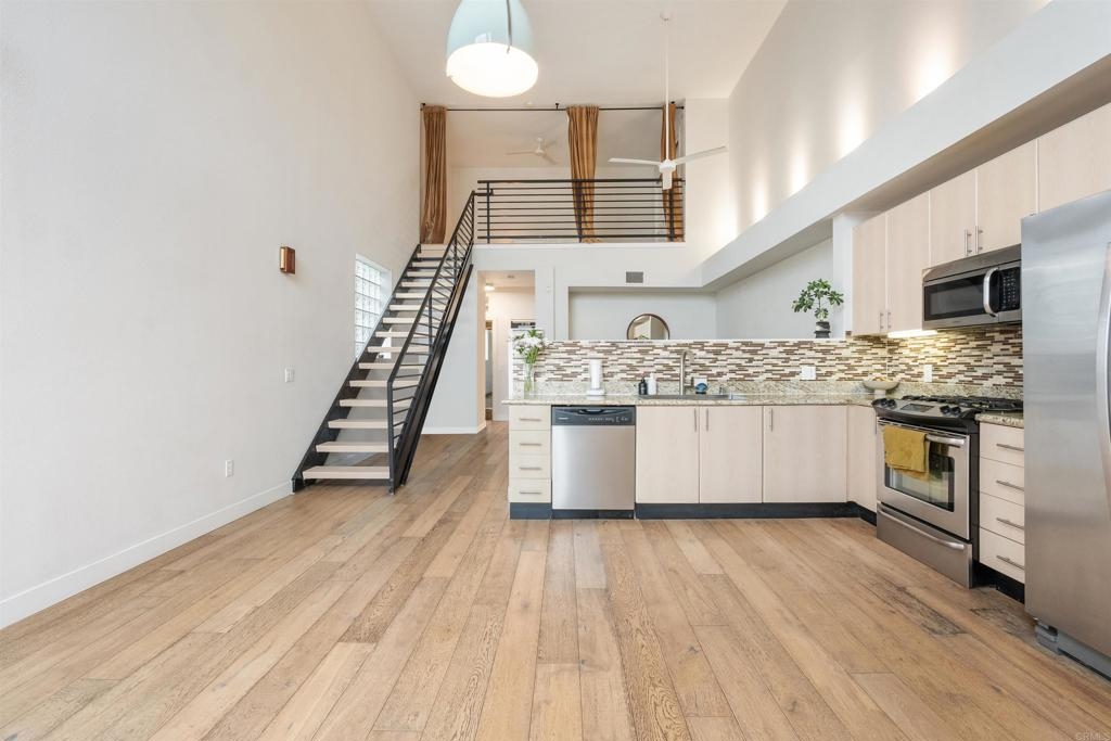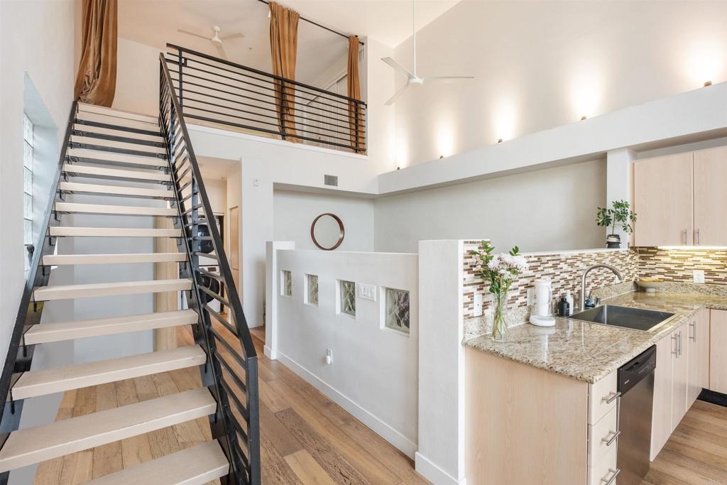 Located in highly sought-after Union Square, this top-floor, 2-story loft is a unique 1-bedroom + den end-unit that offers a modern and secure living experience. The main living area features a gorgeous updated kitchen, a den and an open floorplan that seamlessly integrates soaring high ceilings and beautiful custom light fixtures. Upstairs, you'll find a spacious bedroom, adding privacy and comfort to your living space. This unit is equipped with smart home features, including automated window blinds, a Nest system for temperature control and security camera, and a Yale smart door lock. Upgraded modern ceiling fans, engineered hardwood floors, and 2 glass block windows that bring in a ton of natural light enhance the overall ambiance of this stylish home. For your convenience, the condo includes an in-unit washer and dryer, and 1 assigned underground parking spot. Union Square offers exceptional amenities such as a fitness center, indoor spa, rec room, bike storage, guest parking, and electric car charging stations. Situated in Downtown's rapidly growing East Village neighborhood, you'll have easy access to the 5, 94, and Hwy 163, as well as endless entertainment options, including nearby upscale restaurants, bars, Petco Park and more. Just a few blocks away from the new East Village Green Park project, this condo is perfectly positioned for those looking to invest before property values rise. Don’t miss out on the opportunity to own this stunning loft and experience the vibrant lifestyle of East Village.