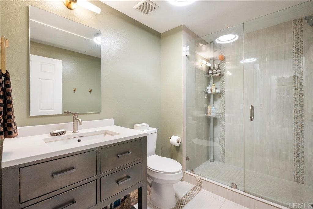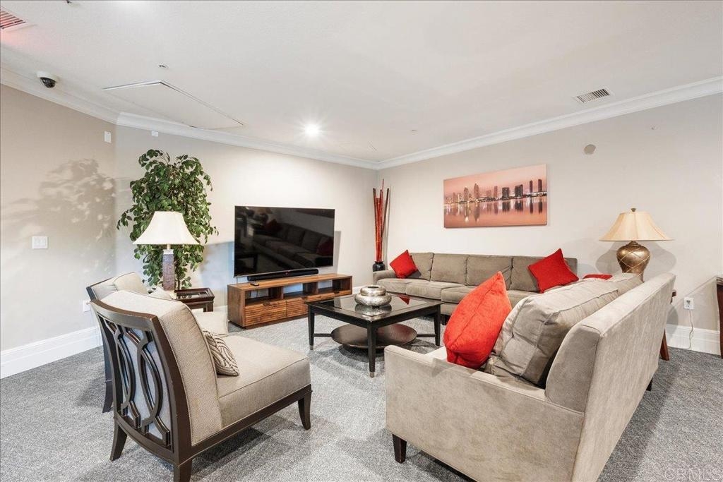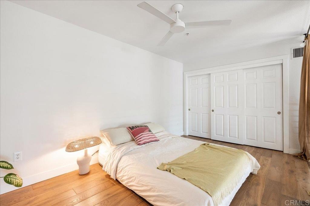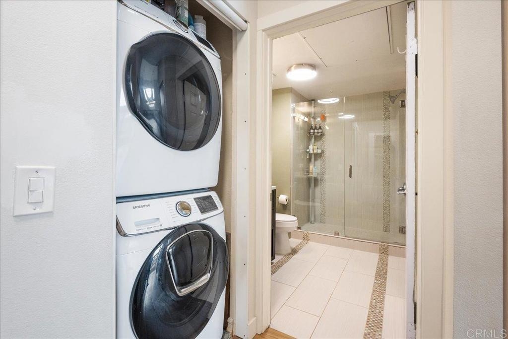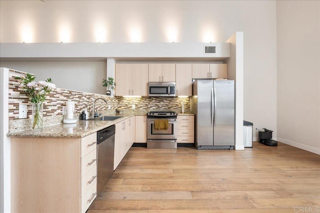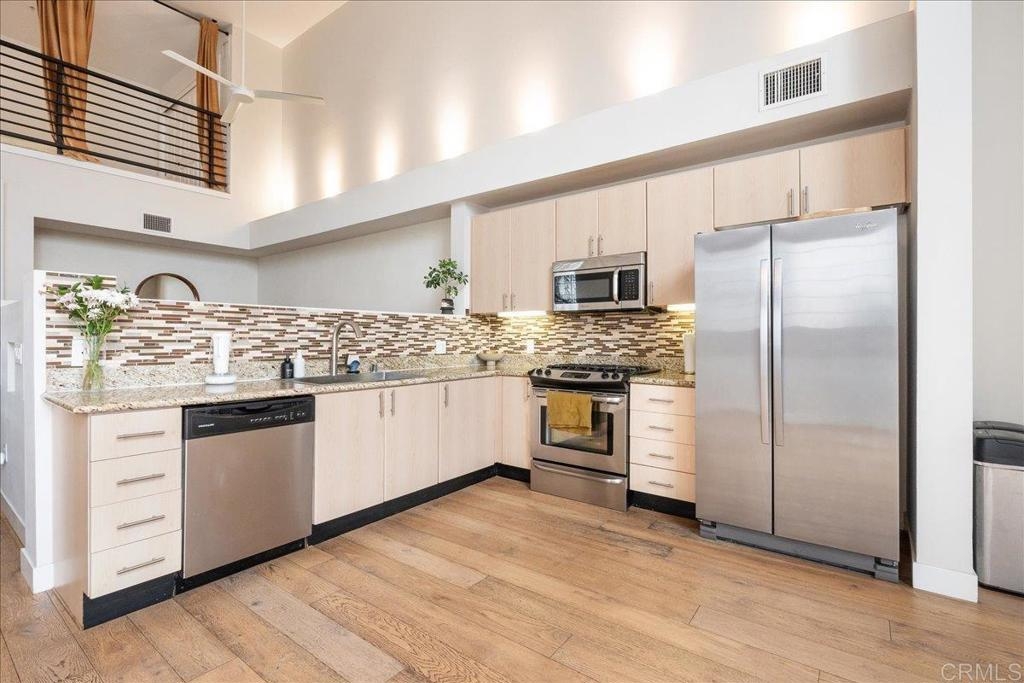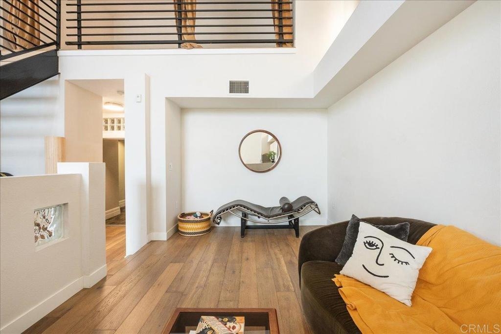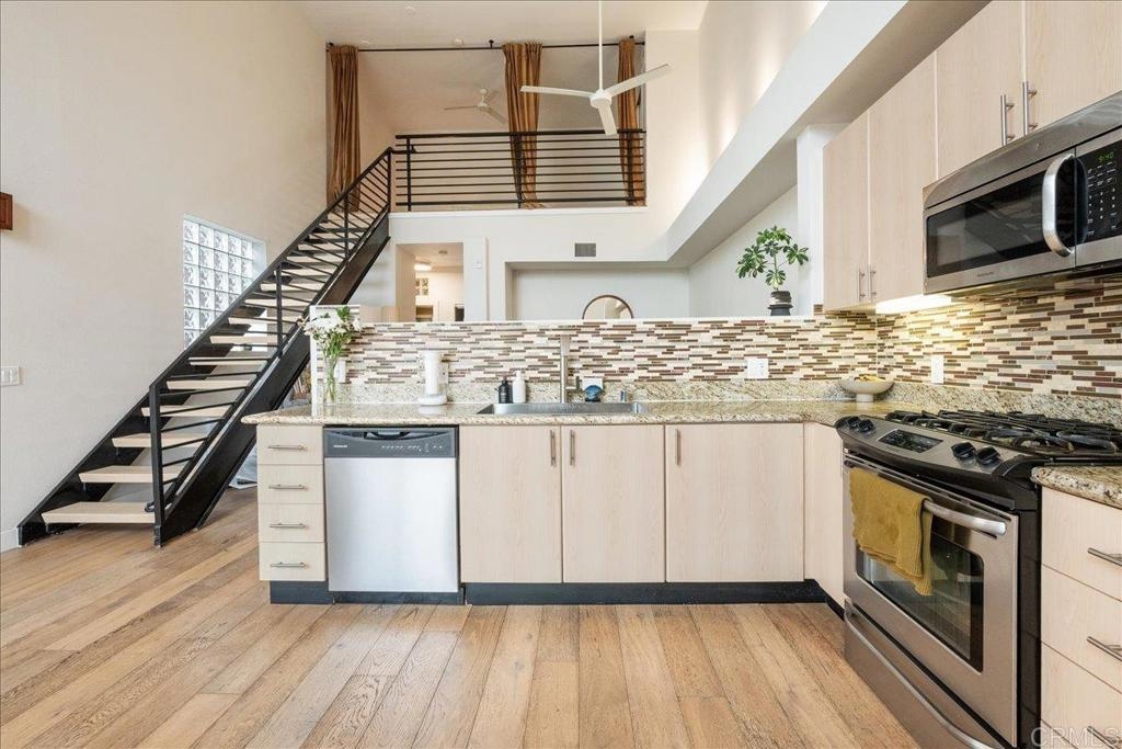 Located in highly sought-after Union Square, this top-floor, 2-story loft is a unique 1-bedroom + den end-unit that offers a modern and secure living experience. The main living area features a gorgeous updated kitchen, a den and an open floorplan that seamlessly integrates soaring high ceilings and beautiful custom light fixtures. Upstairs, you'll find a spacious bedroom, adding privacy and comfort to your living space. This unit is equipped with smart home features, including automated window blinds, a Nest system for temperature control and security camera, and a Yale smart door lock. Upgraded modern ceiling fans, engineered hardwood floors, and 2 glass block windows that bring in a ton of natural light enhance the overall ambiance of this stylish home. For your convenience, the condo includes an in-unit washer and dryer, and 1 assigned underground parking spot. Union Square offers exceptional amenities such as a fitness center, indoor spa, rec room, bike storage, guest parking, and electric car charging stations. Situated in Downtown's rapidly growing East Village neighborhood, you'll have easy access to the 5, 94, and Hwy 163, as well as endless entertainment options, including nearby upscale restaurants, bars, Petco Park and more. Just a few blocks away from the new East Village Green Park project, this condo is perfectly positioned for those looking to invest before property values rise. Don’t miss out on the opportunity to own this stunning loft and experience the vibrant lifestyle of East Village.