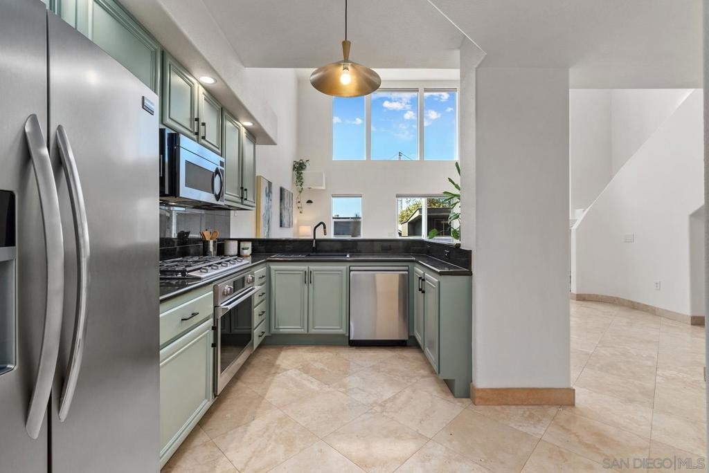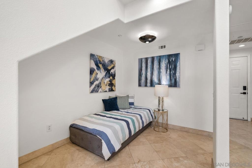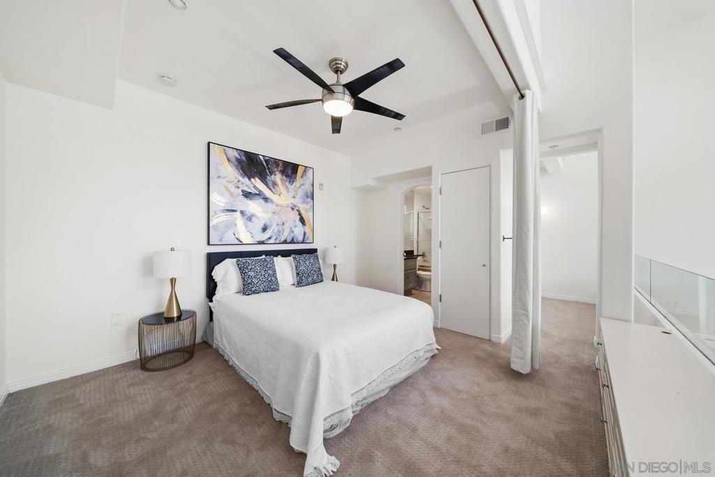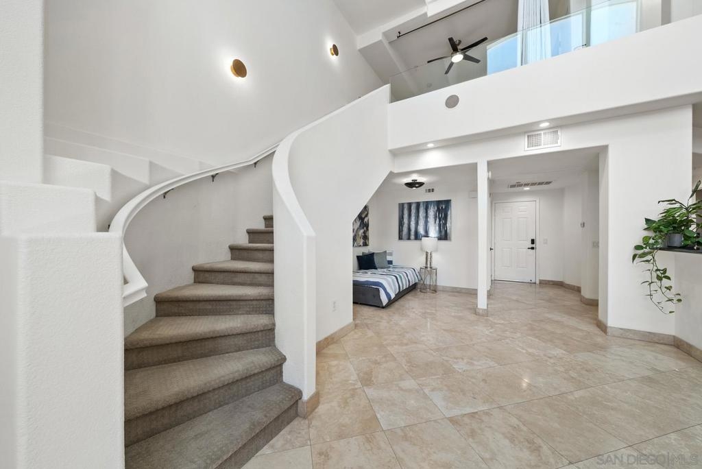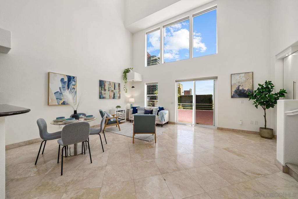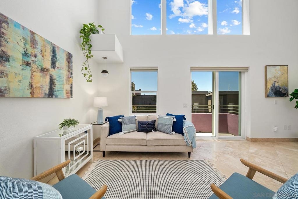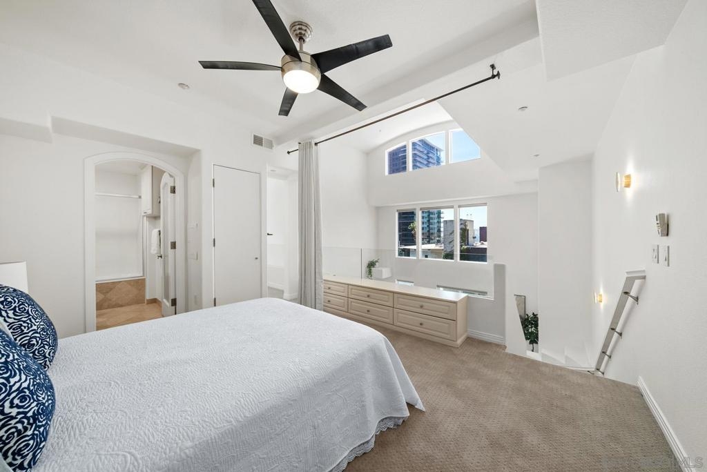 This one-of-a-kind top floor, two-story loft with towering 27ft (Yes 27!) ceilings is located in the heart of Little Italy overlooking India St. From this ideal location, you can eat, drink and live all that San Diego's best neighborhood has to offer! Within 3 blocks of the San Diego Bay, Waterfront Park, Little Italy Farmer's Market, and many coffee shops, local breweries & restaurants including Isola, Queenstown, Craft & Commerce, Lofty Coffee, Princess Pub, Morning Glory to name a few. The kitchen features freshly painted wood cabinetry, granite counter tops, Ruvati sink, Brizo faucet, figidaire gallery fridge, and a 6 burner stove. This voluminous loft features cb2 lighting, electric window shades, travertine flooring and fresh comfy carpet upstairs. There is an open bedroom with full bath upstairs + den/office and 2nd full bath conveniently located downstairs for guests. 1 underground parking space and storage cabinet. VillageWalk condos features a lush courtyard with waterfall, large fitness center and community room for social events.