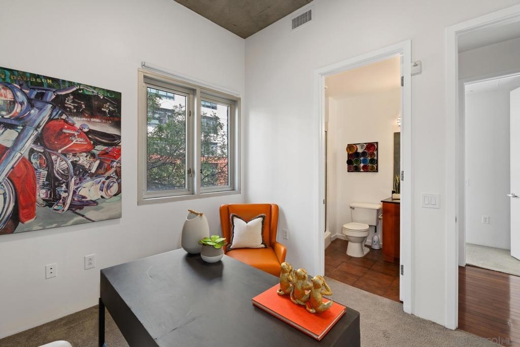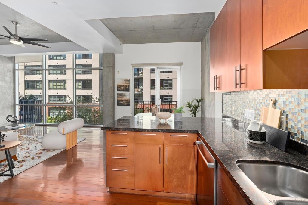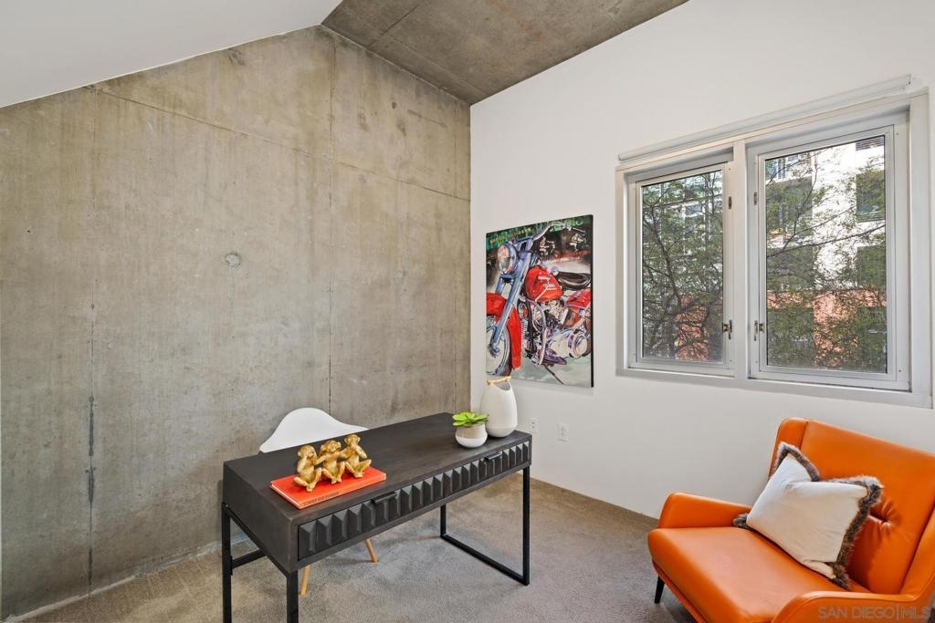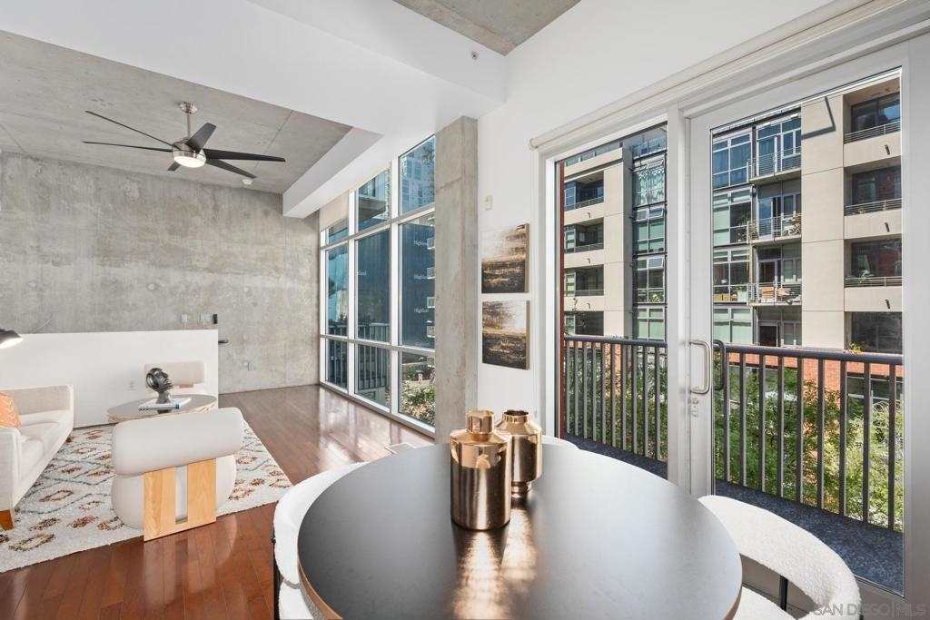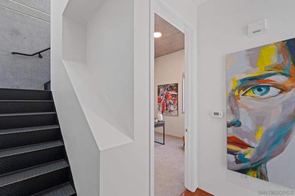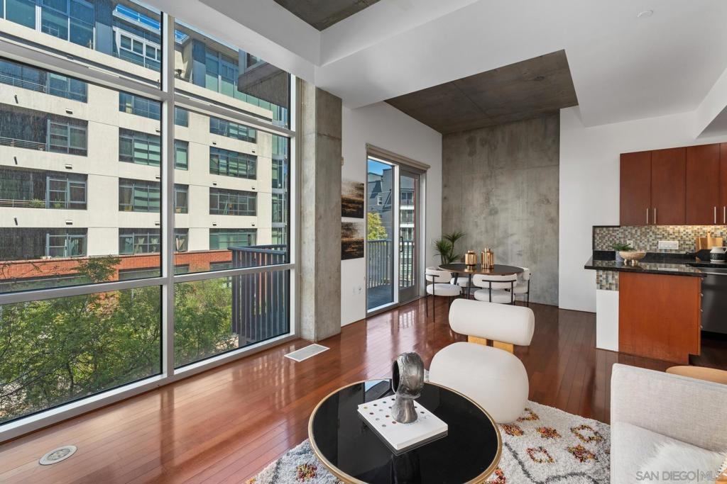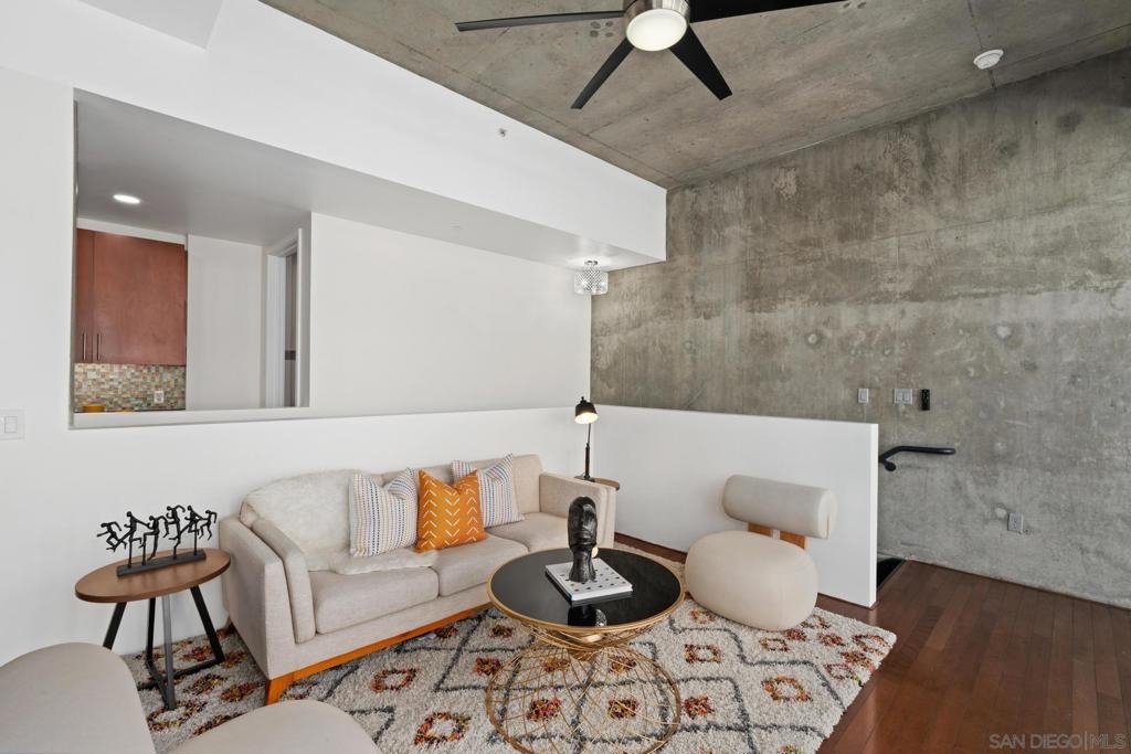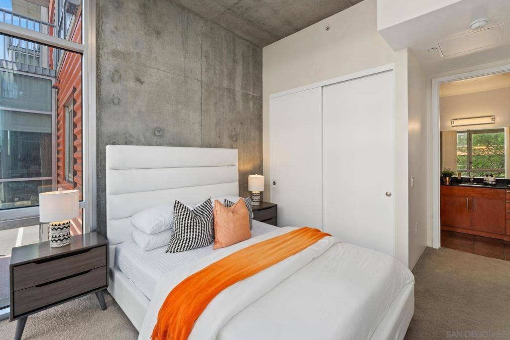 Urban Living at Fahrenheit in Downtown San Diego. This modern 2 story East Village Loft offers a unique blend of style and functionality, boasting 1060 sqft of contemporary living space. The loft features a trendy open floor plan upstairs, with dual masters downstairs. Complemented by “loft like” floor to ceiling windows that flood the space with natural light, the sleek design includes striking cement accents, high 11’ ceilings, and custom glass tile mosaic kitchen backsplash and counter accents. The utility room off of the kitchen provides extra storage and easy laundry access. 1 parking space is assigned and secure off the street. Fahrenheit is one of Downtown San Diego's most notable condo buildings and a recipient of a prestigious design award from the American Institute of Architects. It's central location is just 2 blocks from PetCo Park, and a short walk to the Bayfront, Gaslamp Quarter and Little Italy. It has one of the lowest monthly HOA fees in the East Village.