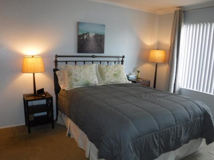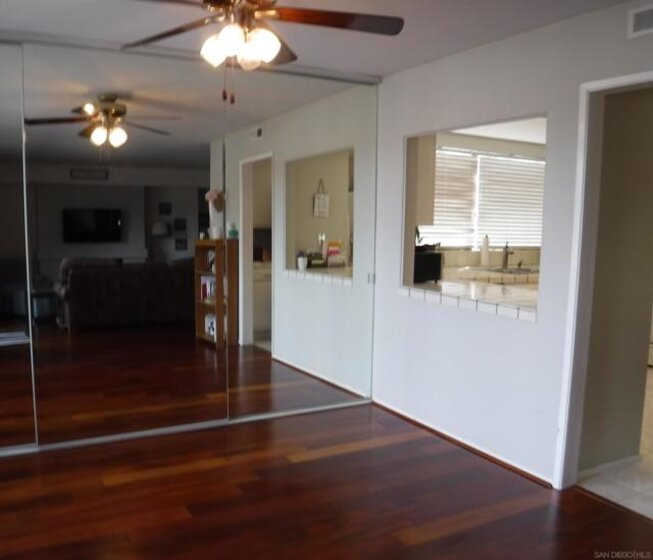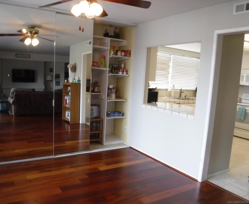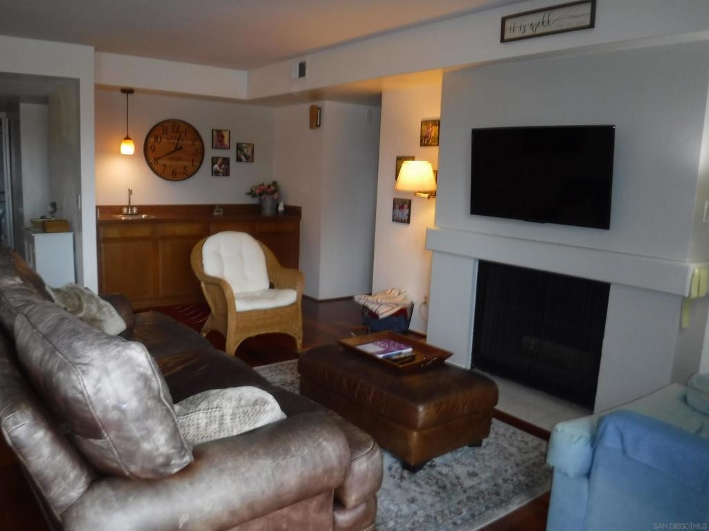 **RARE Opportunity**Last sale in this complex was in January 2025. No age restrictions. Hardwood floors in the living room and dining area; dining area features full wall length closet enclosed by sliding, floor to ceiling, mirrored closet door; fireplace and wet bar in the living room; stacked washer/dryer closet; detached 1-car garage, with exterior driveway parking space; mountain view from the patio and dining area; near pool and guest parking.