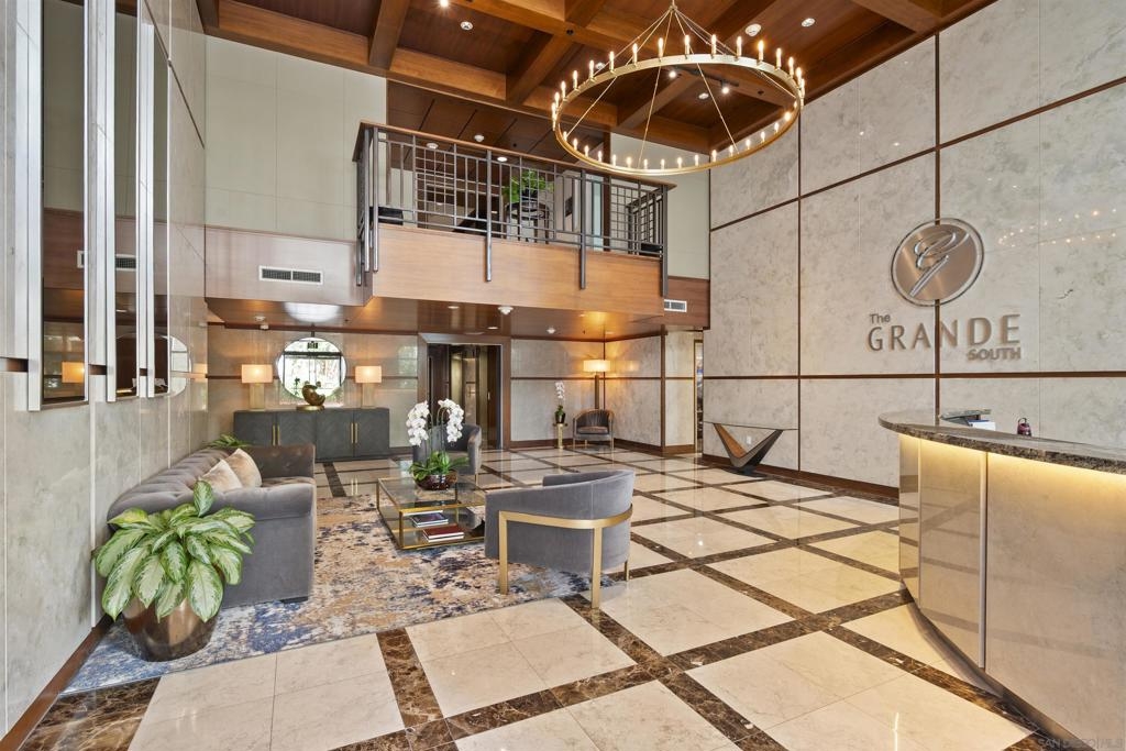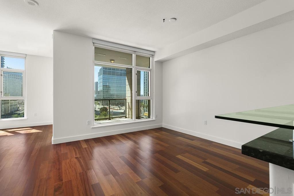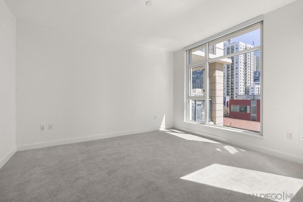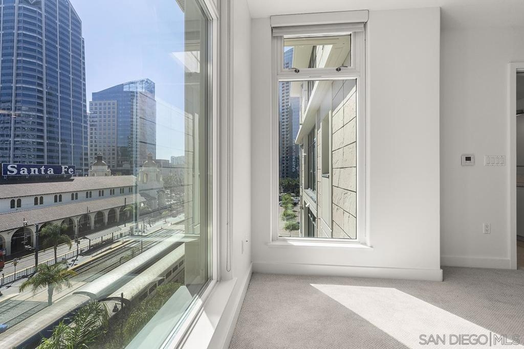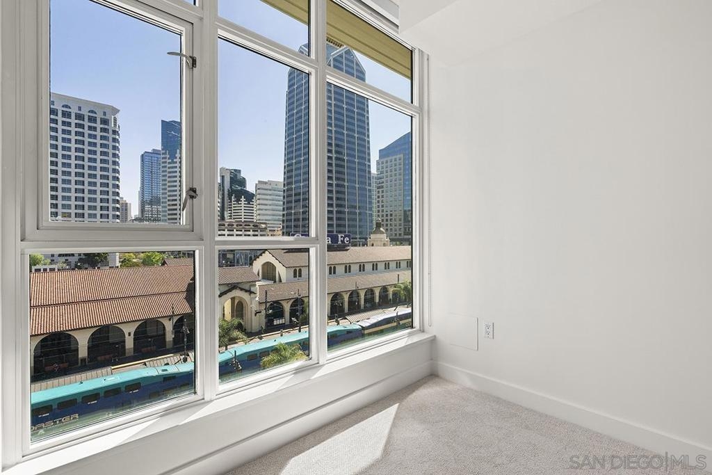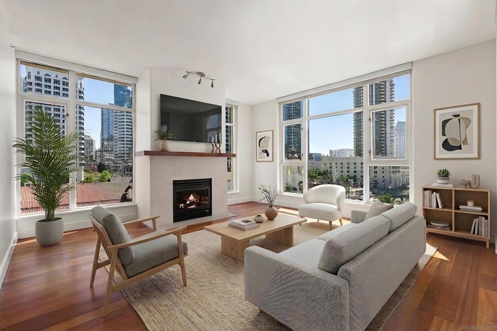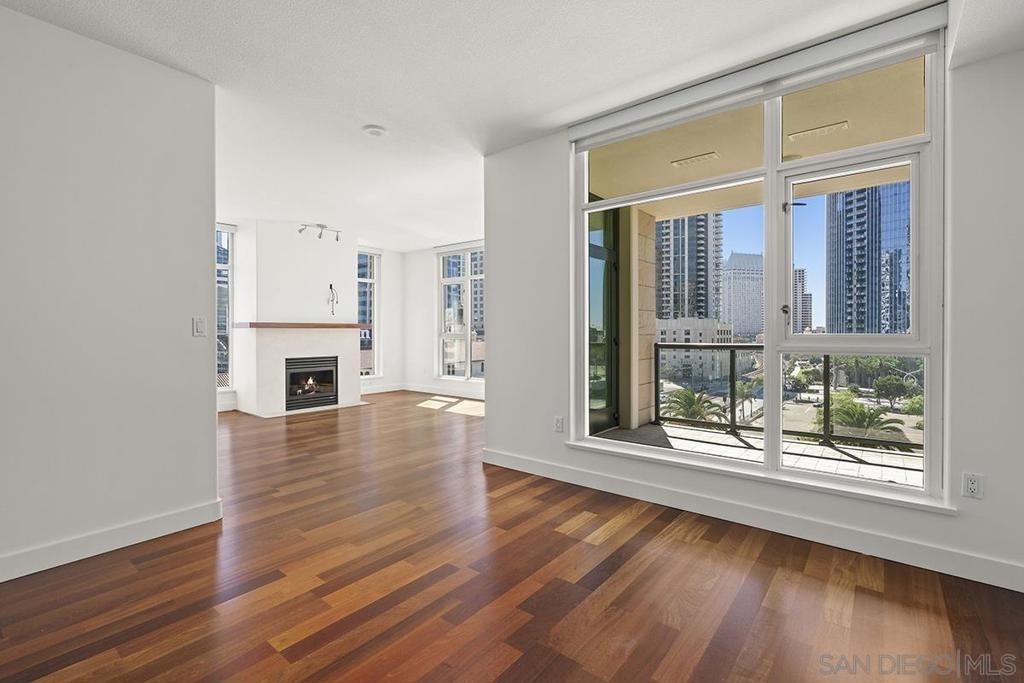 Come see what luxury living all is about at the Grande South! Polished & pristine, this gorgeous condo is highlighted by walls of windows bringing in great natural light while enjoying the beautiful cityscape and bay views from this lightly lived in southeast corner residence. This 7th floor unit features rich engineered wood floors, an ambient fireplace, and an expansive private balcony overlooking the ever-changing city and bustling Embarcadero. The chef’s kitchen boasts premium stainless appliances, recessed lighting, and gleaming granite surfaces plus a breakfast bar. The open living/dining area is perfect for entertaining with a tranquil backdrop to enliven the experience! The spacious primary suite offers sunrise mornings, walk-in closet, ensuite bathroom with frameless shower and dual vanity. Plus, newer upgraded LG ThinQ stackable washer and of storage throughout. Embrace sophisticated urban living on Millionaire’s Row! The Grande offers top-notch resort-style amenities including a newer updated and upgraded fitness center, sauna & steam room, 80-foot outdoor pool, barbecue area, club room, fully furnished meeting room, guest suite, and bicycle storage. Located across from the Embarcadero, you are sure to enjoy the prime location walkable to the waterfront, Little Italy, and Rady’s Shell at Jacobs Park, a unique live music venue and home of the San Diego Symphony! Also enjoy proximity to the future life science and biotechnology research development The Research and Development District (The RaDD) at the Embarcadero and the sustainable tech-focused Horton Plaza Redevelopment in the center of the city. Some photos are virtually staged. Builder indicated 1336sqft, assessor’s record states 1227sqft.