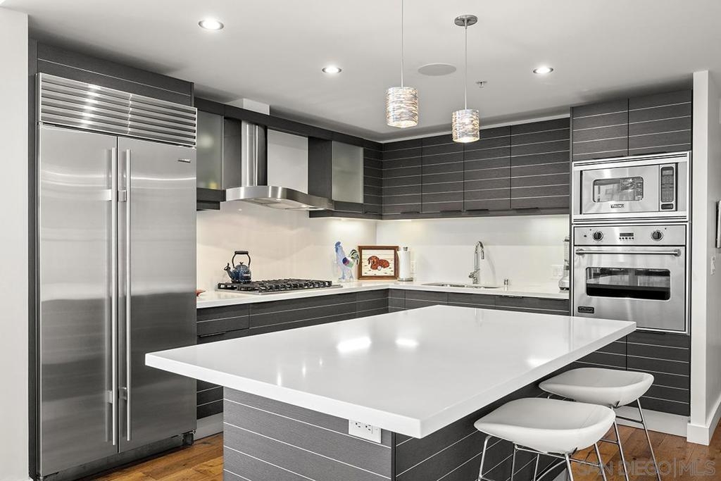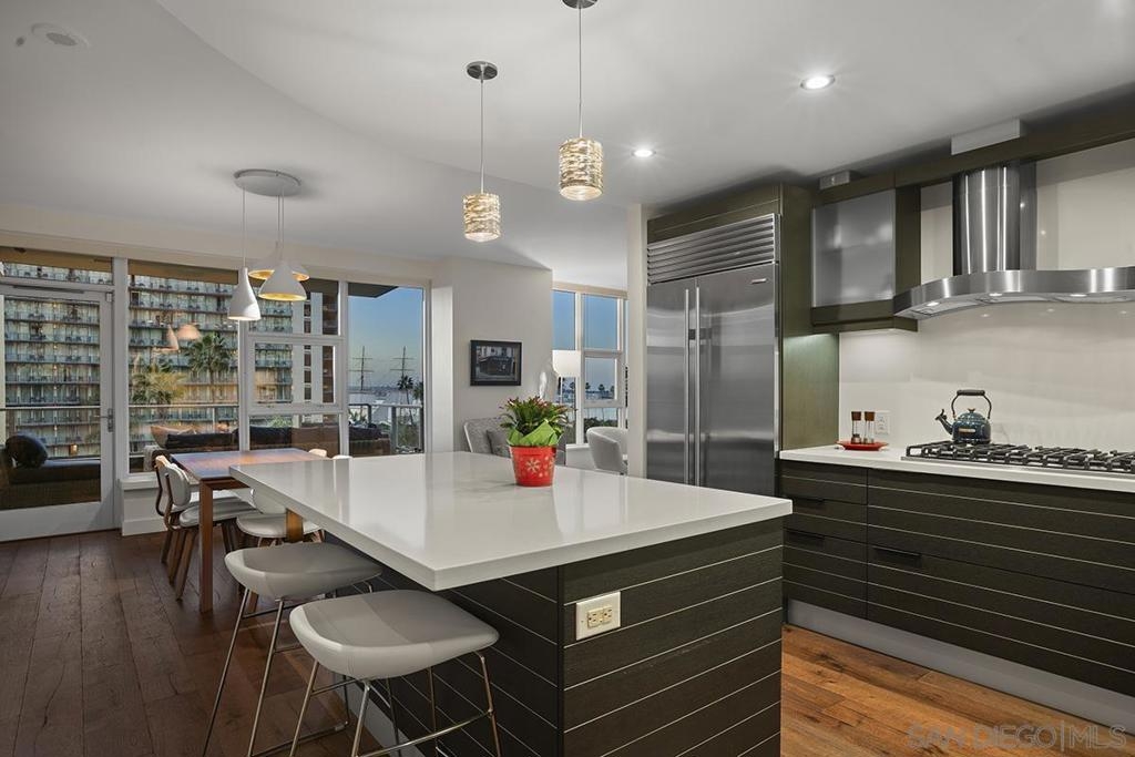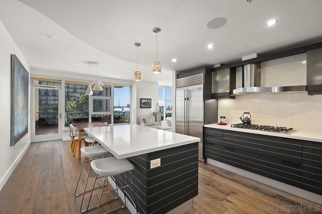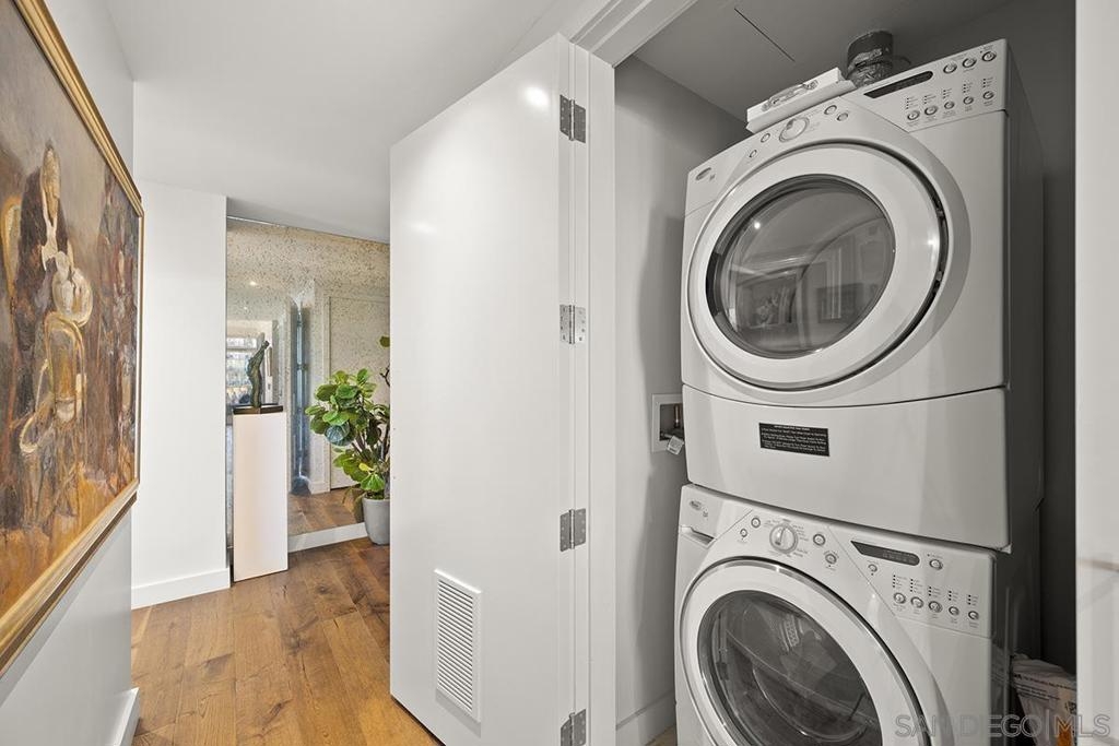 Bask in beautiful northwest views of Waterfront Park, city lights and the bay in this gorgeous, coveted 2 bedroom plus den/office corner residence in Bayside (2 balconies to boot)! Boasting expansive 9’ ceilings with expansive windows, flooding the space with natural light and capturing the views from every angle. Enjoy newer premier wide-plank “Nature Reserve Collection” engineered wood floor throughout, the open-concept kitchen is a chef’s dream, featuring premium stainless appliances by Viking and Subzero (plus upgraded beverage cooler), Caesarstone quartz countertops, Snaidero Italian cabinetry, and oversized center island, perfect for entertaining. The primary bedroom offers its own private balcony, professionally organized dual closets, and a spa-inspired ensuite bathroom with dual vanity, quartz counter, and walk-in shower. PLUS laundry closet with extra storage and stacked Whirlpool washer and dryer, great side-by-side parking, motorcycle spot, and a private storage unit. Experience luxury, style, and comfort all in one incredible home! Bask in beautiful northwest views of Waterfront Park, city lights and the bay in this gorgeous, coveted 2 bedroom plus den/office corner residence in Bayside (2 balconies to boot)! Boasting expansive 9’ ceilings with expansive windows, flooding the space with natural light and capturing the views from every angle. Enjoy newer premier wide-plank “Nature Reserve Collection” engineered wood floor throughout, the open-concept kitchen is a chef’s dream, featuring premium stainless appliances by Viking and Subzero (plus upgraded beverage cooler), Caesarstone quartz countertops, Snaidero Italian cabinetry, and oversized center island, perfect for entertaining. The primary bedroom offers its own private balcony, professionally organized dual closets, and a spa-inspired ensuite bathroom with dual vanity, quartz counter, and walk-in shower. PLUS laundry closet with extra storage and stacked Whirlpool washer and dryer, great side-by-side parking, motorcycle spot, and a private storage unit. Experience luxury, style, and comfort all in one incredible home! Old MLS listings quoted builder brochure/assessor record which showed 1474 sq.ft., assessor’s record now shows 1319 sq.ft.