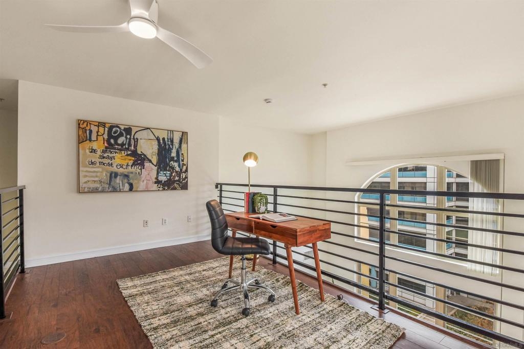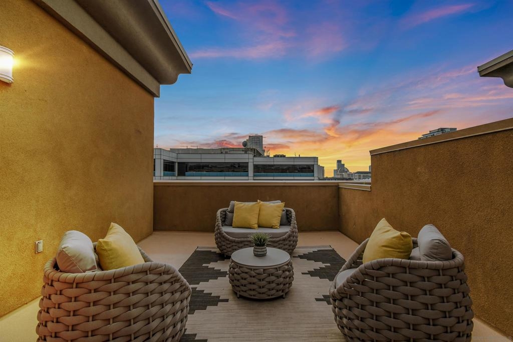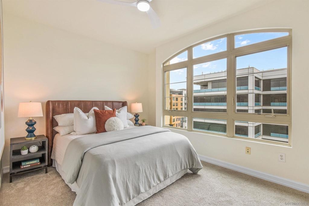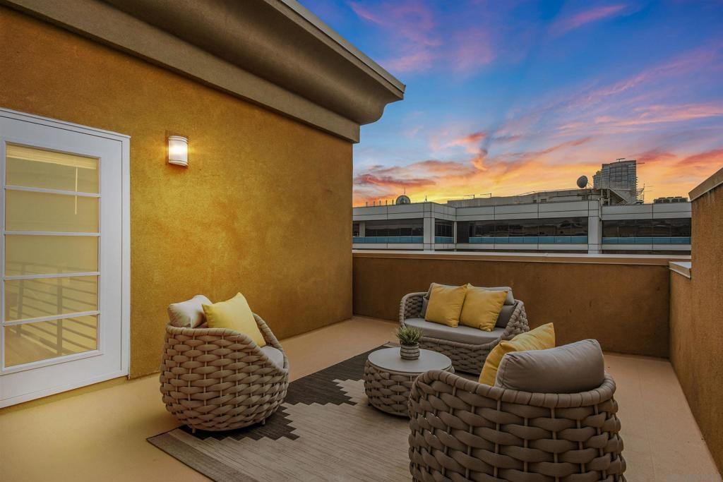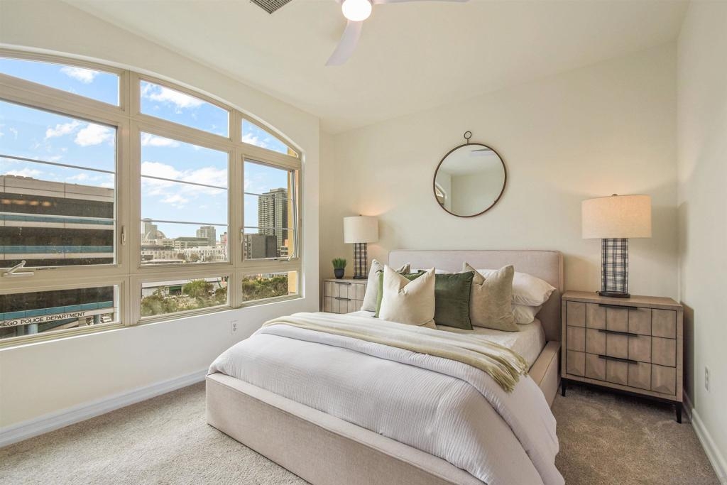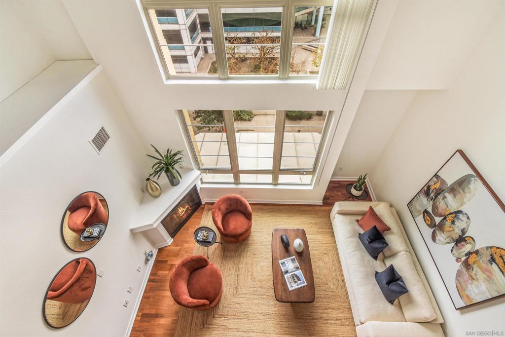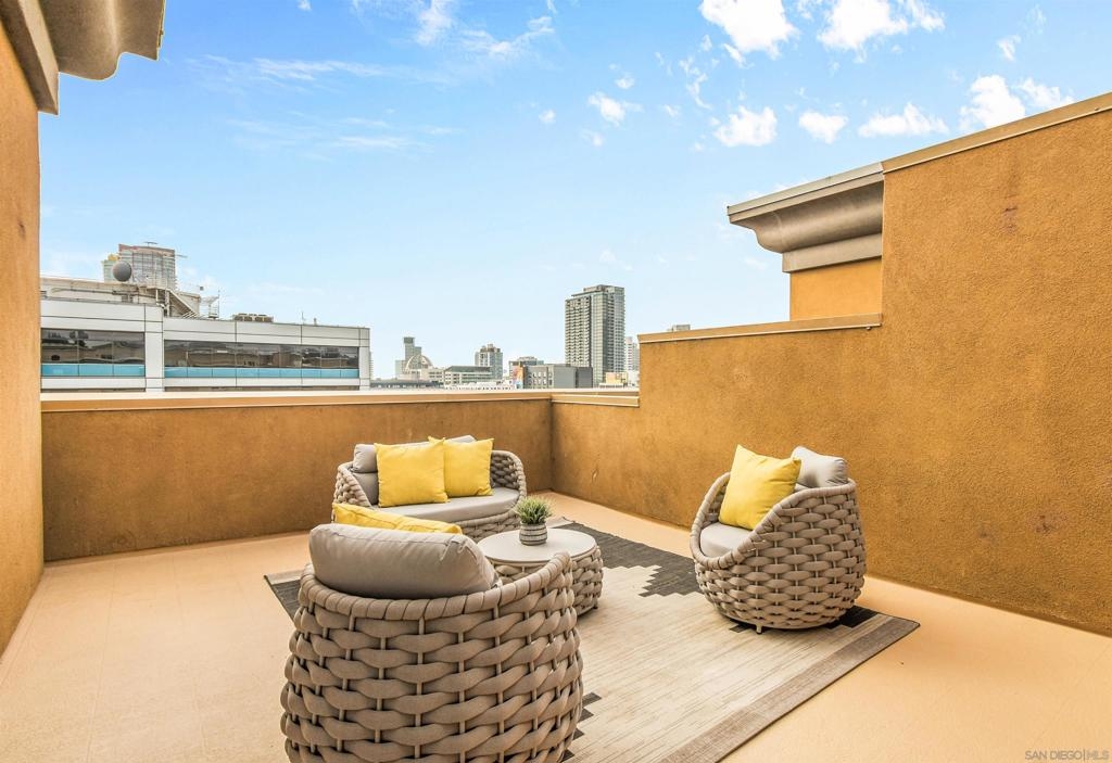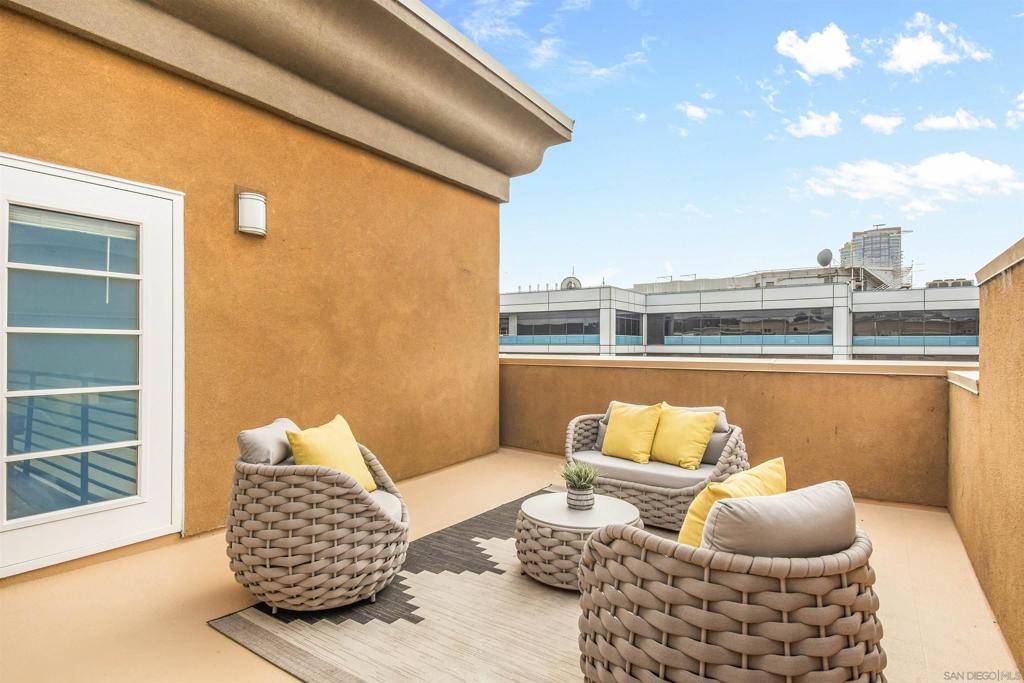 Rarely available, and tucked away near the end of the hallway on the Top Floor, is this 2 Bedroom, 2 Bath, PLUS LOFT, and a SPACIOUS ROOFTOP PATIO unit in Union Square!! Southern exposure, soaring 2 story ceilings in the main living area, and a wall of windows provide abundant natural light! An open and spacious floorplan lives even larger than its generous square footage would imply. The primary, with en suite bathroom, and guest bedrooms are sited on either side of the picture-perfect main living room. Entertain on game day or seek respite with "loft-y" expectations afforded by the indoor/outdoor flow from the 2nd story loft to the private use, terrace-like, roof-top patio. The loft functions equally well as an office|den|media|yoga|fitness|guest space, similar to how many people utilize a 3rd optional bedroom. Union Square is located right across the street from the San Diego PD HQ and less than a block from City College campus. Take in a Padres game, explore Makers Quarter, or find your favorite eatery or shop - experience the vibrancy and walkability afforded in the community of East Village! Modern ceiling fans, clean & sleek eat-in kitchen with an island, in-unit stacked laundry and 2 side by side parking spaces with 2 plexiglass enclosed storage cages above. You can have it all! Amenity-rich Union Square includes a well-equipped fitness gym, spa, sauna, bike storage cages, and an entertainer's sized community room with a pool table and a full kitchen for larger gatherings. The 2 side by side parking spaces are conveniently located near the closest elevator to your top floor unit! Top floor 2 bedroom + Loft units rarely come on the market in Union Square, and there have only been 2 other sales within the past 2 years!!