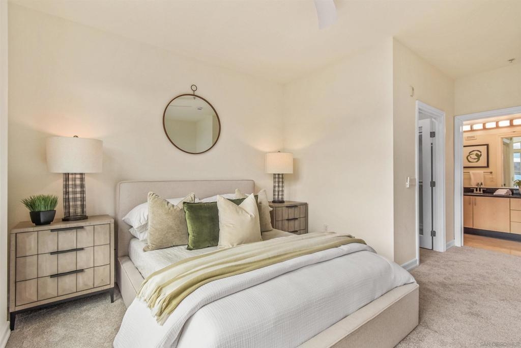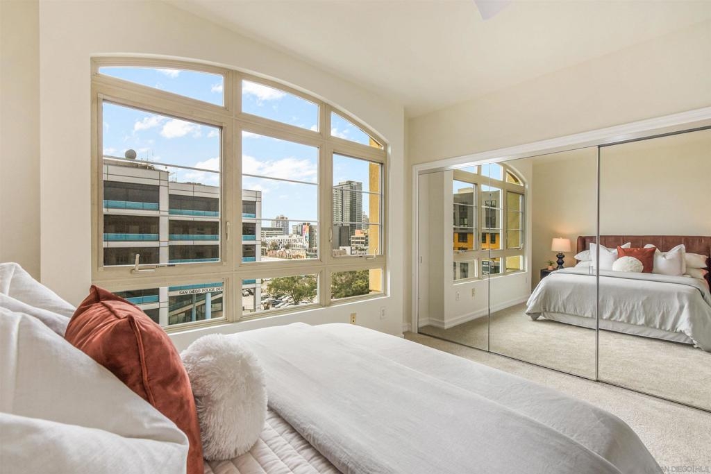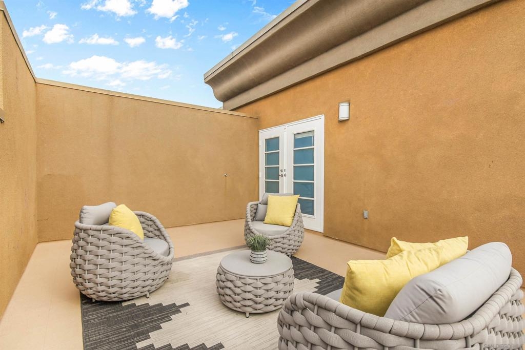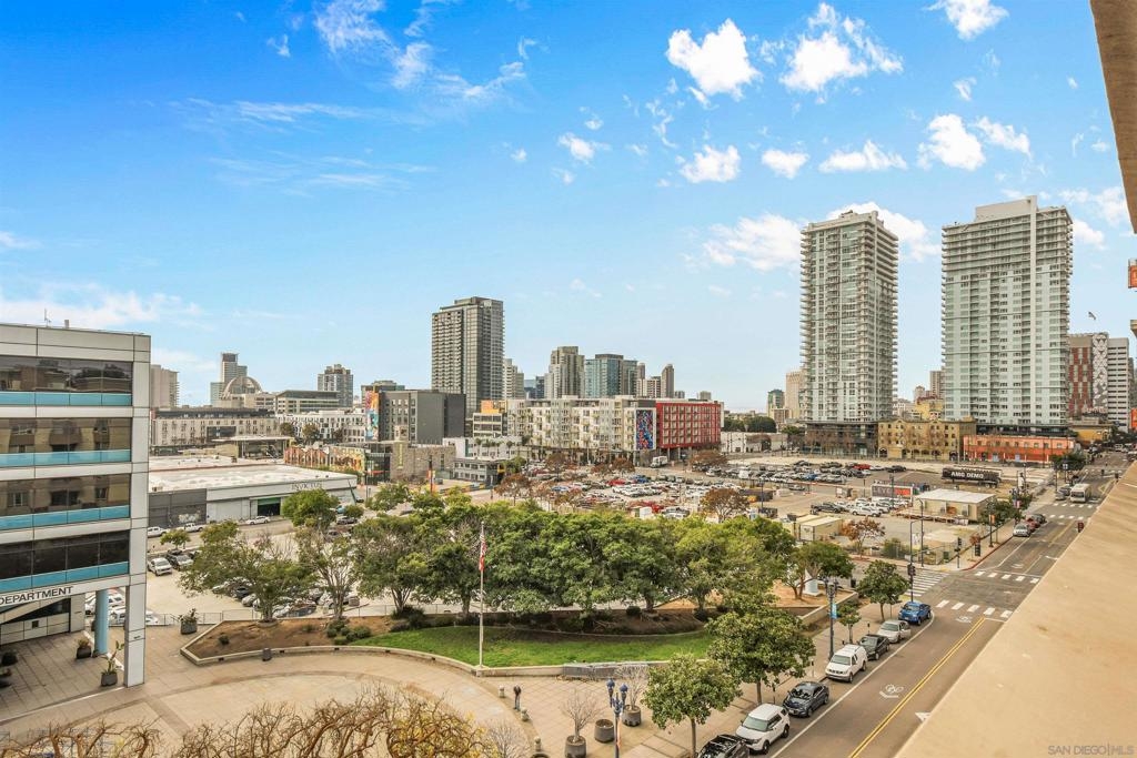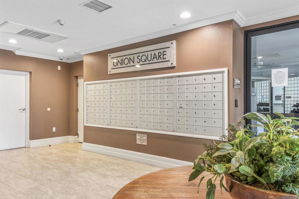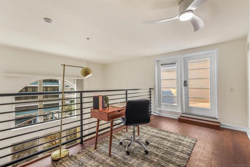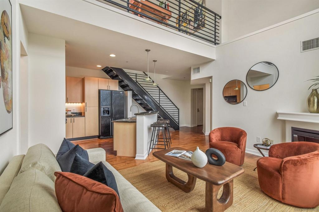 Rarely available, and tucked away near the end of the hallway on the Top Floor, is this 2 Bedroom, 2 Bath, PLUS LOFT, and a SPACIOUS ROOFTOP PATIO unit in Union Square!! Southern exposure, soaring 2 story ceilings in the main living area, and a wall of windows provide abundant natural light! An open and spacious floorplan lives even larger than its generous square footage would imply. The primary, with en suite bathroom, and guest bedrooms are sited on either side of the picture-perfect main living room. Entertain on game day or seek respite with "loft-y" expectations afforded by the indoor/outdoor flow from the 2nd story loft to the private use, terrace-like, roof-top patio. The loft functions equally well as an office|den|media|yoga|fitness|guest space, similar to how many people utilize a 3rd optional bedroom. Union Square is located right across the street from the San Diego PD HQ and less than a block from City College campus. Take in a Padres game, explore Makers Quarter, or find your favorite eatery or shop - experience the vibrancy and walkability afforded in the community of East Village! Modern ceiling fans, clean & sleek eat-in kitchen with an island, in-unit stacked laundry and 2 side by side parking spaces with 2 plexiglass enclosed storage cages above. You can have it all! Amenity-rich Union Square includes a well-equipped fitness gym, spa, sauna, bike storage cages, and an entertainer's sized community room with a pool table and a full kitchen for larger gatherings. The 2 side by side parking spaces are conveniently located near the closest elevator to your top floor unit! Top floor 2 bedroom + Loft units rarely come on the market in Union Square, and there have only been 2 other sales within the past 2 years!!