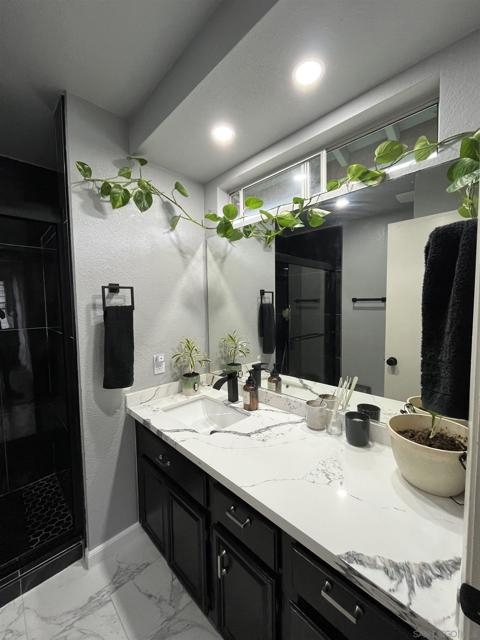 Amazing and Gorgeous 2-story town-home with 1,408 SF, 3 bedrooms, 2.5 baths. Features a very private back yard with custom gazebo including new ceiling fan. Well maintained complex with low HOA and hard to find available units for sale. This home offers a beautiful large living and dining room with new ceiling fans, half-bathroom and private laundry room down stairs, new paint throughout including kitchen cabinets, custom remodeled upstairs ensuite bathroom. New flooring upstairs, skylight in hallway for a brighter ambiance. Home facing playground. 2 assigned parking spaces and plenty of guess parking available. Very convenient location to take freeway 905, 805, and 5. Close to schools, shopping, transportation, and all.