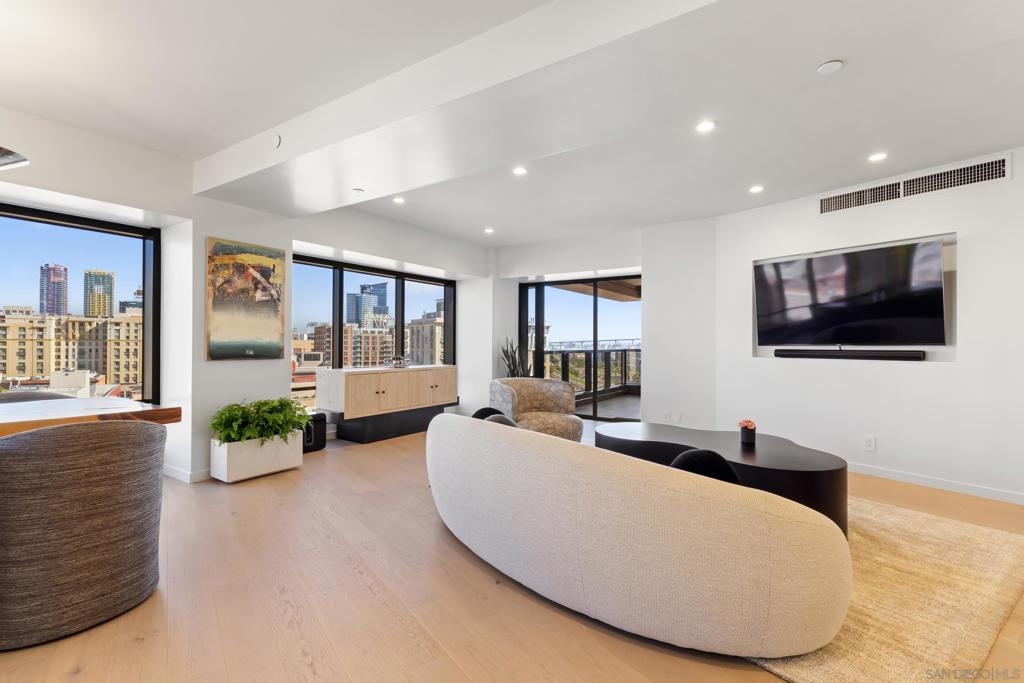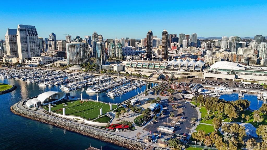 Experience refined luxury in this rarely available, beautifully updated, meticulously maintained residence in Harbor Club’s iconic East Tower, one of downtown San Diego’s premier high-rise communities. This expansive 2-bedroom, 2-bath home offers approximately 1,572 sq ft of thoughtfully designed living space, highlighted by floor-to-ceiling windows that capture natural light from sunrise to sunset and showcase sweeping panoramic views of the city skyline, San Diego Bay, Marina, and Coronado Bridge. Sophisticated finishes elevate daily living, including a curated designer color palette, hardwood flooring, quartz countertops, custom cabinetry throughout, marble bathroom flooring, recessed lighting, and a chef-inspired kitchen that flows seamlessly into generous living and dining areas—ideal for entertaining. The primary suite is a serene retreat with stunning Marina views and a spa-style bath. The guest bedroom and living room open to an expansive private balcony, extending the living space outdoors. Harbor Club residents enjoy resort-style amenities including a 95-foot lap pool, spa, sauna, fitness center, landscaped pool deck with BBQs and fire pits, community lounge and clubroom, concierge service, and a 24-hour staffed lobby. Ideally located in the Marina District, this exceptional home offers walkable access to the bayfront, dining, entertainment, and iconic destinations such as Seaport Village, The Rady Shell, USS Midway Museum, Petco Park, and the Convention Center. With only three residences per floor, this is a rare opportunity for premier downtown living.