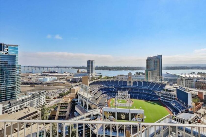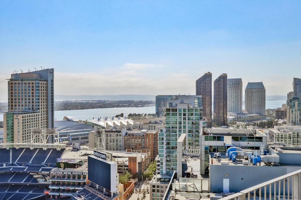 STUNNING WESTERLY TOP FLOOR END UNIT TOWNHOME TWO STORY VAULTED HIGH CEILINGS NEARING 20'. OPEN KITCHEN FLOORPLAN WITH MODERN UPDATED KITCHEN FINISHES AND HARDWOOD FLOORING. LIGHT & BRIGHT AMBIANCE RESONATES IN THE SPACIOUS 1,438 SQ.FT. TOWNHOME . 2 BALCONIES 1ST ACCESS OFF LIVINGROOM AND 2ND ACCESS FROM DOWNSTAIRS BEDROOMS. EXPANSIVE FLOOR TO CEILING WINDOWS CAPTURE EXCITING BALLPARK WESTERLY VIEWS. LOCATED IN THE HIGHLY SOUGHT AFTER ICON COMPLEX IN THE BALLPARK DISTRICT. STATE OF THE ART AMENTITIES INCLUDE 26TH FLOOR SKYBOX"ROOFTOP" ENJOY THE STUNNING VIEWS OF PETCO PARK GAMES, CONCERTS, OCEAN/BAY, CORONADO BAY ISLAND/BRIDGE AND SURROUNDING HIGHRISES.1,700 SQ.FT FITNESS CENTER, MULITMEDIA THEATER ROOM, 5TH INNING CLUBHOUSE,GAS FIREPLACE SEATING AREA. SECURED ENTRY, 24/7 FRONT DESK ATTENDANT. SUBTERRANEAN PARKING FOR 2 VEHICLES. STUNNING WESTERLY TOP FLOOR END UNIT TOWNHOME TWO STORY VAULTED HIGH CEILINGS NEARING 20'. OPEN KITCHEN FLOORPLAN WITH MODERN UPDATED KITCHEN FINISHES AND HARDWOOD FLOORING. LIGHT & BRIGHT AMBIANCE RESONATES IN THE SPACIOUS 1,438 SQ.FT. TOWNHOME . 2 BALCONIES 1ST ACCESS OFF LIVINGROOM AND 2ND ACCESS FROM DOWNSTAIRS BEDROOMS. EXPANSIVE FLOOR TO CEILING WINDOWS CAPTURE EXCITING BALLPARK WESTERLY VIEWS. LOCATED IN THE HIGHLY SOUGHT AFTER ICON COMPLEX IN THE BALLPARK DISTRICT. STATE OF THE ART AMENTITIES INCLUDE 26TH FLOOR SKYBOX"ROOFTOP" ENJOY THE STUNNING VIEWS OF PETCO PARK GAMES, CONCERTS, OCEAN/BAY, CORONADO BAY ISLAND/BRIDGE AND SURROUNDING HIGHRISES.1,700 SQ.FT FITNESS CENTER, MULITMEDIA THEATER ROOM, 5TH INNING CLUBHOUSE,GAS FIREPLACE SEATING AREA. SECURED ENTRY, 24/7 FRONT DESK ATTENDANT. SUBTERRANEAN PARKING FOR 2 VEHICLES.