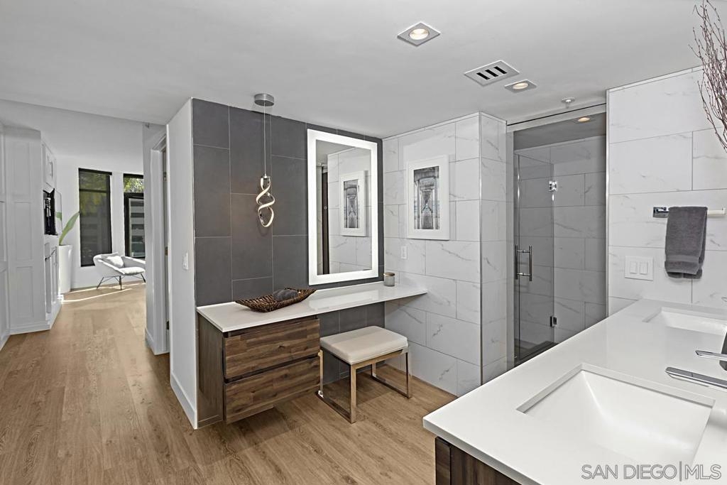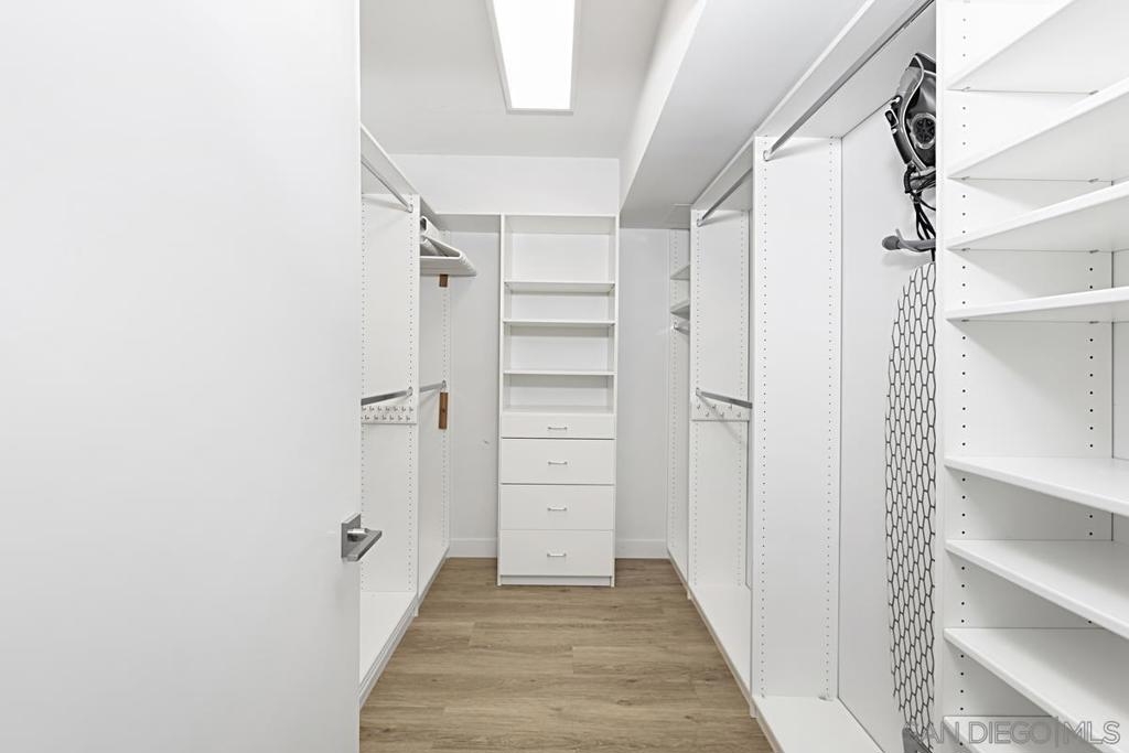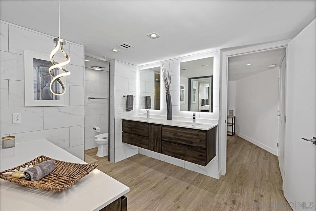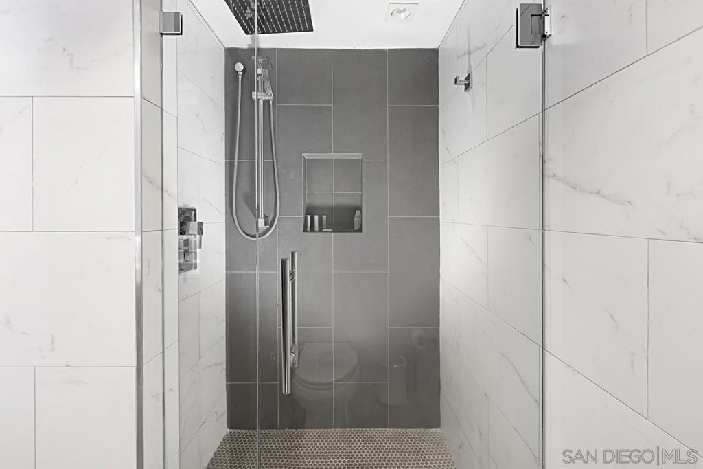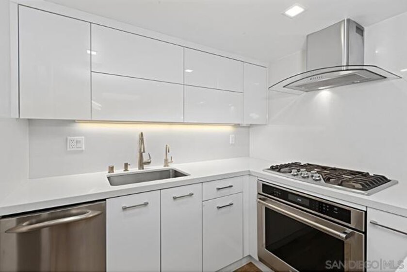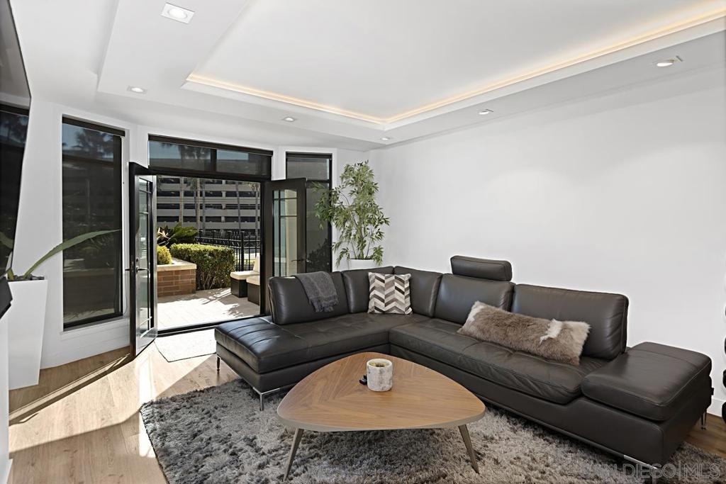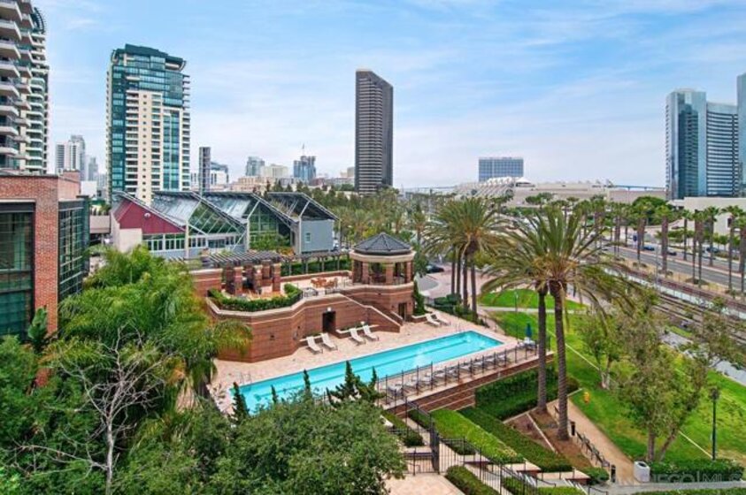 Immaculate south-facing Cityfront Terrace townhome in prime downtown Marina District location! Beautifully remodeled and move-in ready, this sophisticated residence offers an open-concept layout and sun-filled spaces with direct access to a private patio. The designer kitchen features white quartz countertops, custom Borrelli cabinetry, stainless steel appliances, a spacious pantry, and a built-in water filtration system. Elegant soffit ceilings, LED lighting, an electric in-wall fireplace, and two interior storage areas enhance both function and style. Upstairs, the expansive primary suite showcases remote-controlled shades, a walk-in closet with custom organizers, and high-end built-ins. Both bathrooms have been fully remodeled with over $150K in luxury upgrades, including modern finishes and elevated fixtures. Additional highlights include a full-size LG washer and dryer, central heating and air, a designated parking space equipped with a newly installed EV charger and a convenient storage locker. CityFront Terrace offers full-service amenities including valet parking, 24-hour front desk and security, two pools, fitness center, yoga and dance studio, outdoor BBQ area, spa, community room, and more. Ideally situated in the heart of Downtown San Diego with convenient access to Seaport Village, Little Italy, the Gaslamp Quarter, and more of the city’s premier dining, shopping, and entertainment destinations.
