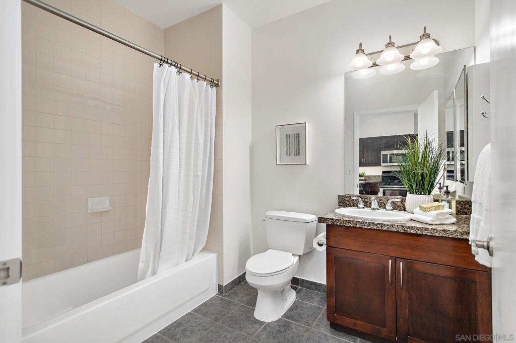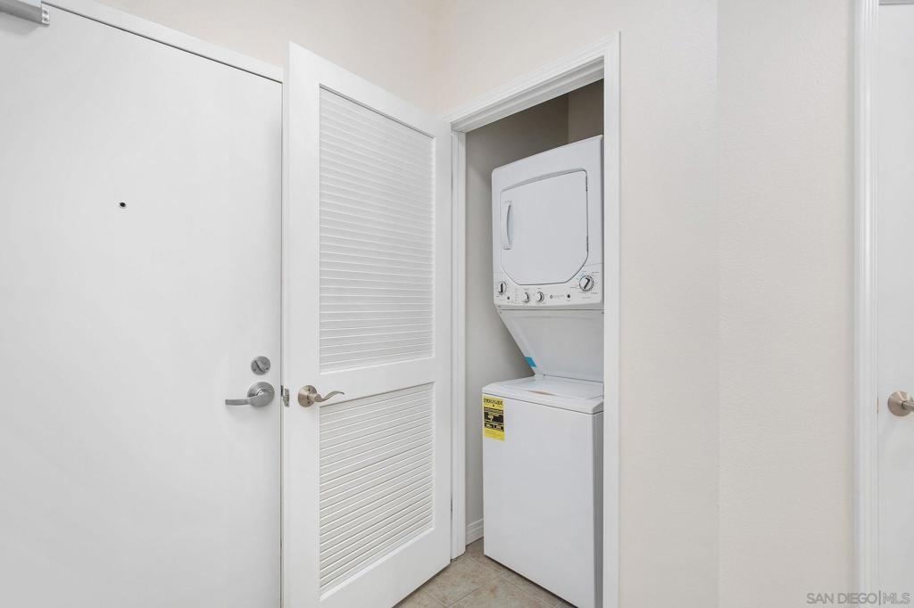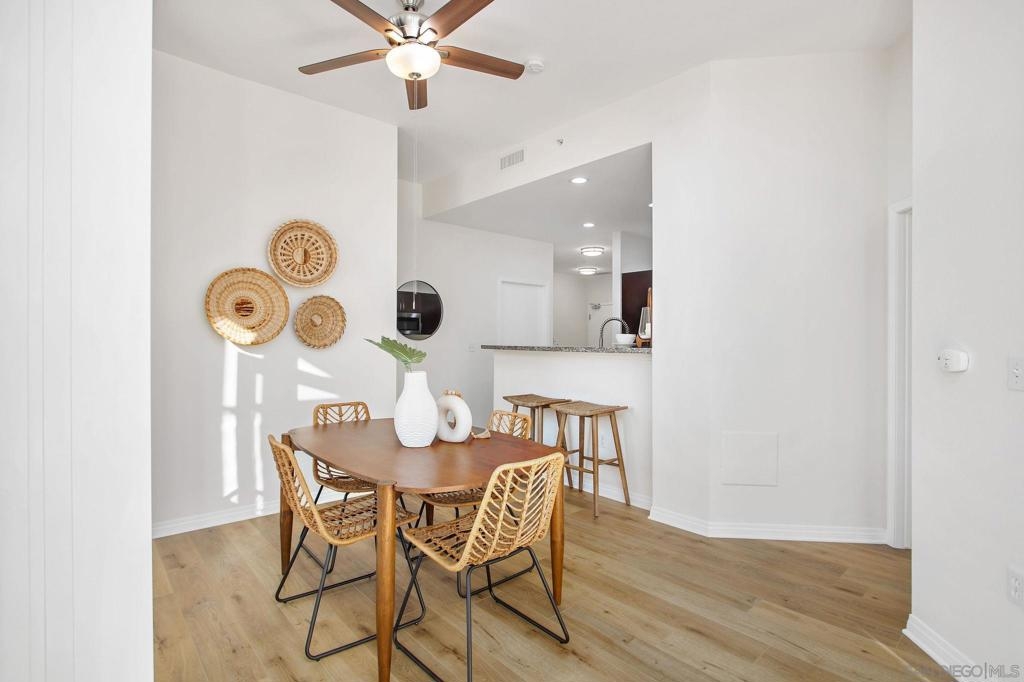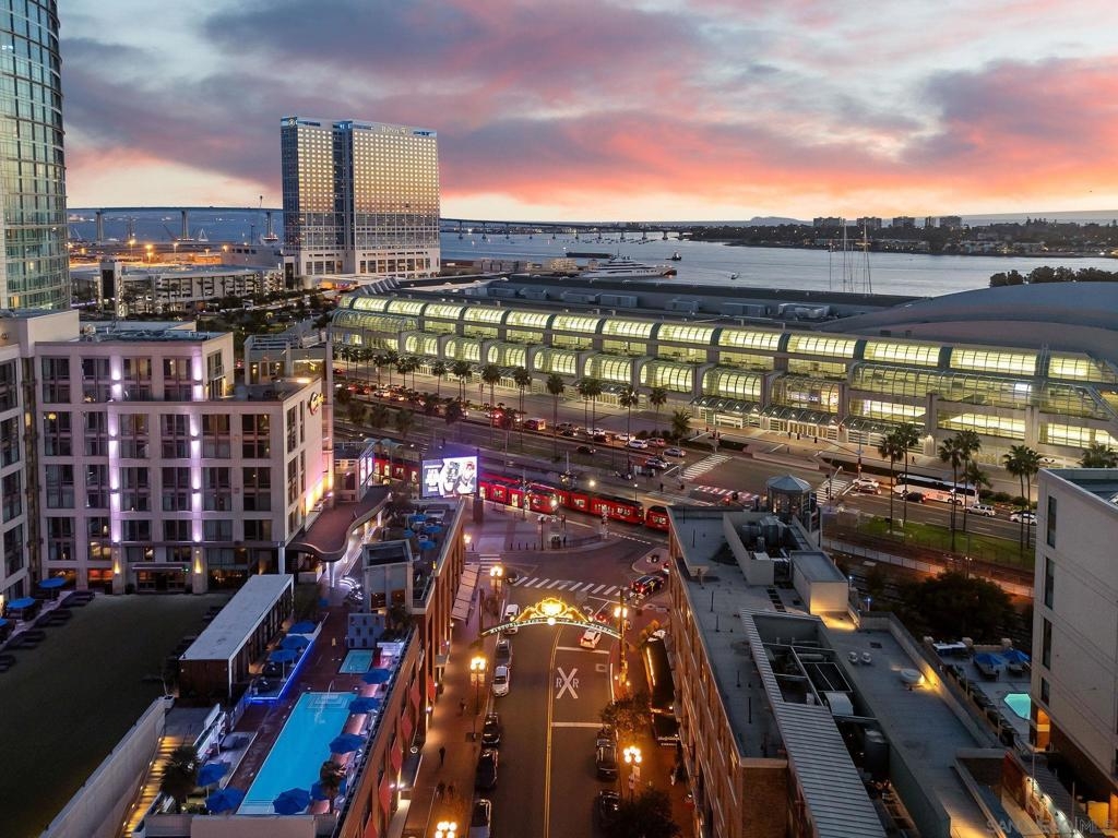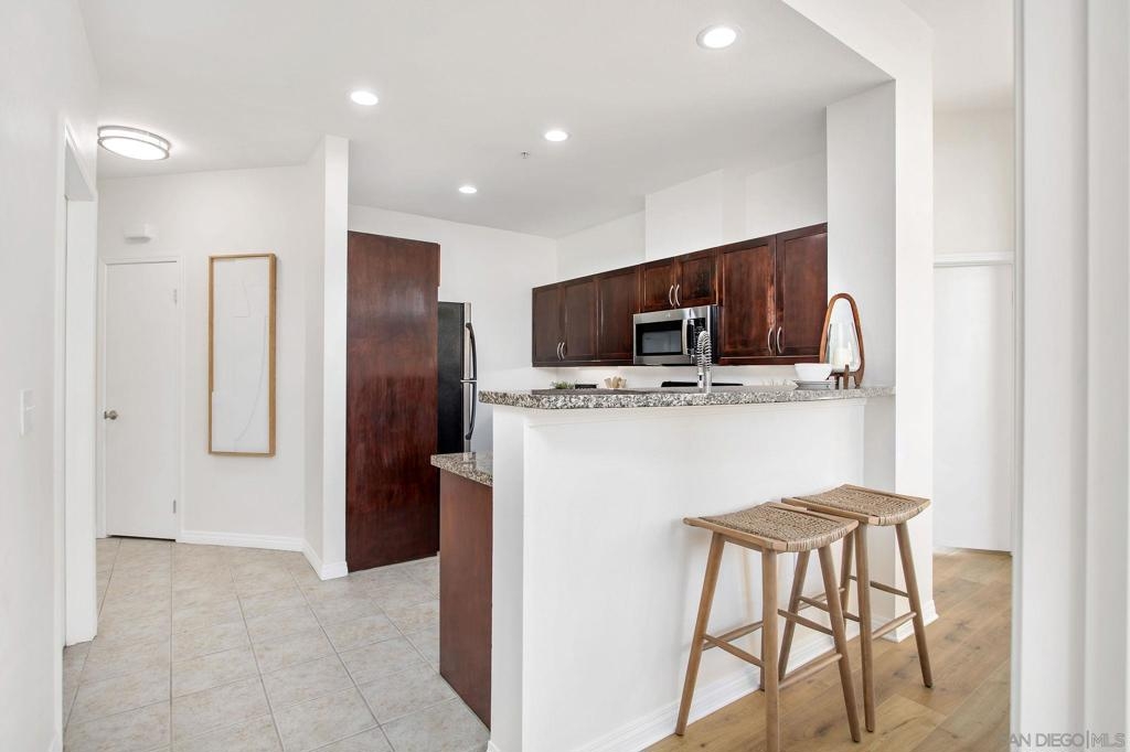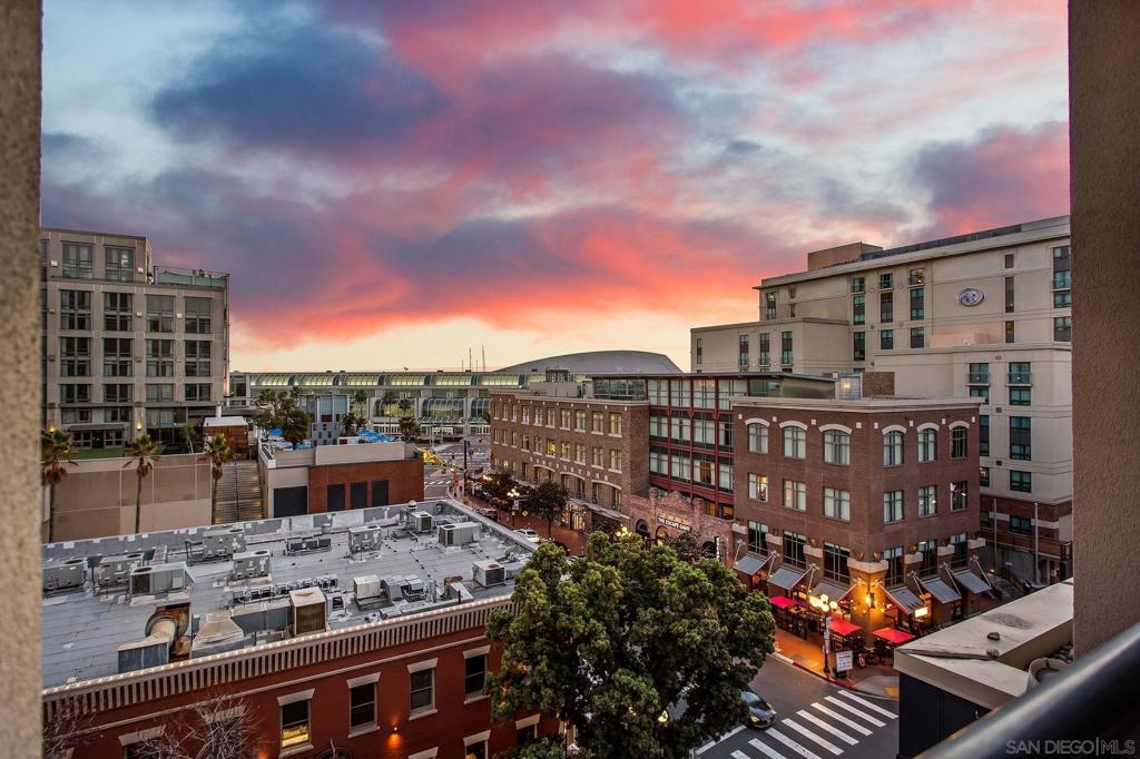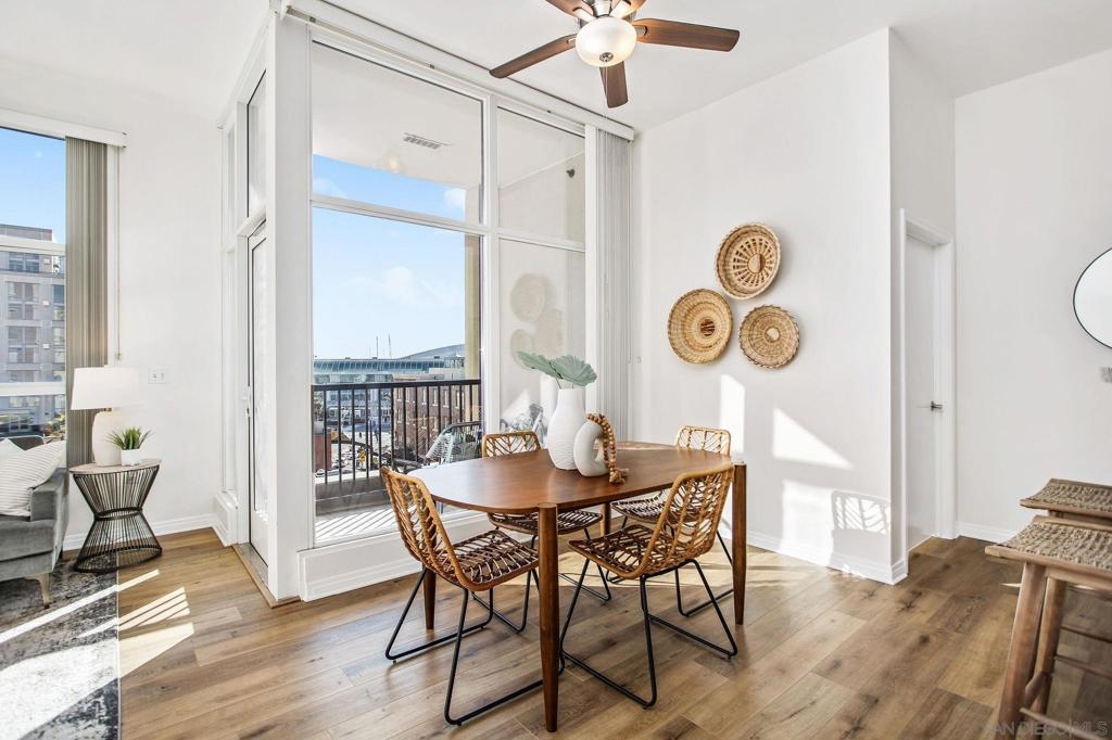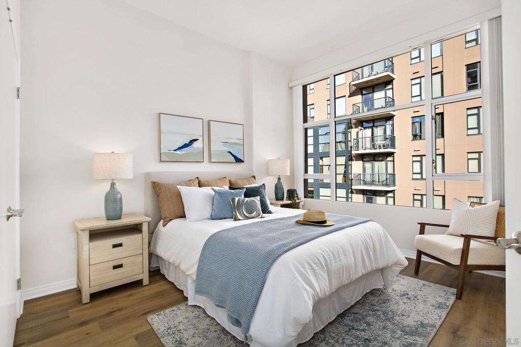 This top floor, corner unit is the epitome of downtown living nestled right in the heart of Gaslamp. Inside the condo you’ll find a light and bright space with everything you need. Step into the entryway hallway containing two coat closets and an in-unit washer dryer leading you to the open concept kitchen, dining, and living room space. The kitchen is large with excellent cabinet storage, stainless steel appliances, and an eat-in bar. The dining room and living room flow together nicely creating a functional layout where you’ll also find your private balcony. The 2 bedrooms and bathrooms are on opposite sides of the unit which provides privacy. On the dining room side, you’ll find the big secondary bedroom with a closet. The oversized guest bathroom is also on this side and contains a tub/shower. On the living room side, you’ll find the large primary bedroom which has a closet and a full en-suite bathroom. This unit has tons of natural light from the floor to ceiling windows giving it an urban lofty feel. The unit also features views of Petco Park, the convention center, and downtown including the iconic Gaslamp sign. New LVP flooring was put in the dining, living, and bedroom spaces along with fresh paint throughout. This unit comes with 2 assigned tandem parking spots. The building amenities include a private courtyard with BBQs, gym, and amazon lockers in the lobby. Don’t miss this opportunity to enjoy the best of downtown living as you’re walking distance to Padre’s games, the convention center, and some of San Diego’s most notable bars, restaurants, and night life.