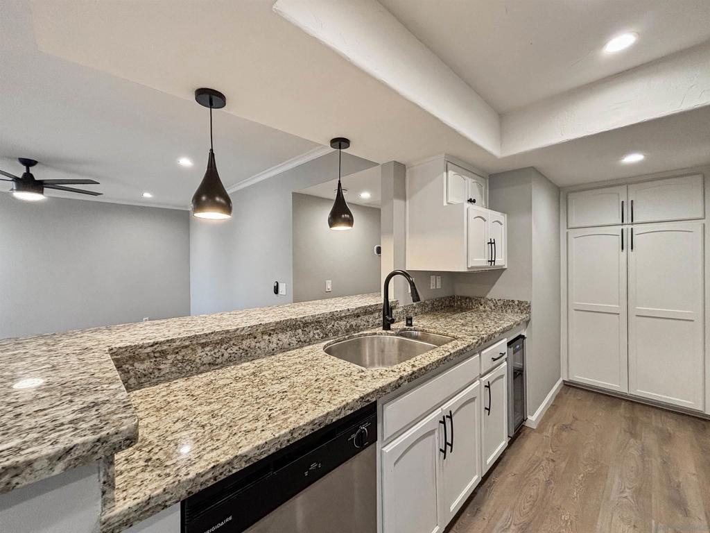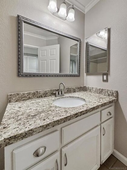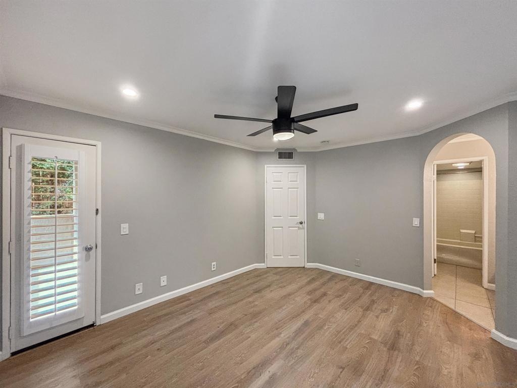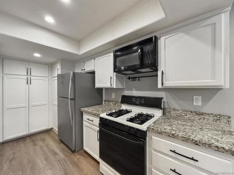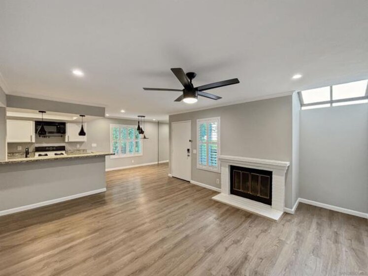 Welcome to 6025 Estelle St #4, a beautifully updated 2-bedroom, 2-bath single-level end-unit townhome in the vibrant El Cerrito / College Area—just minutes from SDSU, College Ave, and local shops, cafés, and conveniences. Step inside to discover bright, open-concept living w/ an inviting white-brick fireplace, recessed lighting, newer flooring throughout, & large windows that flood the space w/ natural light, highlighting the home’s clean, contemporary aesthetic. The updated kitchen is a true standout with solid stone counters, under mount sink, a built-in wine fridge, and plenty of prep & storage space. The seamless flow from kitchen to dining area & living room makes entertaining effortless. Both bedrooms are generously sized retreats, each offering mirrored closet doors for a polished look & excellent storage. The two full bathrooms provide comfort & convenience for roommates, guests, or a work-from-home setup. Enjoy year-round comfort with central A/C & heat, plus ceiling fans throughout for added airflow and ambiance. The home also features wood shutter blinds for style & privacy, & solar to help keep electric bills low. Slide open the door to your private balcony off the master bedroom. In-unit washer and dryer add everyday convenience, and the spacious 2-car garage provides secure parking plus extra room for storage. Located near College Ave, with easy access to SDSU, Crawford High School, and commuter routes, this home hits the sweet spot of style, practicality, and location—ideal for first-time buyers, downsizers, or investors seeking a high-demand rental.