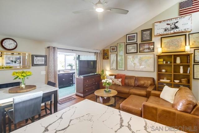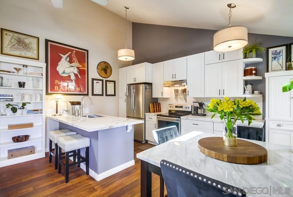 Stunning top floor unit nestled in University City! This gorgeous 1br/1ba unit features a GOURMET kitchen w/newer cabinets, quartz counters & stainless steel appliances. Vaulted ceilings, luxury vinyl floors, updated bath, 1 garage space & permit pkg spot. When you step in the door you will be impressed! The large balcony overlooks trees & greenery. This centrally located beauty is close to the beach, freeways, shopping, public library & food. The complex is well maintained & has a sparkling pool. Why on earth would you rent, when you could call this home?!!