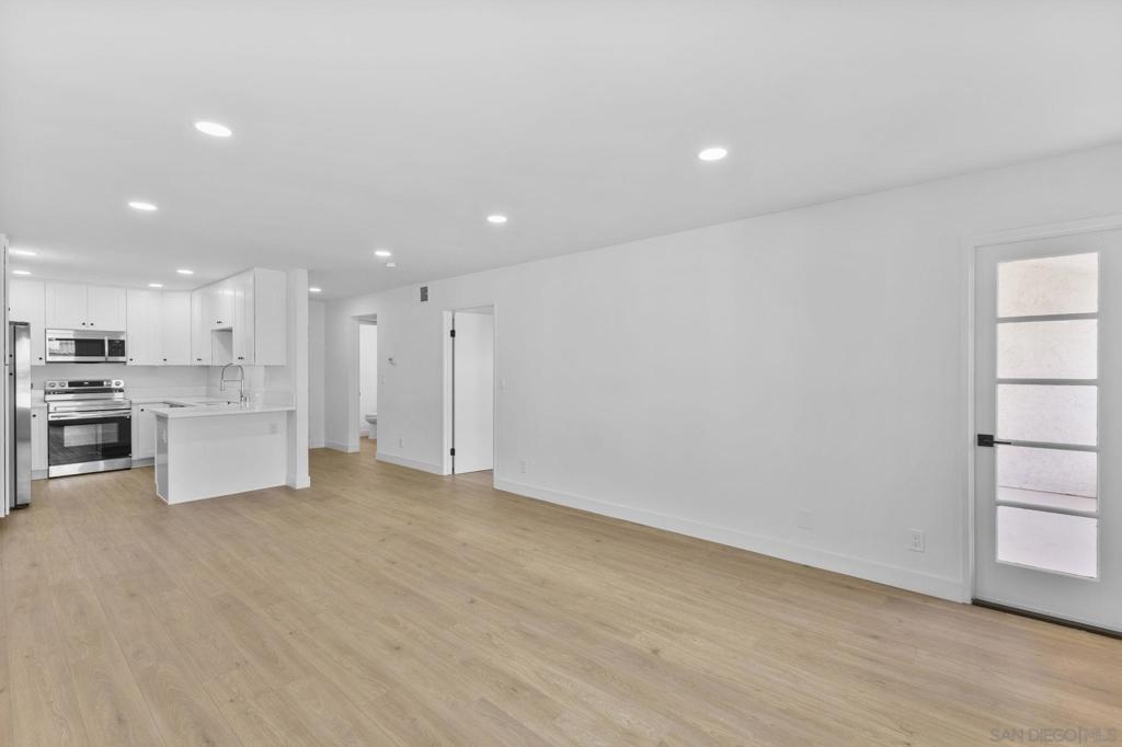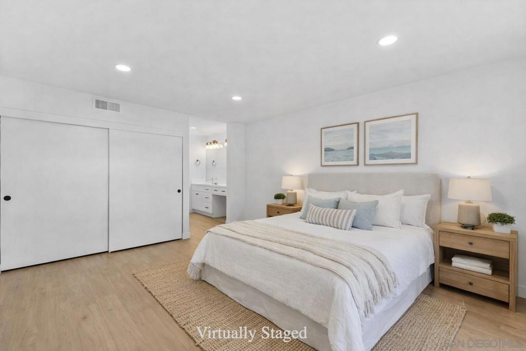 Fully remodeled top-floor 1 bed, 1 full bathroom plus an additional powder room, with brand new appliances—and the rare convenience of a private single-car garage and private on-site storage room! Step into a modern, move-in ready home featuring an open layout, luxury vinyl plank flooring, recessed lighting, and fresh paint throughout. The upgraded kitchen includes brand new quartz countertops, shaker-style cabinets, and all-new stainless steel appliances including a refrigerator, dishwasher, electric range, and built-in microwave. The home offers a unique setup with three separate sink areas, a dedicated makeup vanity, and a beautifully updated shower. Enjoy indoor-outdoor living with a private balcony overlooking the pool and scenic mountain views. Located in a quiet, well-maintained community within walking distance to Fashion Valley Mall and minutes to Mission Bay, USD, downtown, and major freeways, and positioned next to the transformative Riverwalk development for exceptional convenience, future upside, and walkability.