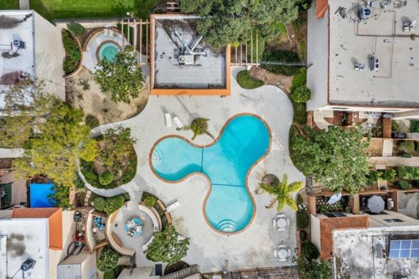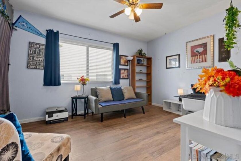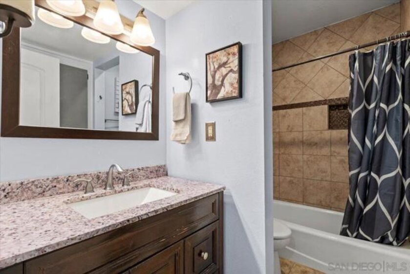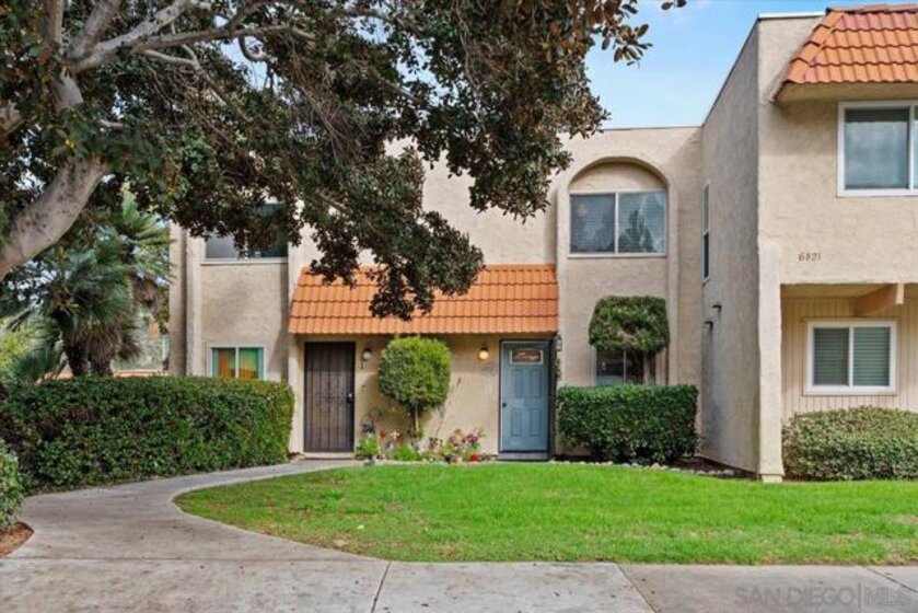 Two-story condo that lives like a townhome, offering 2 bedrooms and 1.5 baths in a centrally located community near SDSU, major medical facilities, shopping, public transit, and freeway access. The entry-level main floor features an open living and dining area with wood-look tile flooring, recessed lighting, accent walls, a gas-starter fireplace with built-in cabinetry, and central A/C. The layout flows comfortably for everyday living, with a functional kitchen offering ample cabinetry, an adjacent dining space, and a refrigerator that conveys. A convenient half bath is located downstairs for guests, along with additional under-stair storage. Upstairs, both bedrooms are generously sized and share a centrally located hallway bathroom. The layout features a vanity area positioned just outside the tub/shower and toilet area. Enjoy a private patio with easy access to the community pool, spa, grill area, and community laundry room, along with a front greenbelt area maintained by the HOA. The unit offers entry-level access and includes two assigned tandem parking spaces (#183) located just a short walk away, without the need to navigate interior corridors or buildings. Legally a condominium; layout and exterior access give a townhome-style feel. Entry-level unit with exterior access—no interior corridors. Two assigned tandem parking spaces located a short walk from the unit. Pre-home inspection and clear termite report were completed in September and are available for agent review. Solar panels installed; buyer to independently verify system details and terms. Interior living spaces are notably quiet despite proximity to major freeways. Refrigerator conveys. HOA covers water, trash, sewer, exterior building maintenance, and common area landscaping. Community amenities include pool, spa, grill area, greenbelt areas, and community laundry. Convenient location near SDSU, medical facilities, public transit, and major commuter routes.