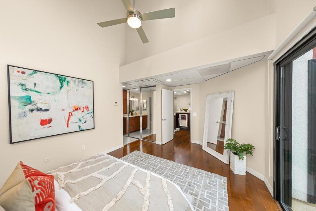 Welcome to Park Row — an urban oasis tucked in the heart of Downtown’s prestigious Marina District. This one-of-a-kind condo community offers a refreshing departure from the ordinary: no stuffy elevators or endless hallways—just open-air veranda walkways, lush landscaping, and endless blue skies. Unit 108 is a rare corner residence bathed in natural light from abundant windows and skylights. The bright and airy ambiance is complemented by soaring vaulted ceilings and a thoughtfully designed open layout. The custom kitchen features sleek solid-panel cabinetry, a glass subway tile backsplash, stainless steel appliances, a full-sized pantry, and a spacious bistro-bar, perfect for casual meals or entertaining guests. This unique floor plan offers two master suites on separate levels for ultimate privacy and flexibility. The upper-level suite is a loft-style bedroom with its own private bathroom, ideal for guests, a home office, or a stylish retreat. All lighting has been upgraded to energy-efficient LEDs, and a newer tankless water heater adds to the home's modern convenience. Step outside onto your private patio to enjoy your morning coffee or unwind in the evening, your own peaceful outdoor escape in the city. As one of only four units in the community with two dedicated underground parking spaces, convenience is key. And with a Walk Score of 95, you're just steps from shops, restaurants, the waterfront, Petco Park, and all the best of downtown San Diego.
