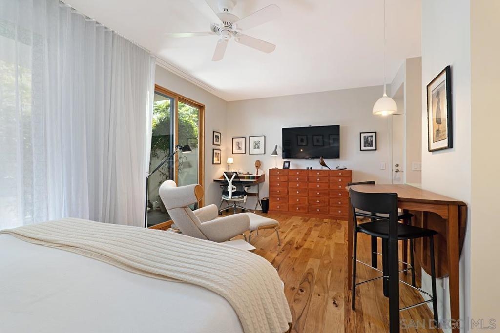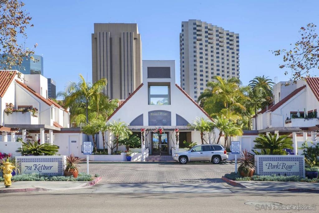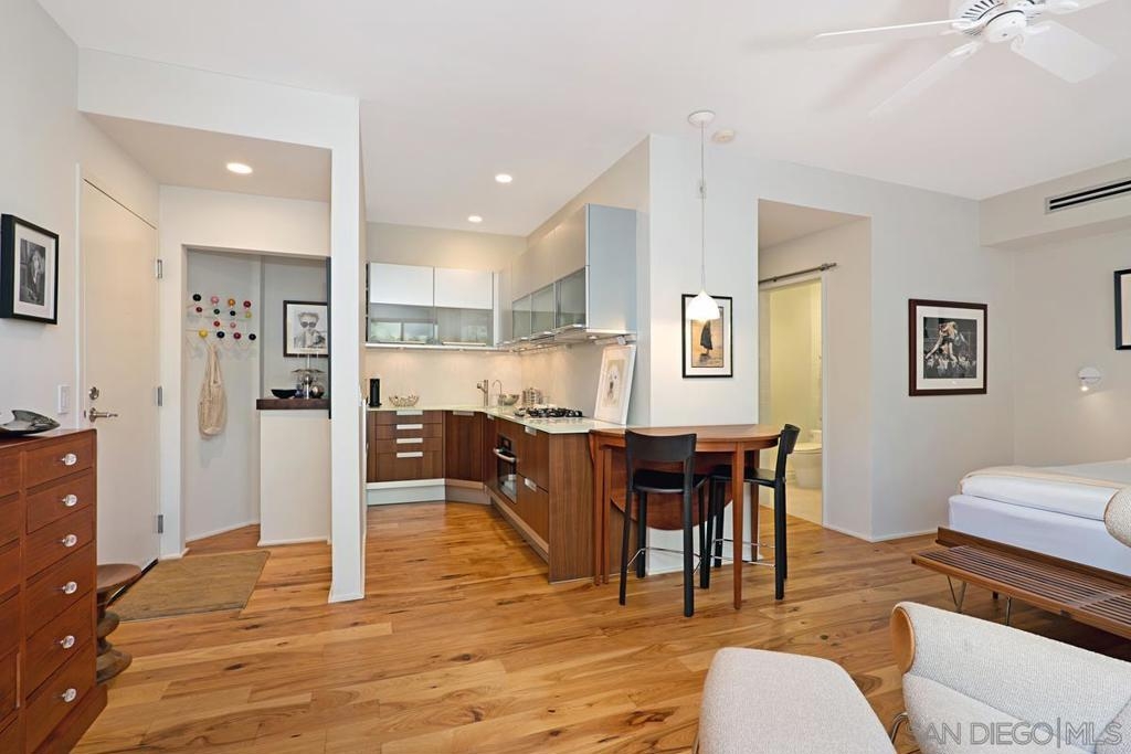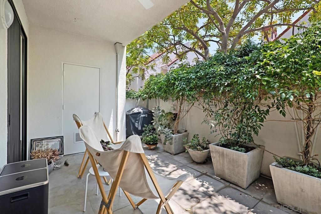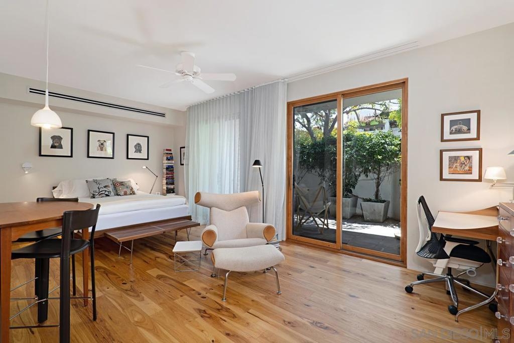 Remarkable. Reimagined. Remodeled to perfection. This ground floor one bedroom Park Row residence has been transformed into a chic Manhattan style pied-à-terre studio of astonishing quality & design. Hickory floors. Contemporary Poggenpohl kitchen with Miele oven, cooktop, dishwasher & ventilation; Sub-Zero under-counter refrigerator & freezer. Tempered glass counters. Spacious bathroom with intriguingly beautiful Ann Sacks tile, glass vanity top & stainless steel sliding door system from Bartels. Frosted glass-door closet for storage and the Miele washer and dryer. Anderson Eagle sliding doors lead to the large zen-garden style private patio. Enjoy southern exposure under the jacaranda trees in this beautiful resort like complex! ****NOTE**** This unit was originally a one bedroom floorplan. The bedroom wall was removed to create a more dramatic and spacious studio environment. The next owner could potentially (with HOA approval and any necessary City permits) re-create a 1 bedroom by adding a wall and a door to suit their needs.******* Located in the quiet and upscale Marina District...short walks in every direction to the Bay, Convention Center, Little Italy, Seaport Village, Trolley & Amtrak. Only ten minutes to San Diego Airport! Park Row is a community of 222 units built on 3 City blocks (6 acres)...this is stunningly low density when compared to nearly all other Downtown developments. The result is not only a generous apportionment of the grounds to gardens but unheard of space for the resort like pool, spa, clubhouse facility and 20 guest parking spaces. Stroll through the walkways of Park Row and enjoy the variety of trees and flowering plants...each courtyard has it's own unique fountain & garden style. Park Row is adjacent to Pantoja Park on G Street. Residents enjoy direct security gate access to the complex from this beautiful park. Pantoja Park is also the perfect place to take your dog for a walk and meet the neighbors! All units in Park Row come with one assigned parking space in the underground lot. Residents can rent an additional parking space for $60/month from the HOA. Ask agent about parking rules. Each unit has a small storage cabinet in the garage. Bike cage and bike "vaults" are available for rent from the HOA. Pool and spa are heated year round. Onsite manager and 24 hour guard service with video surveillance monitoring. Delivered packages are safely held in the clubhouse for pickup. And speaking of the CLUBHOUSE: It can be reserved for a nominal fee for parties and private events!! There is a car wash area on the Private Drive (E Street). Umbrellas & gas or electric BBQs are permitted on the balconies & patios. Park Row has 10 SDG&E managed Level 2 chargers for electric vehicles & they are located in the secured garages. Sewer: Sewer Connected Topography: LL