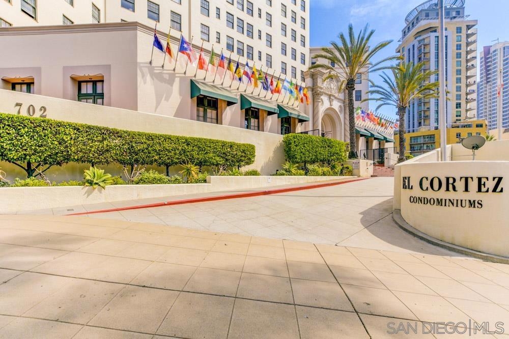 Experience downtown living at it’s best! Welcome to the historic El Cortez building, known for its celebrity guests including former Presidents and Elvis Presley. Located just blocks from the Gaslamp, East Village, Little Italy, Petco Park, and the Embarcadero, this property has quick access to freeways, restaurants and shopping and San Diego International Airport. This beautifully upgraded 2 bed, 2 bath unit is located on the highly preferable Southwestern side of the building. This corner unit is full of light and dramatic views of the city lights, plus peaks of the Coronado Bridge and bay. Completely remodeled kitchen: cabinets, stainless appliances, marble counters and floor. Gorgeous new wood floors throughout, laundry in unit, and fresh cool paint finishes in grey/blue tones. Bath upgrades include vanities, sinks, faucets, hardware, and paint. Building amenities include a heated pool, spa, bbq, full fitness center, 24/7 valet service and secured entry. Neighborhood parking permit available for $9 a year for any additional household cars. Big plus: This home qualifies for the Mills Act! Save up to 55% on your property taxes with this program! Equipment: Dryer,Fire Sprinklers, Washer Sewer: Public Sewer