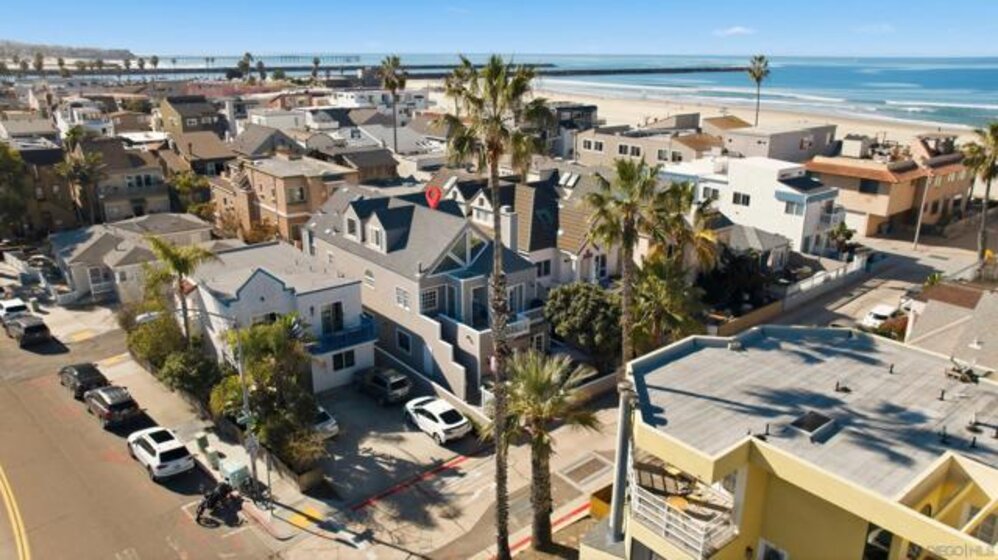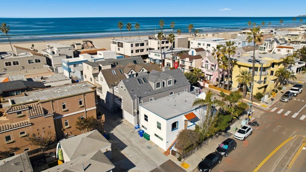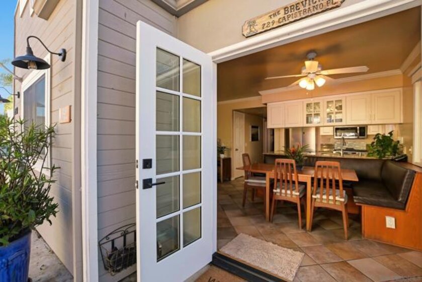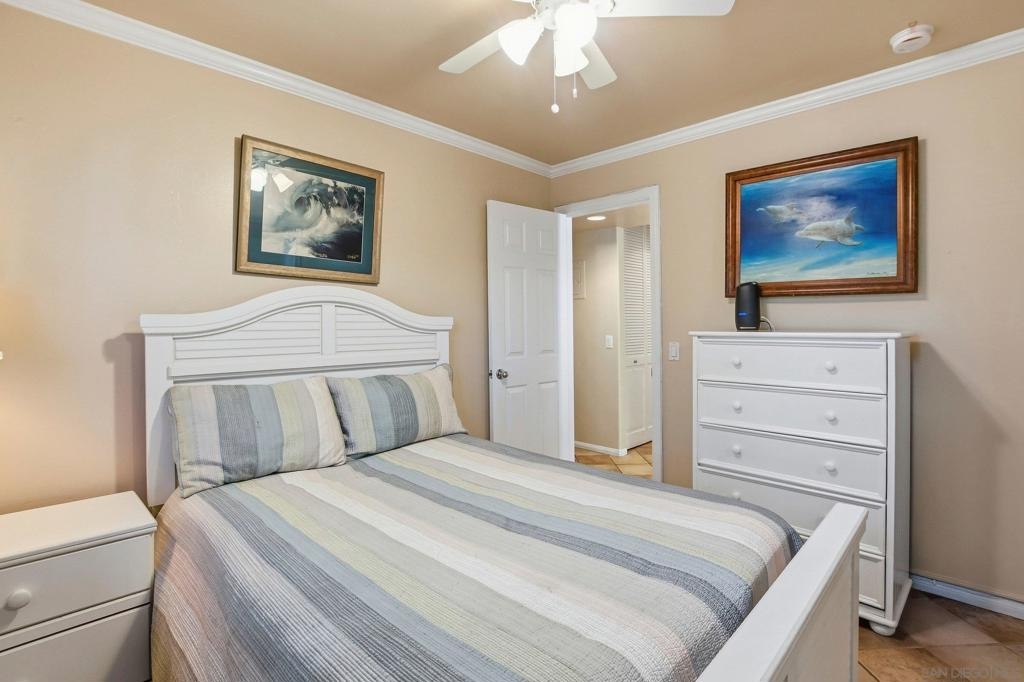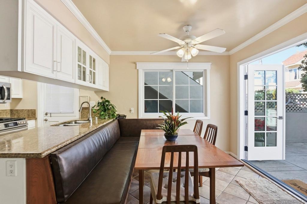 Welcome to your new beach home or ideal vacation retreat in the heart of South Mission Beach. This inviting coastal residence welcomes you through a spacious private front courtyard offering the perfect setting for outdoor dining, entertaining, or simply enjoying the vibrant people-watching. Inside, the home opens to the living/family, and dining area with tile flooring throughout.  French doors connect the dining area to the courtyard, enhancing the indoor-outdoor flow. The kitchen features granite countertops, a breakfast bar, newer appliances, a five-burner gas stove with backsplash, while the dining area includes custom built-in seating along the breakfast bar with generous storage beneath, adding charm and functionality. This two-bed, two full bath layout includes a primary suite with its own bathroom, featuring custom-built overhead storage above the bedroom closet, designed to maximize space. Both bedrooms include mirrored closet doors and ceiling fans. Additional highlights include crown molding in the living room and bedrooms, six-panel interior doors, a hallway laundry closet w/stackable washer and dryer, Anderson dual-pane windows w/lifetime transferable warranty, recent interior and exterior paint and a new roof in 8/22. This home offers two off-street tandem parking spaces and exterior storage near the covered parking area. Located just steps to the Pacific Ocean, steps to the bay, a short walk to Belmont Park, restaurants, and favorites like The Beachcomber and Pennant, this home delivers a true South Mission Beach lifestyle with year-round coastal enjoyment.