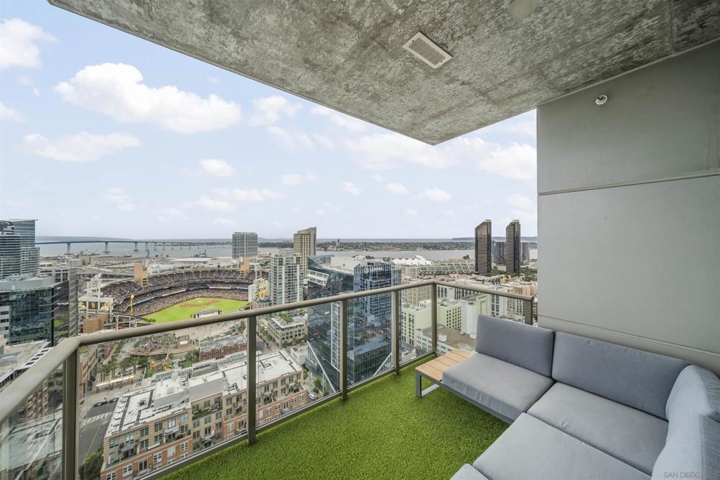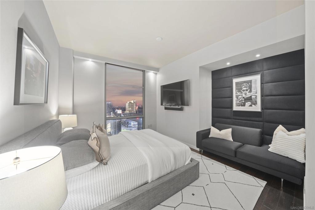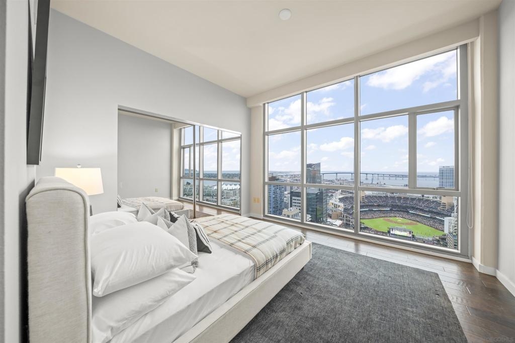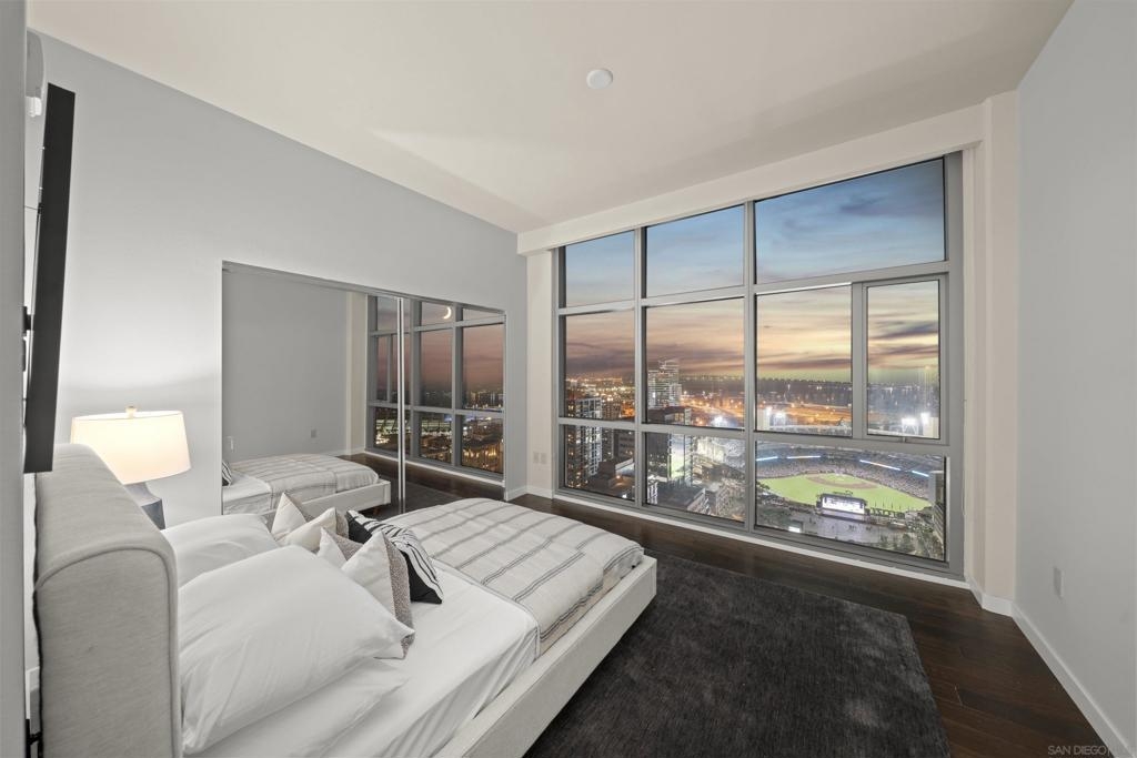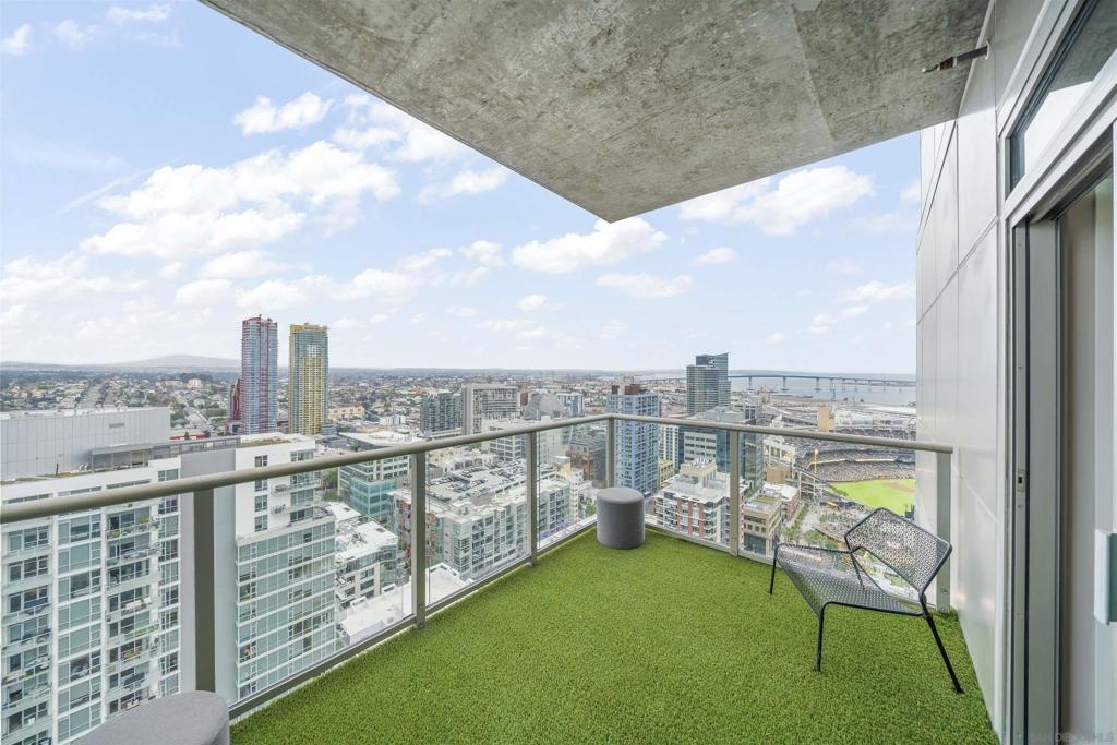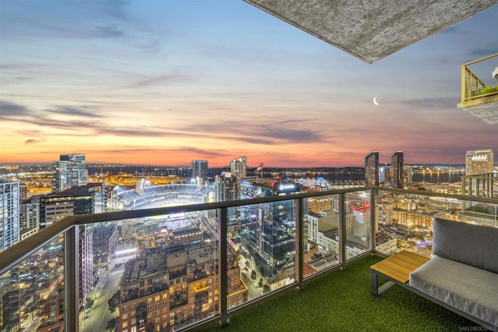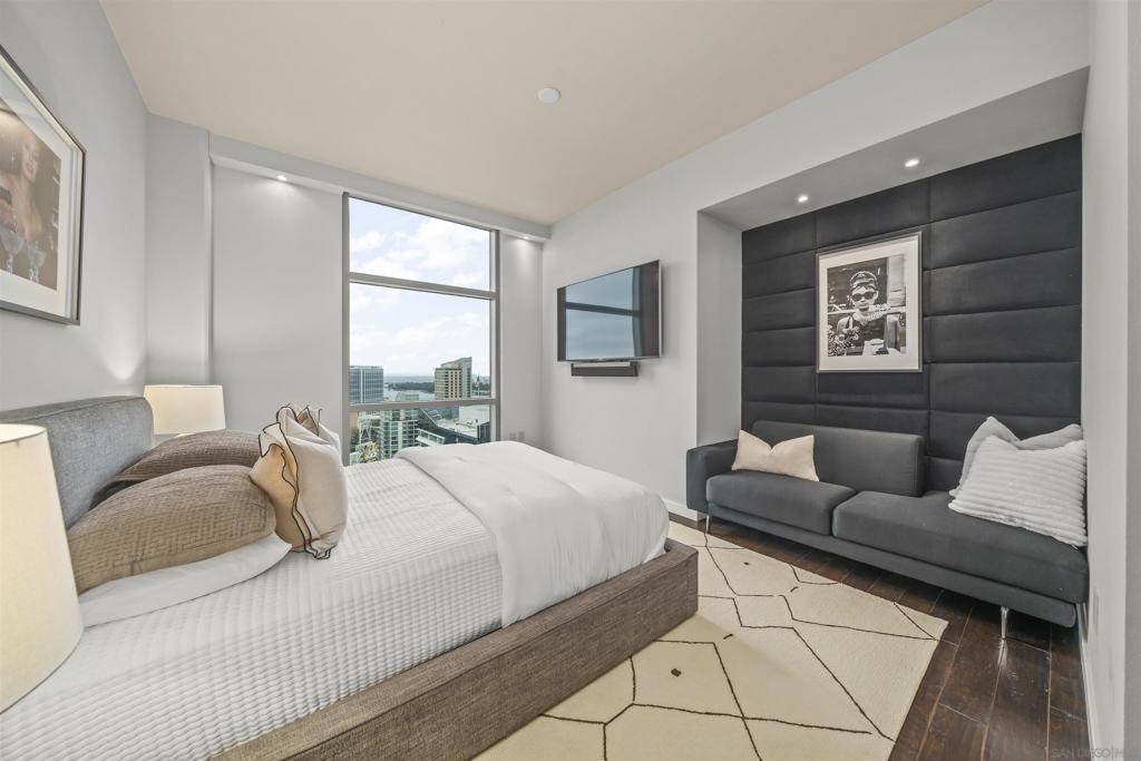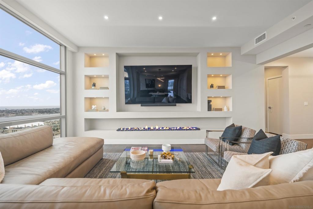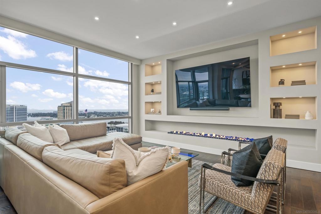 The Mark Residence 3003-Sky-High Sophistication with Iconic Views. Poised high above the city on the 30th floor, The Mark #3003 is a reimagined 3BR/3.5BA corner residence offering 2,430 sqft of elevated indoor-outdoor living. Enjoy three private terraces with sweeping views of the bay,ocean,Coronado & Petco Park. Recently transformed with a designer-led renovation, the home blends timeless elegance with modern luxury. The chef’s kitchen showcases all-new Thermador appliances,a built-in Miele espresso machine,wine fridge,custom cabinetry & matte quartz countertops by Cambria. The luminous backlit Calacatta Thunder quartz bar sets the tone for refined entertaining,while a 98" TV & 100" Aquafire Pro fireplace anchors the expansive great room. This residence offers 10' ceilings & floor-to-ceiling windows throughout. The primary suite features two walk-in closets, two balconies, a private entrance & a spa-like bath with steam shower, soaking tub, Toto washlet & LED mirror. Two en-suite guest rooms are privately located on the opposite wing, maximizing privacy. A former office was opened for a more spacious layout but can easily be restored. Additional highlights include three dedicated parking spaces with an EV charger & a private storage room. With only three residences on this floor, peace & exclusivity are assured. Residents enjoy 24-hr security, a saltwater pool/spa, state-of-the-art fitness center, conference room & a beautifully curated outdoor entertaining area with BBQs, a pizza oven & multiple lounge spaces. This is a rare & refined offering—luxury, privacy & lifestyle.