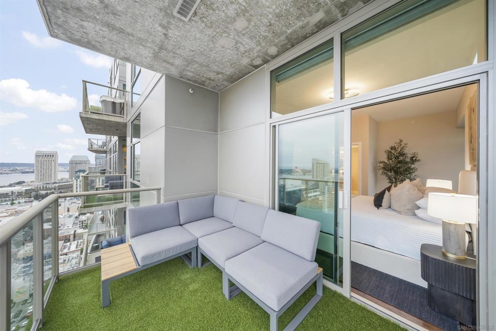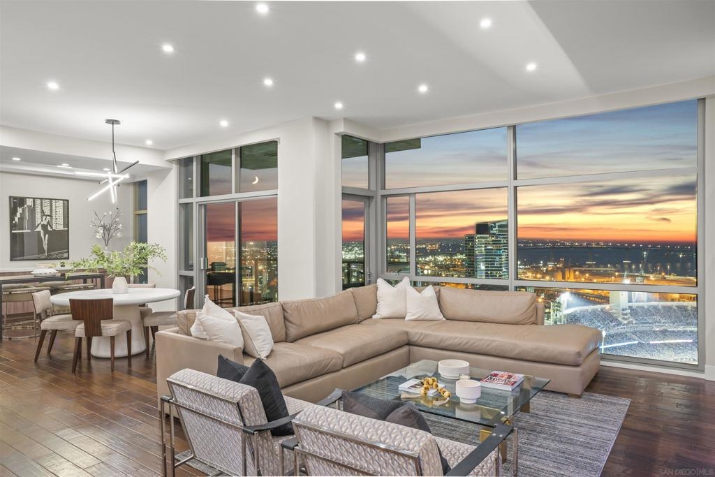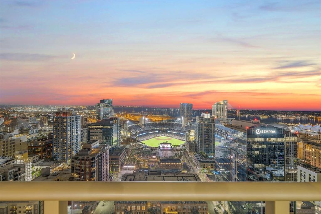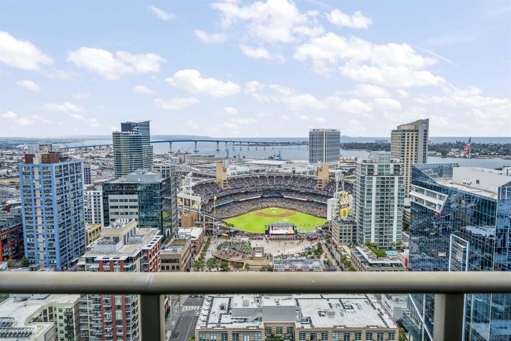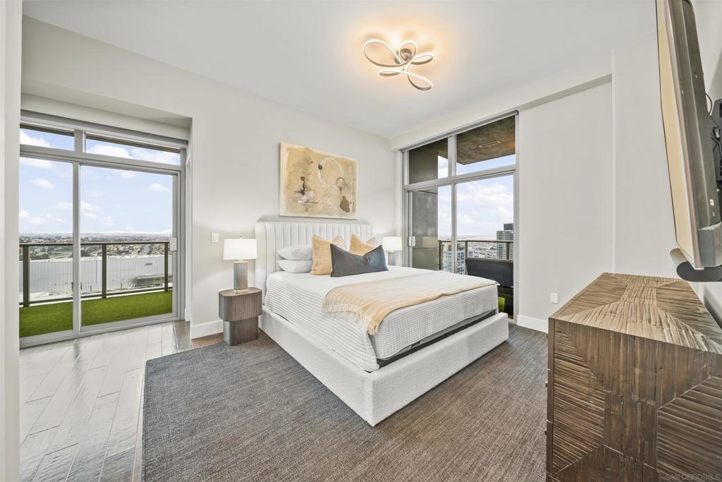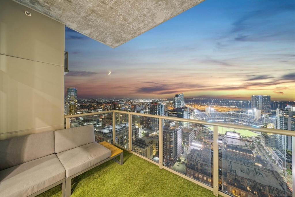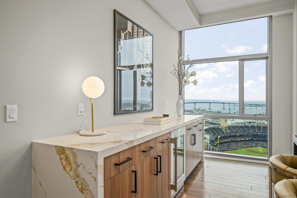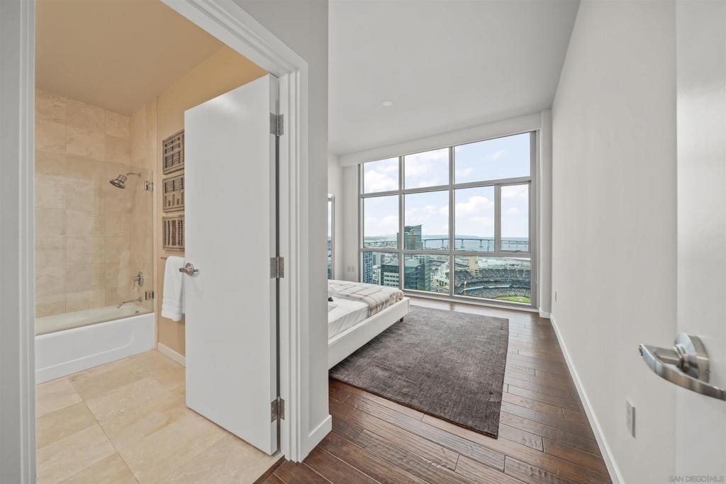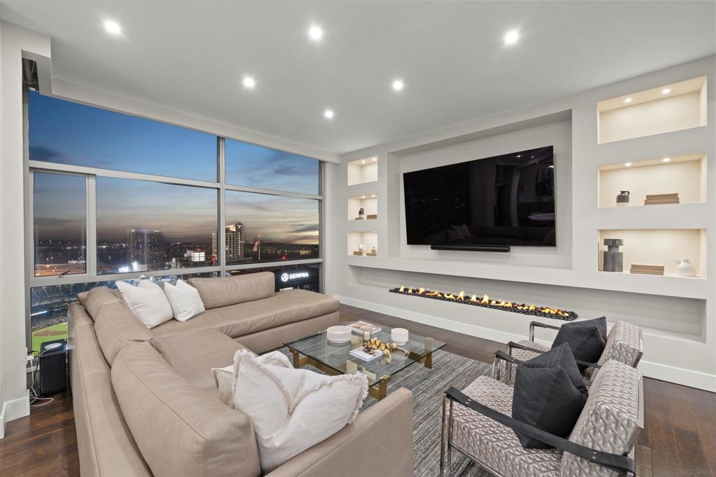 The Mark Residence 3003-Sky-High Sophistication with Iconic Views. Poised high above the city on the 30th floor, The Mark #3003 is a reimagined 3BR/3.5BA corner residence offering 2,430 sqft of elevated indoor-outdoor living. Enjoy three private terraces with sweeping views of the bay,ocean,Coronado & Petco Park. Recently transformed with a designer-led renovation, the home blends timeless elegance with modern luxury. The chef’s kitchen showcases all-new Thermador appliances,a built-in Miele espresso machine,wine fridge,custom cabinetry & matte quartz countertops by Cambria. The luminous backlit Calacatta Thunder quartz bar sets the tone for refined entertaining,while a 98" TV & 100" Aquafire Pro fireplace anchors the expansive great room. This residence offers 10' ceilings & floor-to-ceiling windows throughout. The primary suite features two walk-in closets, two balconies, a private entrance & a spa-like bath with steam shower, soaking tub, Toto washlet & LED mirror. Two en-suite guest rooms are privately located on the opposite wing, maximizing privacy. A former office was opened for a more spacious layout but can easily be restored. Additional highlights include three dedicated parking spaces with an EV charger & a private storage room. With only three residences on this floor, peace & exclusivity are assured. Residents enjoy 24-hr security, a saltwater pool/spa, state-of-the-art fitness center, conference room & a beautifully curated outdoor entertaining area with BBQs, a pizza oven & multiple lounge spaces. This is a rare & refined offering—luxury, privacy & lifestyle.