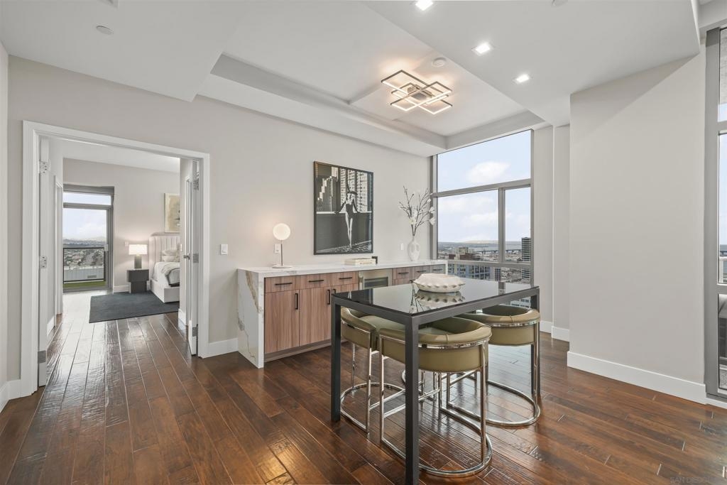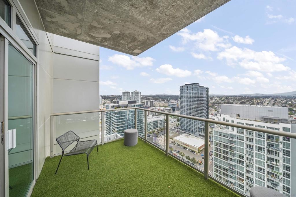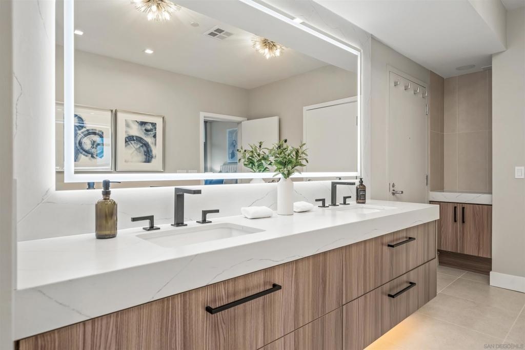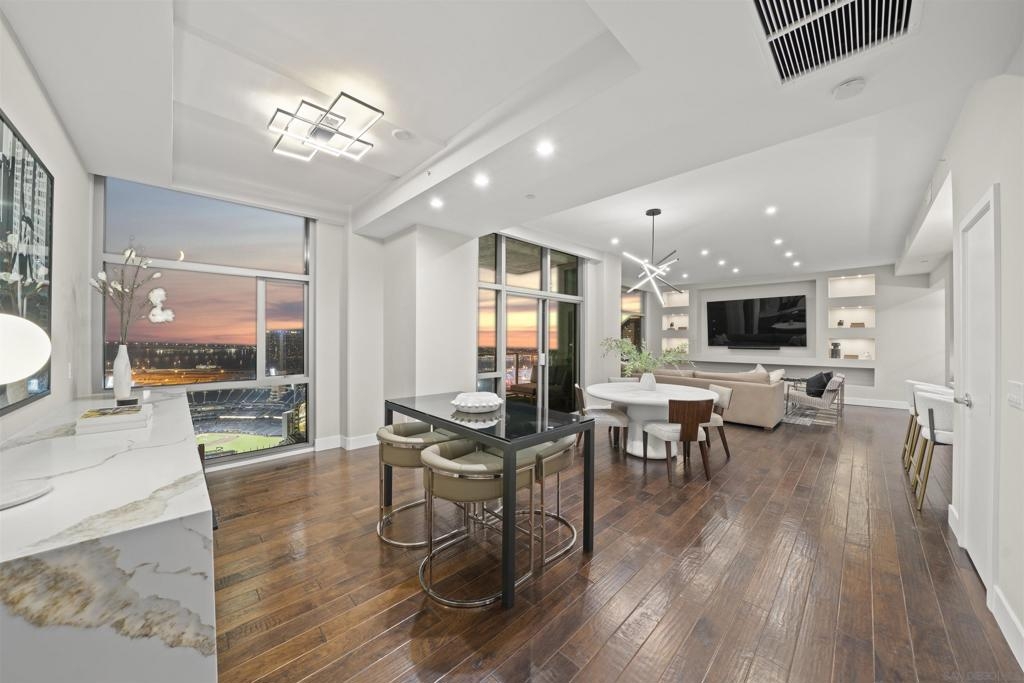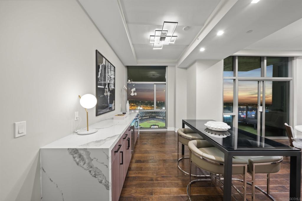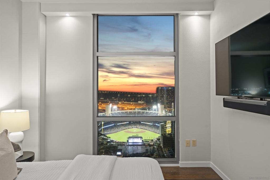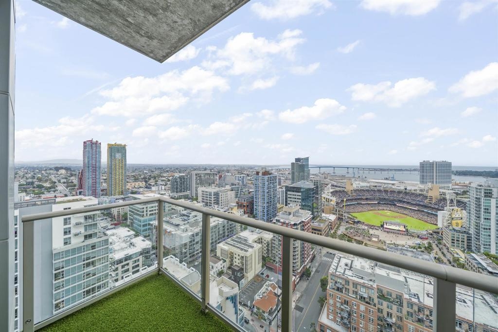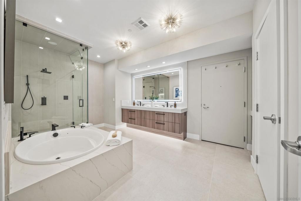 The Mark Residence 3003-Sky-High Sophistication with Iconic Views. Poised high above the city on the 30th floor, The Mark #3003 is a reimagined 3BR/3.5BA corner residence offering 2,430 sqft of elevated indoor-outdoor living. Enjoy three private terraces with sweeping views of the bay,ocean,Coronado & Petco Park. Recently transformed with a designer-led renovation, the home blends timeless elegance with modern luxury. The chef’s kitchen showcases all-new Thermador appliances,a built-in Miele espresso machine,wine fridge,custom cabinetry & matte quartz countertops by Cambria. The luminous backlit Calacatta Thunder quartz bar sets the tone for refined entertaining,while a 98" TV & 100" Aquafire Pro fireplace anchors the expansive great room. This residence offers 10' ceilings & floor-to-ceiling windows throughout. The primary suite features two walk-in closets, two balconies, a private entrance & a spa-like bath with steam shower, soaking tub, Toto washlet & LED mirror. Two en-suite guest rooms are privately located on the opposite wing, maximizing privacy. A former office was opened for a more spacious layout but can easily be restored. Additional highlights include three dedicated parking spaces with an EV charger & a private storage room. With only three residences on this floor, peace & exclusivity are assured. Residents enjoy 24-hr security, a saltwater pool/spa, state-of-the-art fitness center, conference room & a beautifully curated outdoor entertaining area with BBQs, a pizza oven & multiple lounge spaces. This is a rare & refined offering—luxury, privacy & lifestyle.