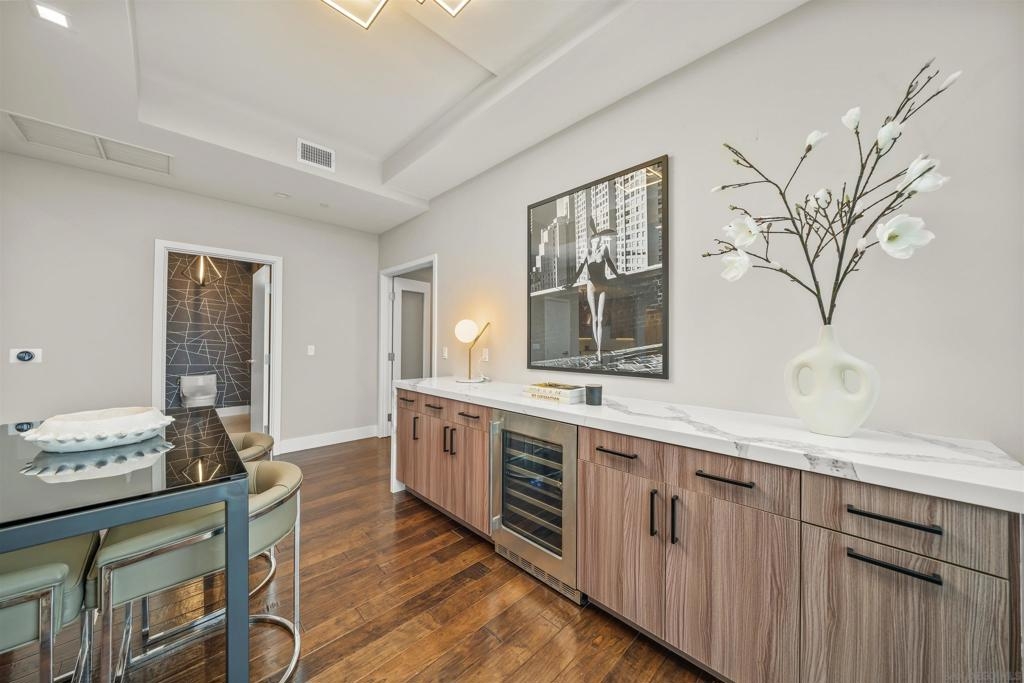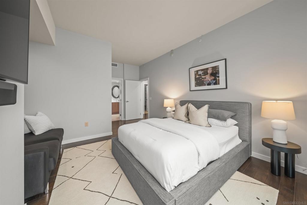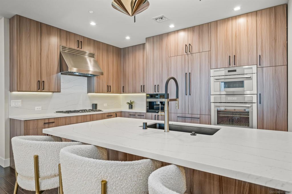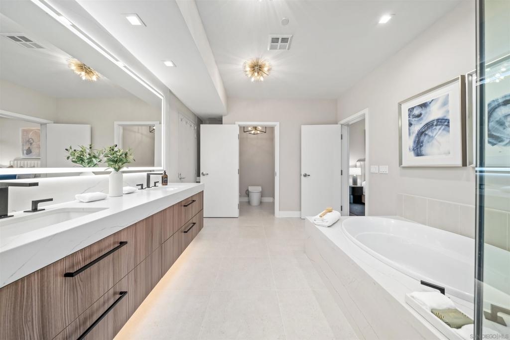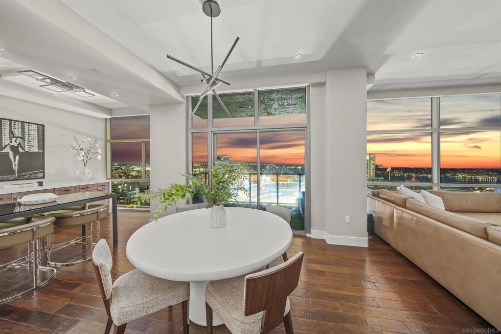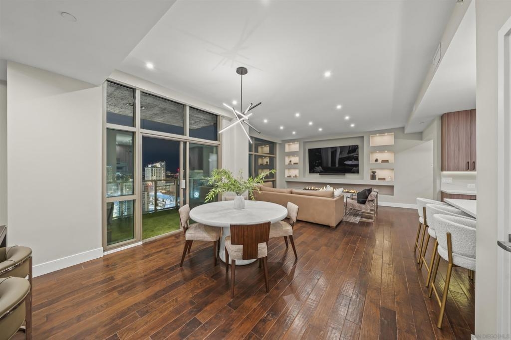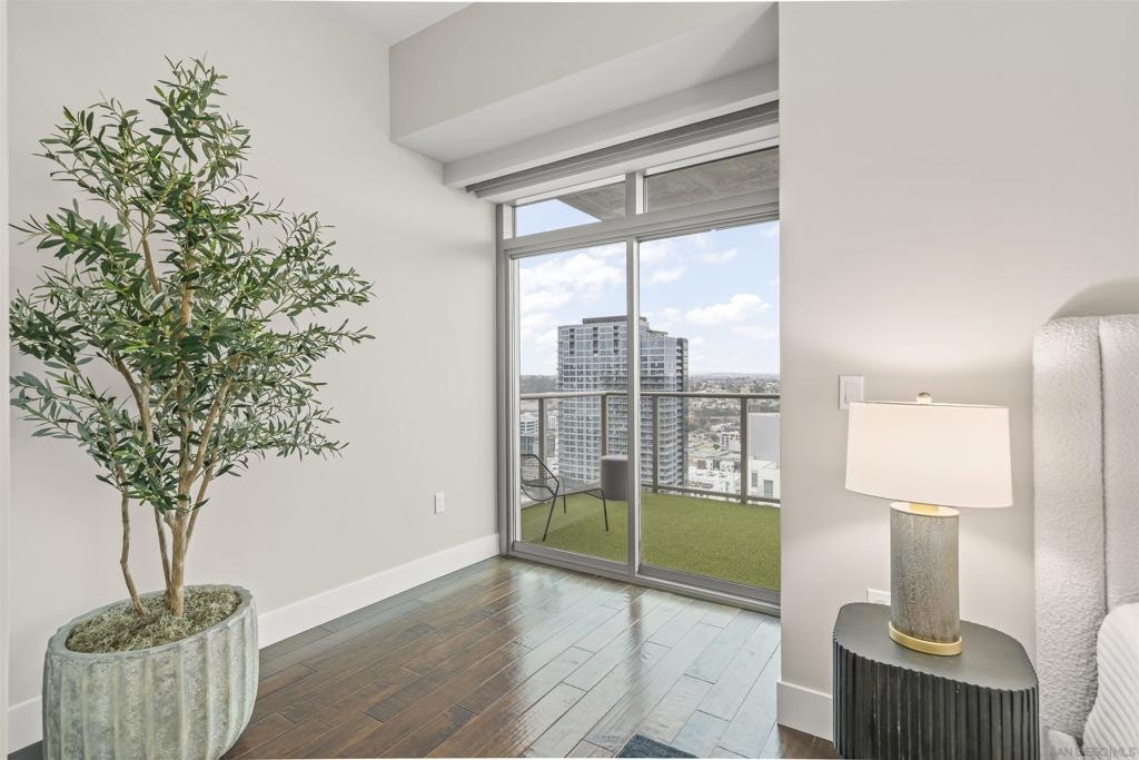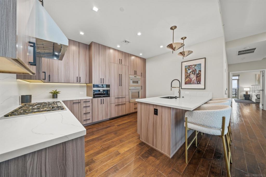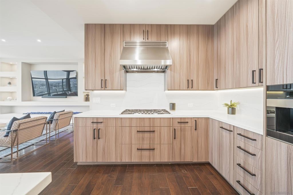 The Mark Residence 3003-Sky-High Sophistication with Iconic Views. Poised high above the city on the 30th floor, The Mark #3003 is a reimagined 3BR/3.5BA corner residence offering 2,430 sqft of elevated indoor-outdoor living. Enjoy three private terraces with sweeping views of the bay,ocean,Coronado & Petco Park. Recently transformed with a designer-led renovation, the home blends timeless elegance with modern luxury. The chef’s kitchen showcases all-new Thermador appliances,a built-in Miele espresso machine,wine fridge,custom cabinetry & matte quartz countertops by Cambria. The luminous backlit Calacatta Thunder quartz bar sets the tone for refined entertaining,while a 98" TV & 100" Aquafire Pro fireplace anchors the expansive great room. This residence offers 10' ceilings & floor-to-ceiling windows throughout. The primary suite features two walk-in closets, two balconies, a private entrance & a spa-like bath with steam shower, soaking tub, Toto washlet & LED mirror. Two en-suite guest rooms are privately located on the opposite wing, maximizing privacy. A former office was opened for a more spacious layout but can easily be restored. Additional highlights include three dedicated parking spaces with an EV charger & a private storage room. With only three residences on this floor, peace & exclusivity are assured. Residents enjoy 24-hr security, a saltwater pool/spa, state-of-the-art fitness center, conference room & a beautifully curated outdoor entertaining area with BBQs, a pizza oven & multiple lounge spaces. This is a rare & refined offering—luxury, privacy & lifestyle.