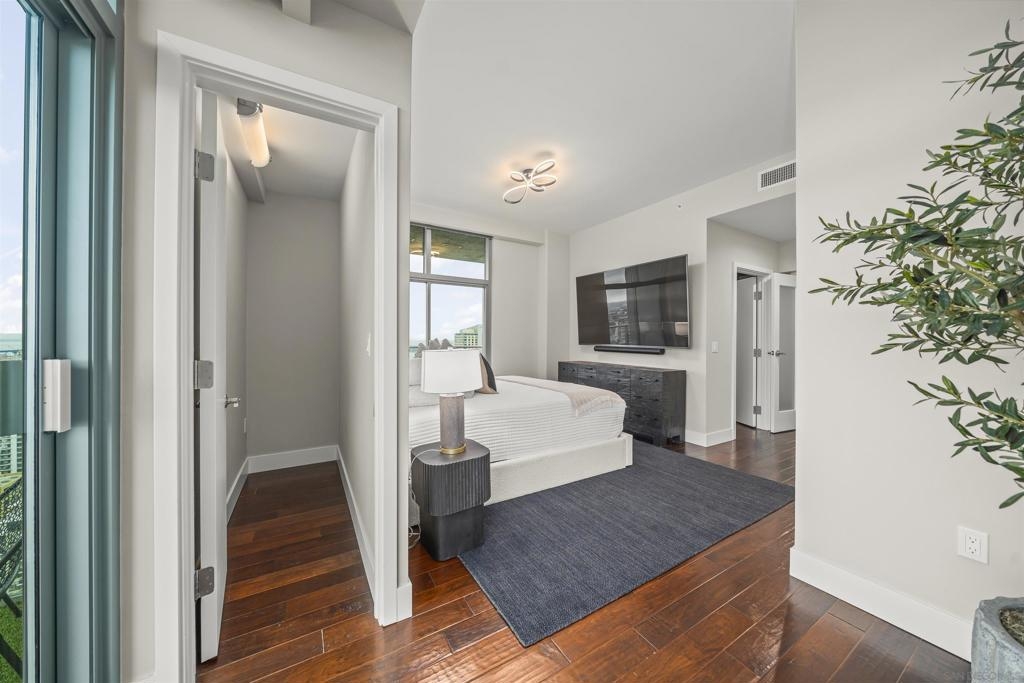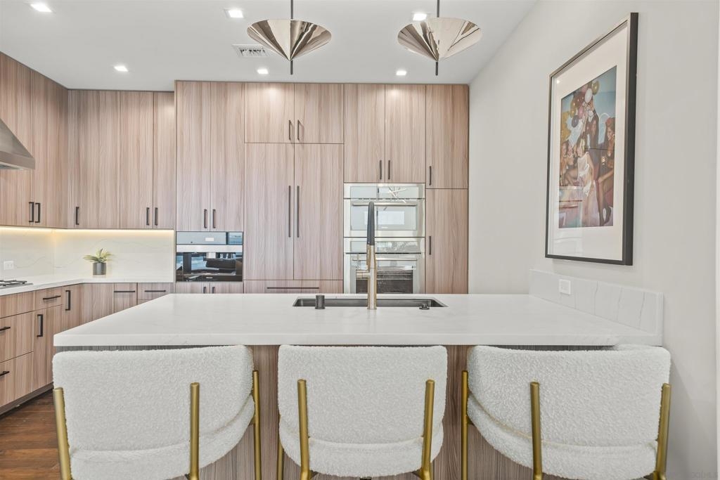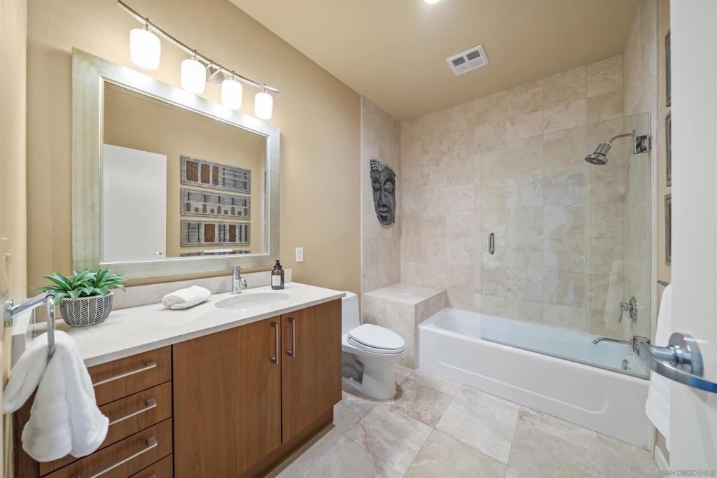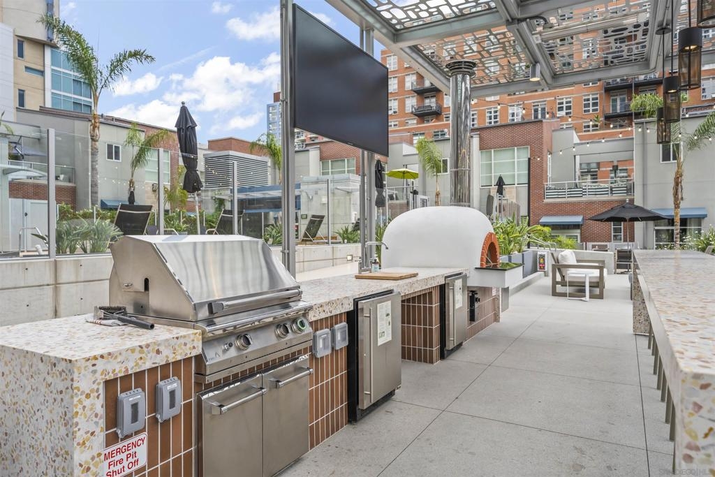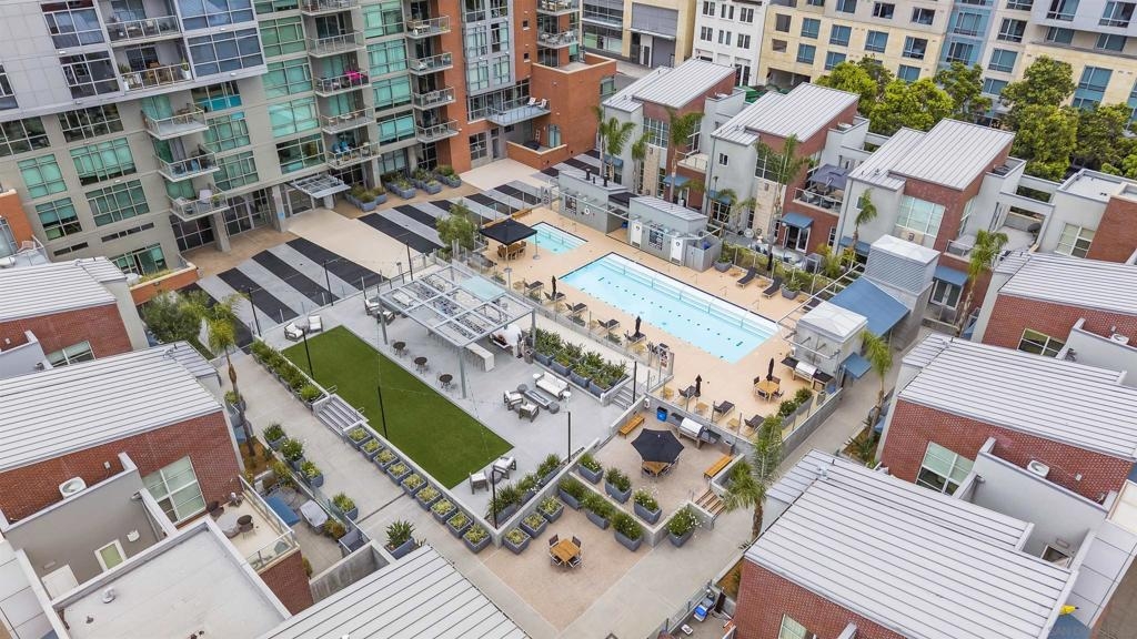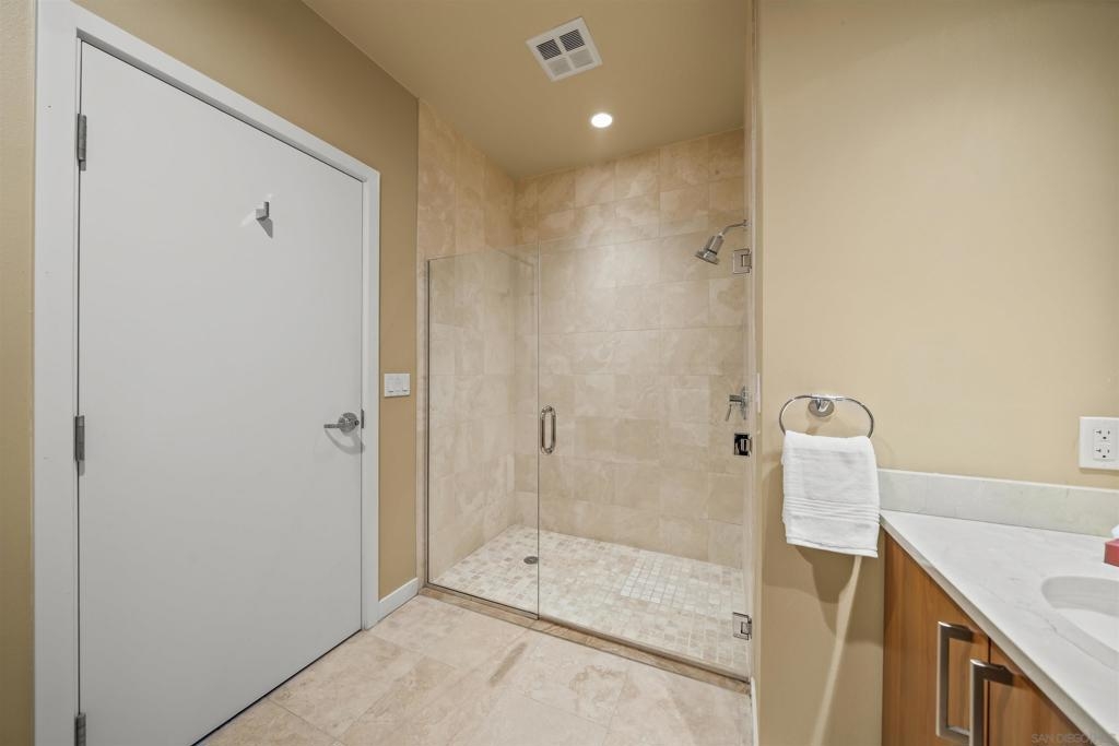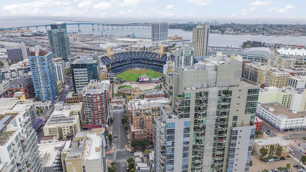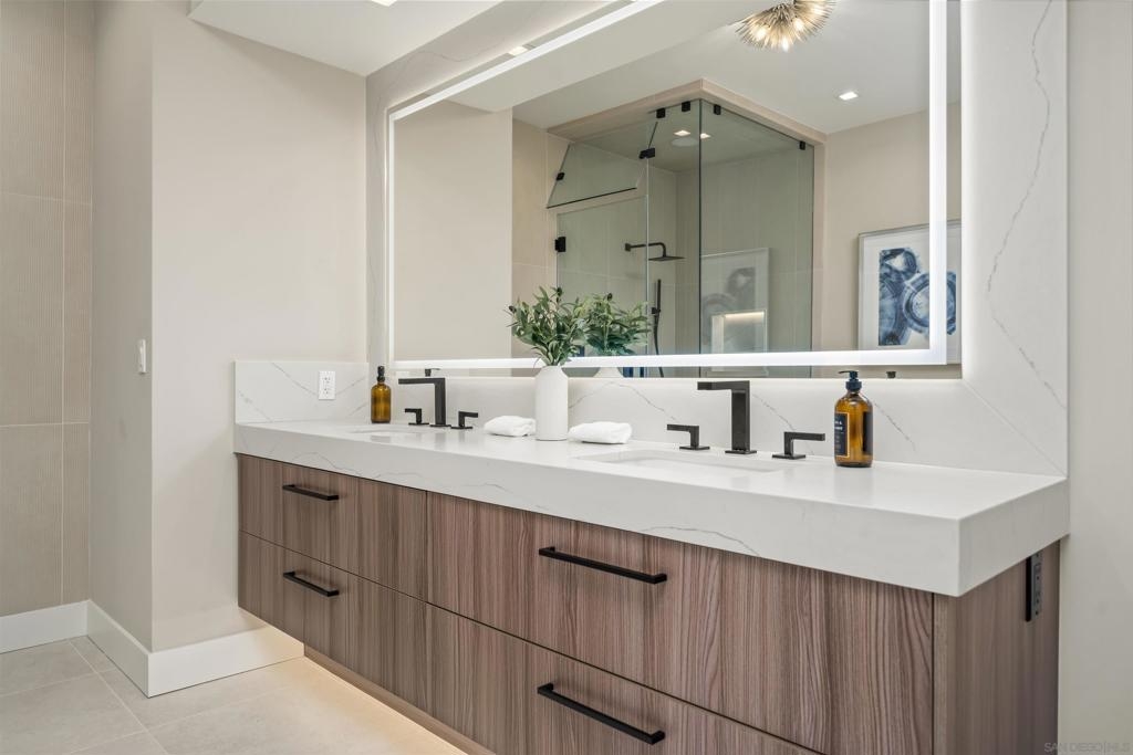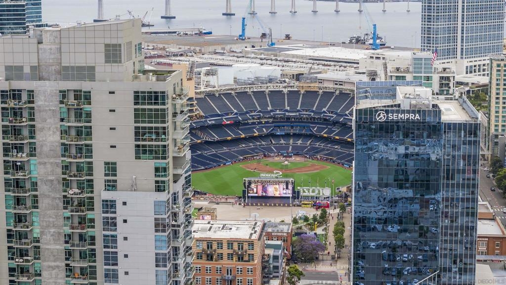 The Mark Residence 3003-Sky-High Sophistication with Iconic Views. Poised high above the city on the 30th floor, The Mark #3003 is a reimagined 3BR/3.5BA corner residence offering 2,430 sqft of elevated indoor-outdoor living. Enjoy three private terraces with sweeping views of the bay,ocean,Coronado & Petco Park. Recently transformed with a designer-led renovation, the home blends timeless elegance with modern luxury. The chef’s kitchen showcases all-new Thermador appliances,a built-in Miele espresso machine,wine fridge,custom cabinetry & matte quartz countertops by Cambria. The luminous backlit Calacatta Thunder quartz bar sets the tone for refined entertaining,while a 98" TV & 100" Aquafire Pro fireplace anchors the expansive great room. This residence offers 10' ceilings & floor-to-ceiling windows throughout. The primary suite features two walk-in closets, two balconies, a private entrance & a spa-like bath with steam shower, soaking tub, Toto washlet & LED mirror. Two en-suite guest rooms are privately located on the opposite wing, maximizing privacy. A former office was opened for a more spacious layout but can easily be restored. Additional highlights include three dedicated parking spaces with an EV charger & a private storage room. With only three residences on this floor, peace & exclusivity are assured. Residents enjoy 24-hr security, a saltwater pool/spa, state-of-the-art fitness center, conference room & a beautifully curated outdoor entertaining area with BBQs, a pizza oven & multiple lounge spaces. This is a rare & refined offering—luxury, privacy & lifestyle.