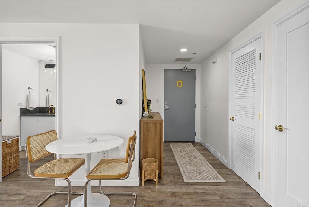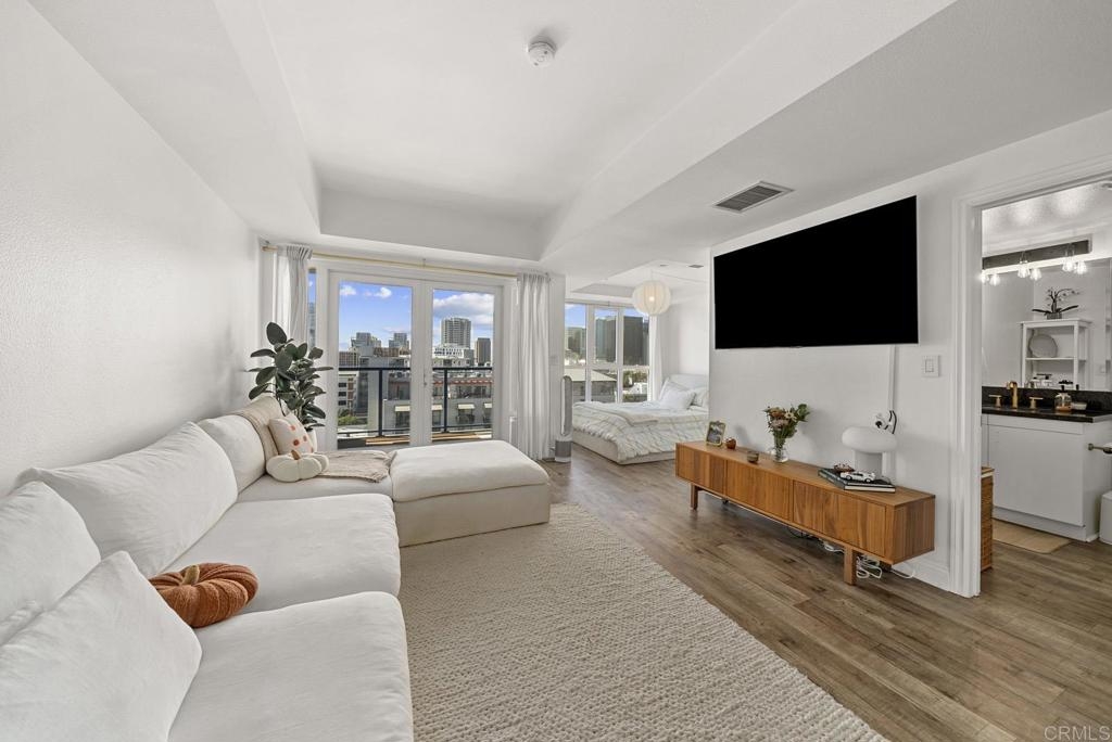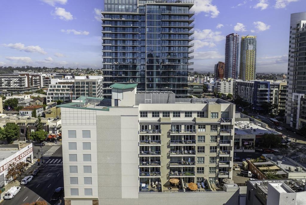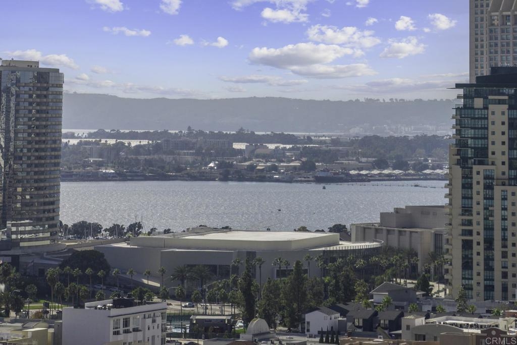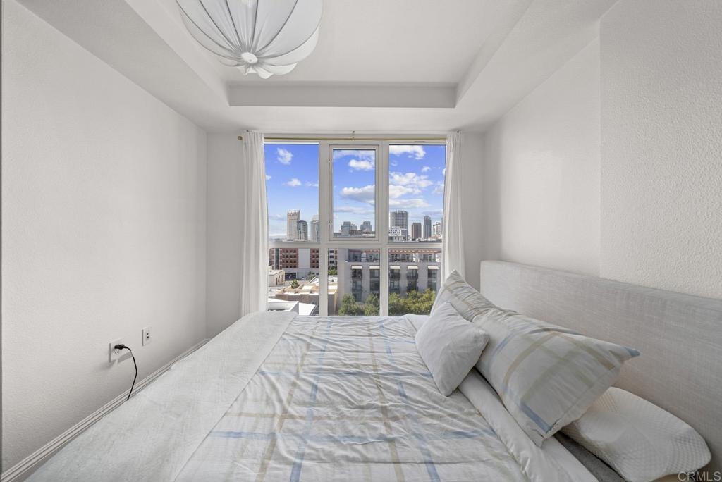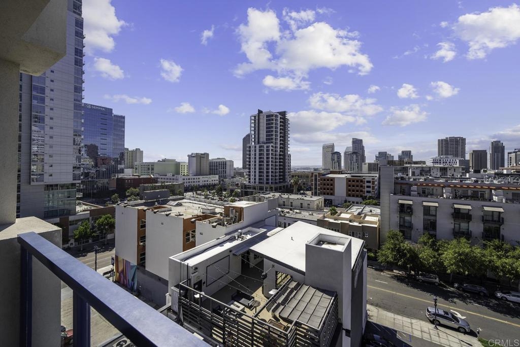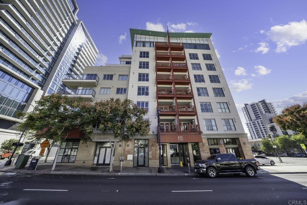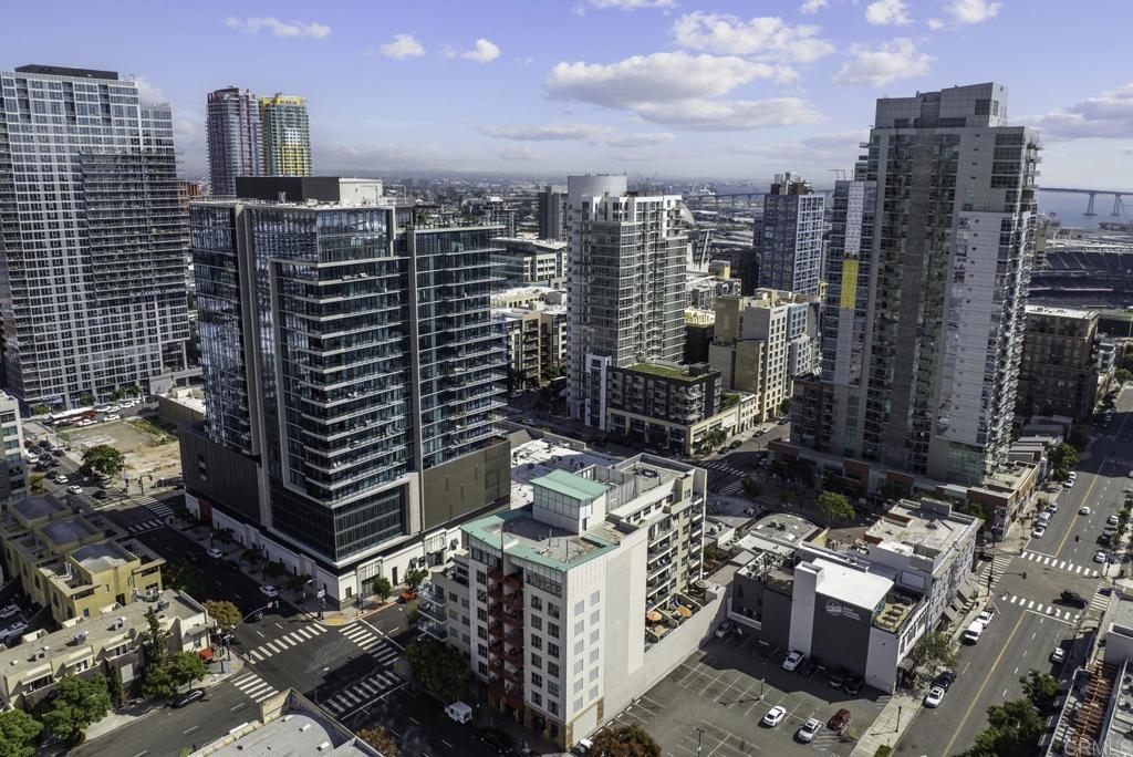 Introducing a breathtaking 7th-floor corner unit with stunning westward views of the downtown skyline and bay. Immerse yourself in the urban lifestyle, savoring the incredible cityscape and sunset vistas from your very own private balcony. This spacious studio boasts a distinct bedroom nook, complete with elegant kitchen cabinetry, stainless steel appliances, quartz countertops, and updated flooring. You'll also find the convenience of an in-unit washer and dryer. In addition, this unit offers a premium parking space on the first level and a separate storage locker. The location is simply ideal, just moments away from Petco Park, the vibrant Gaslamp District, and an array of fantastic restaurants and shops. Building amenities include a welcoming lobby, a fully equipped fitness room, a secure area for bike storage, one designated parking space in the gated underground lot, and a rooftop patio with a communal barbecue. This opportunity is not to be missed.