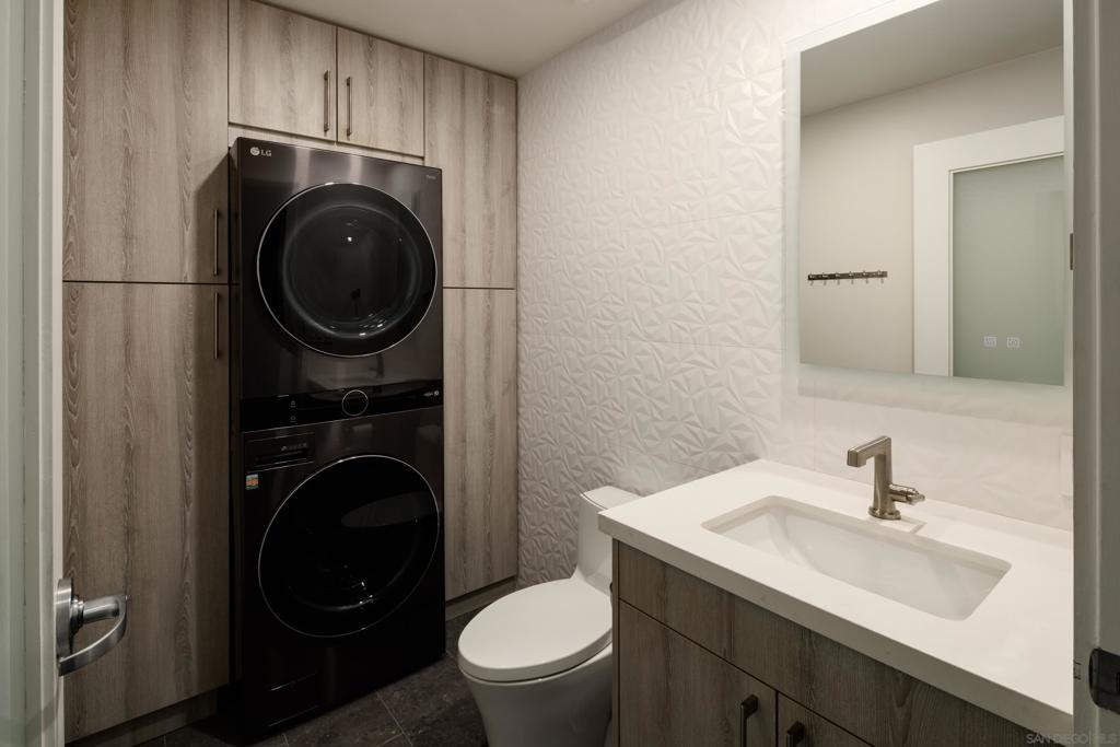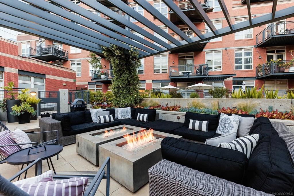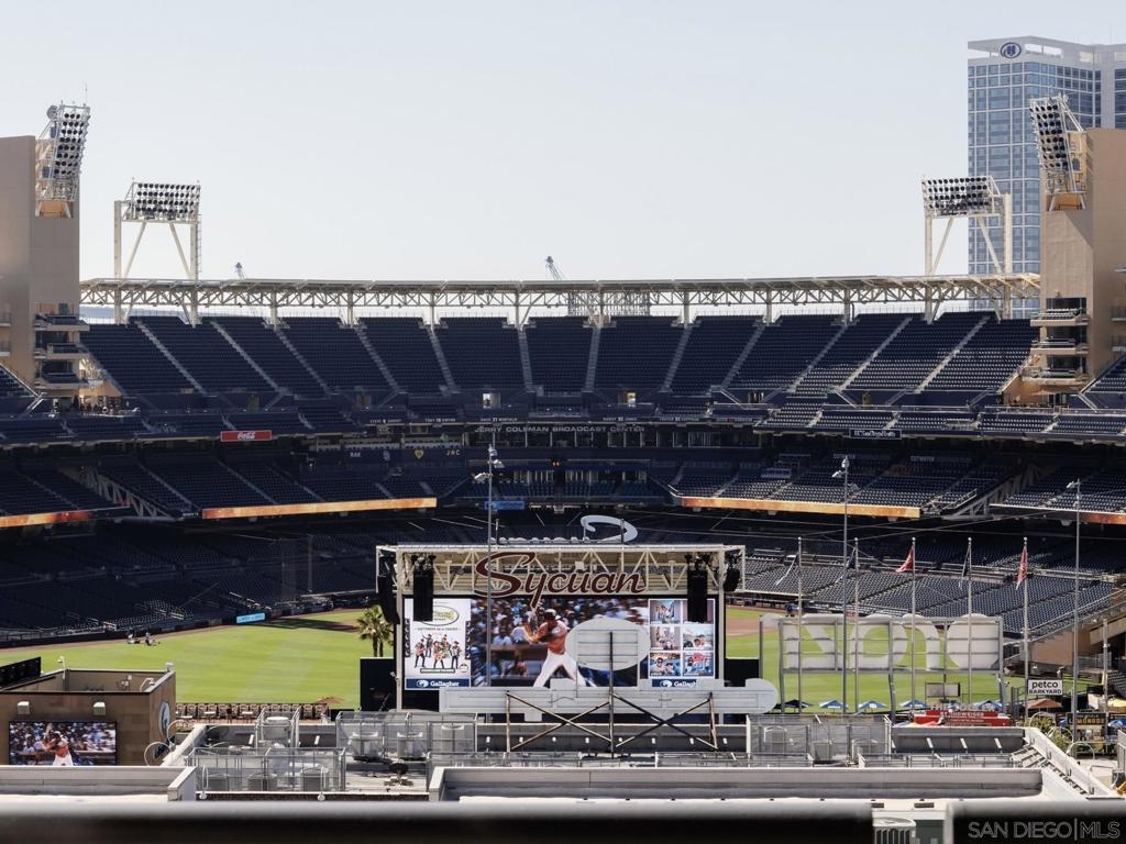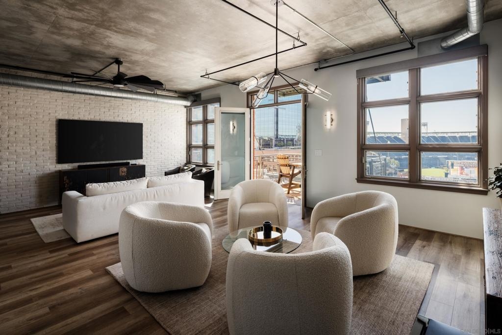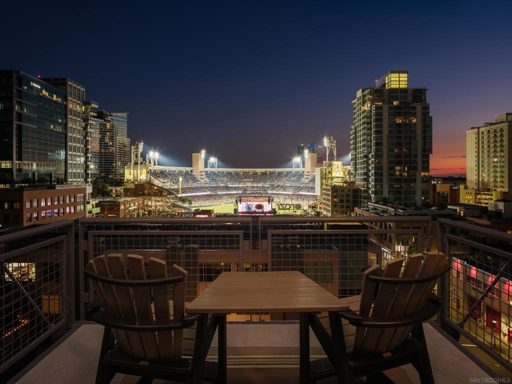 Panoramic ballpark views highlight this distinguished Parkloft residence, with a rare and highly sought-after floor plan. Soaring 10-foot ceilings with exposed ductwork, Pella windows, white brick and concrete wall accents capture the essence of industrial yet elegant loft living. This fully remodeled residence features a brand new chef’s kitchen, showcasing bespoke cabinetry, waterfall-edge quartz countertops, slate subway tile backsplash and Thermador appliances with a 5 burner gas cooktop. Both bathrooms were completely reimagined featuring new cabinetry, quartz countertops, Toto toilets and a large soaking tub with glass shower in the primary bath. New engineered hardwood floors extend throughout the loft, enhancing its modern sophistication while dramatic custom lighting installations create ambiance and architectural intrigue. The expansive Pella windows feature custom motorized shades and open up to the city’s most iconic panoramic Petco Park views. The large private terrace is equipped with gas hookups, perfect for alfresco dining and entertaining. A large storage unit and two (2) oversized side by side parking spaces are deeded to this unit, and both located a few steps from the elevators. Parkloft features a state of the art underground parking garage with tall ceilings and robust ventilation systems. Parkloft residents enjoy a well appointed fitness center; 24-hour concierge and security services; on-site management ensuring exceptional care and convenience; and a serene landscaped courtyard with ambient fire features, BBQ’s and a club house with a kitchenette which opens up to a large outdoor dining table and sets the stage for effortless outdoor entertaining. The Ballpark District spans 22 blocks surrounding Petco Park, where the Padres-affiliated Ballpark District Community Partnership provides daily clean-up services to maintain the area.