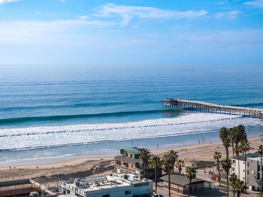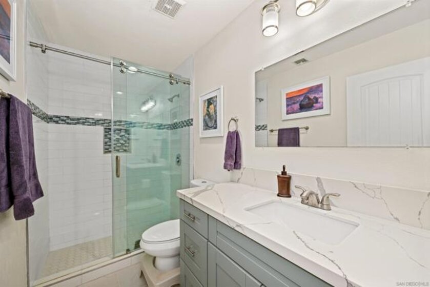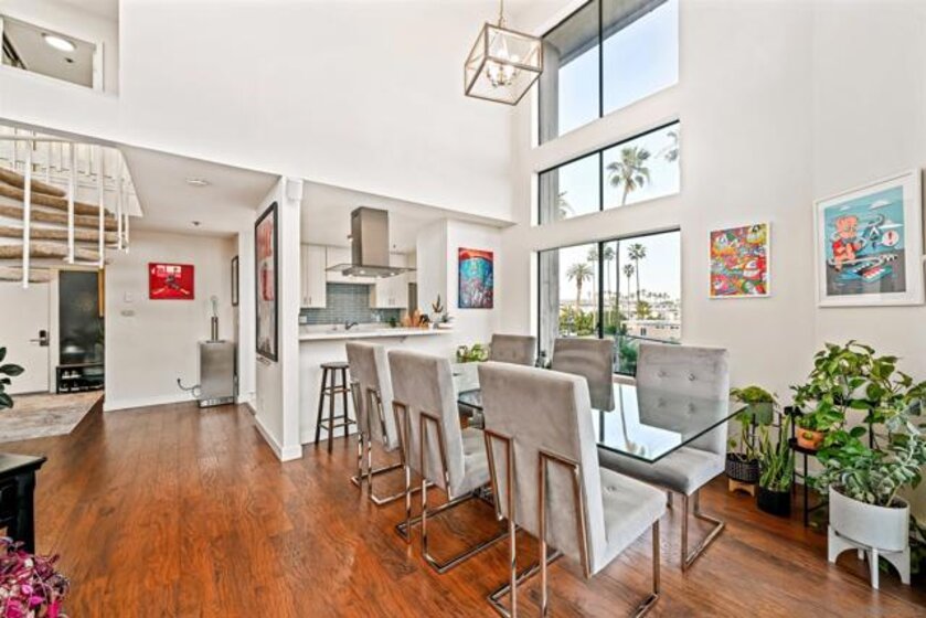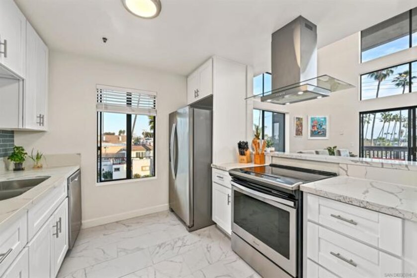 Stunning loft-style townhome in Pacific Beach, approximately 1.5 blocks from the ocean. This unique two-story residence occupies the top two floors of a four-story elevator-served building, offering exceptional natural light with a dramatic 18-foot ceiling, and windows with southeast corner exposure. Recently remodeled with modern finishes throughout, the home features an open-concept kitchen with stainless steel appliances, quartz countertops, a fresh new designer backsplash, reverse osmosis water filtration, and seamless flow into the living and dining areas. The flexible floorplan provides private access from both the third and fourth floors, allowing for a variety of living configurations. The main level includes a spacious bedroom, full bathroom, and open living space, while the upper level offers a private primary suite with a designer bathroom, an additional bedroom, and an in-unit laundry area. Interior upgrades include light-toned cabinetry, modern tile flooring in the kitchen and bathrooms, quartz surfaces, and custom lighting and plumbing fixtures. Community amenities include a fitness room, a large common room for events, new security camera system, gated and secure parking with two side-by-side spaces. Conveniently located across the street from Ralphs grocery store and close to dining, shopping, and coastal recreation in one of Pacific Beach’s most walkable neighborhoods.