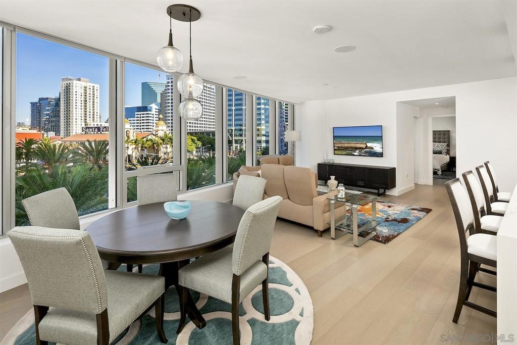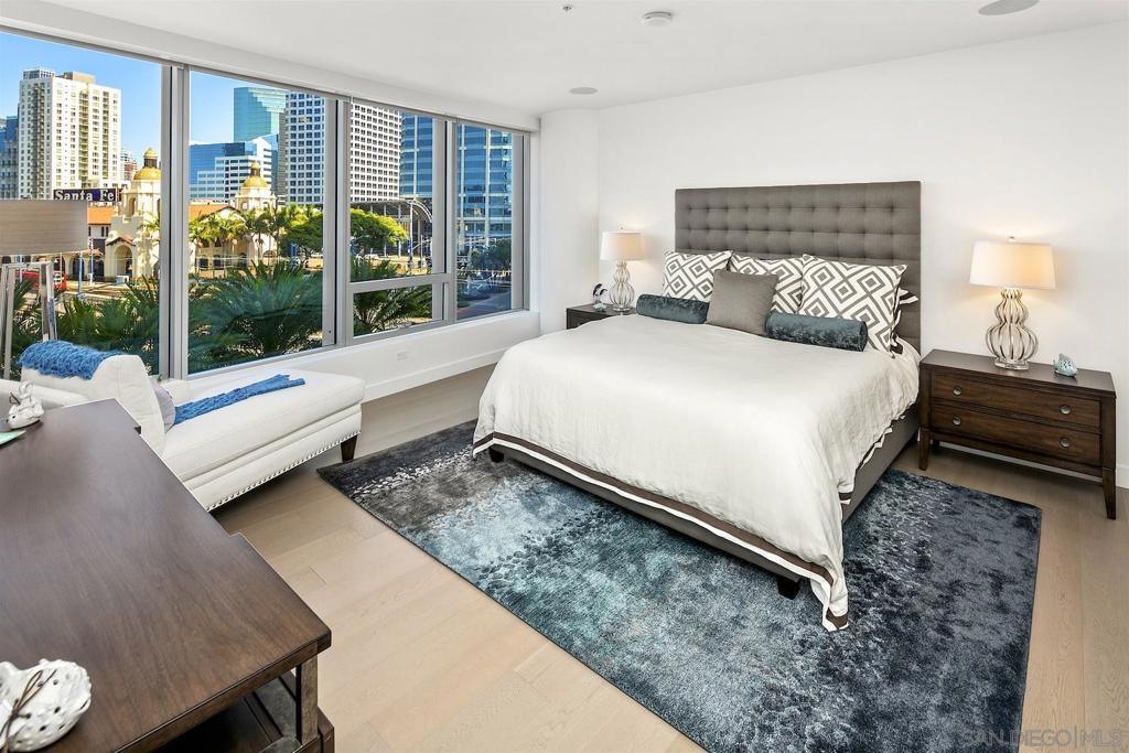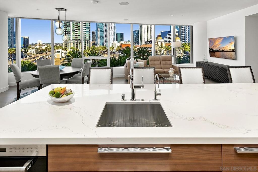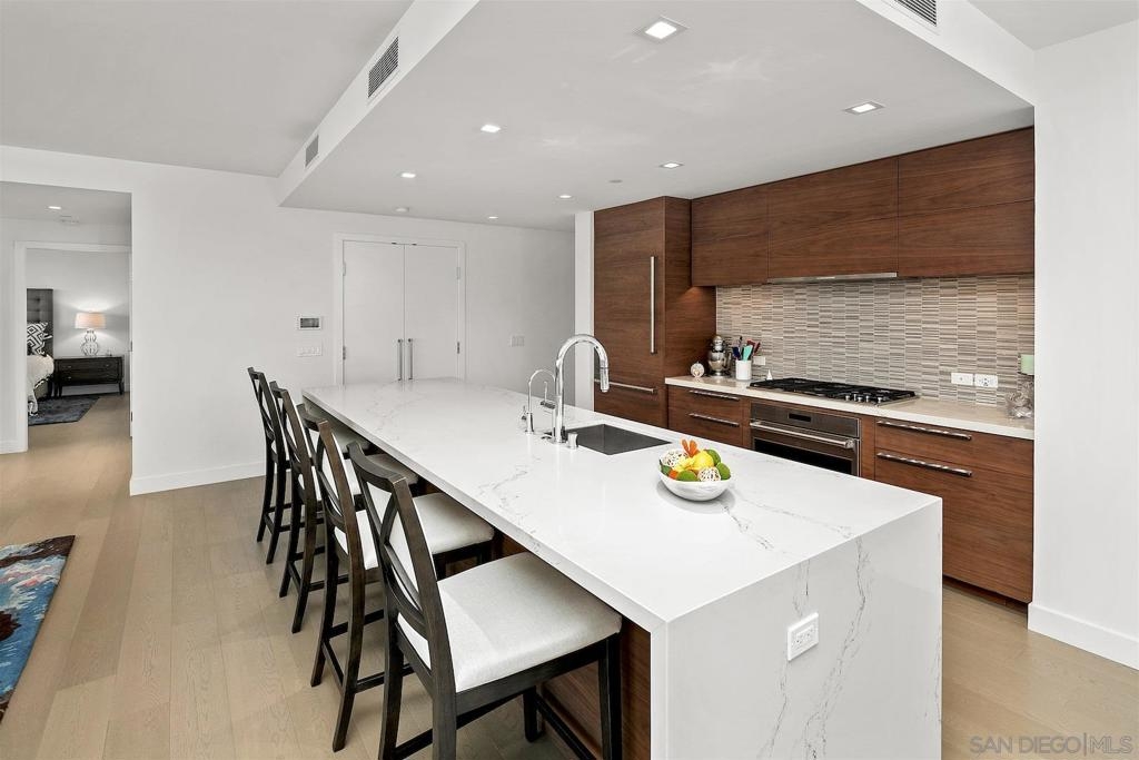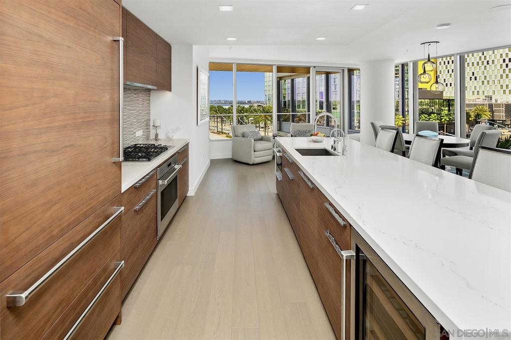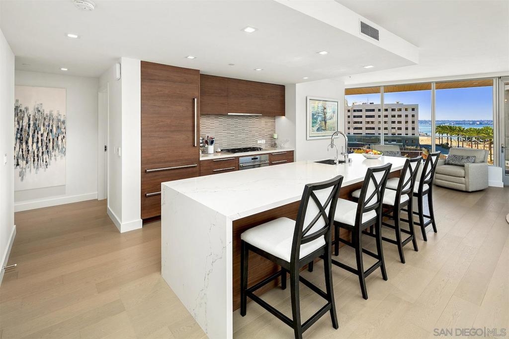 Luxurious appointments beautifully orchestrated to provide privacy and ease at every turn while maintaining an element of sophisticated casual. A northwesterly orientation provides a dramatic city backdrop while enjoying the tranquility of San Diego's coveted waterfront from your 32' terrace! World-class amenities: yacht-share, Chef Concierge, 24hr reception, car fleet, pet retreat, entertaining deck w/resort-style pool, club w/outdoor dining features, guest suite, business center & screening room. Additional property details include: 16' formal gallery entry hall; 32' x 7' covered view terrace; KITCHEN--custom cabinetry by Hirsch Bedner Associates (HBA): stunning grain match wood veneer; custom HBA designed wave pattern cabinet pull hardware, combination of polished and satin chrome; push button upper cabinetry for ease of access and to maximize storage (lift cabinets only); Sub-Zero cabinet-front refrigerator, water dispenser, and ice maker; Wolf stainless steel five-burner gas cooktop; Wolf stainless steel convection oven; Miele stainless steel built-in range hood; Miele energy-efficient dishwasher with custom cabinet door panel and hidden controls; Wolf microwave; Caesarstone countertops and mosaic stone backsplash; ceiling can lights, custom ceiling-mount lighting over entertaining island; integrated Everpure water filtration system; MASTER BATH--12" x 24" polished stone tile flooring; stone tiled wet walls; stone slab vanity with undermount sink and Graff faucet; soft-close wood veneer cabinets; frameless glass-enclosed shower with stone tile surround; Graff chrome ceiling-mounted rain shower with hand shower system; bathtub with stone surround; electric mirror with defogger and 10" TV with Bluetooth and lighting; Grohe chrome accessories SECONDARY BATHS--Stone or porcelain flooring; stone vanity tops; illuminated mirror. LIVING AND OTHER--ultra customized master bedroom closet with LED lighting; contemporary hardwood plank flooring throughout living ar...