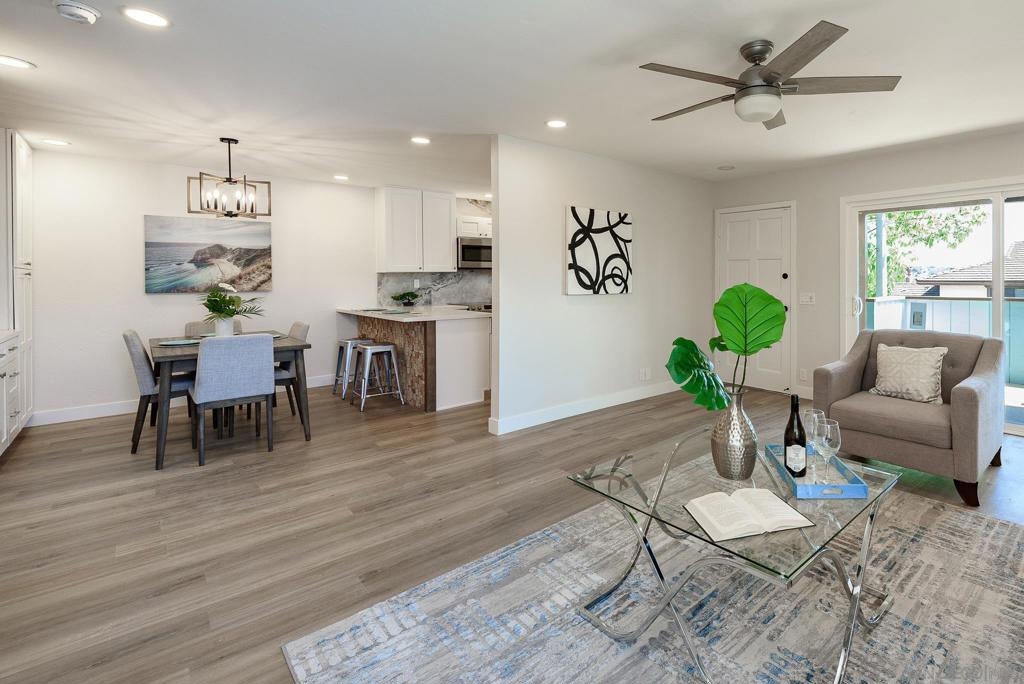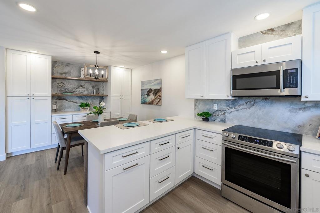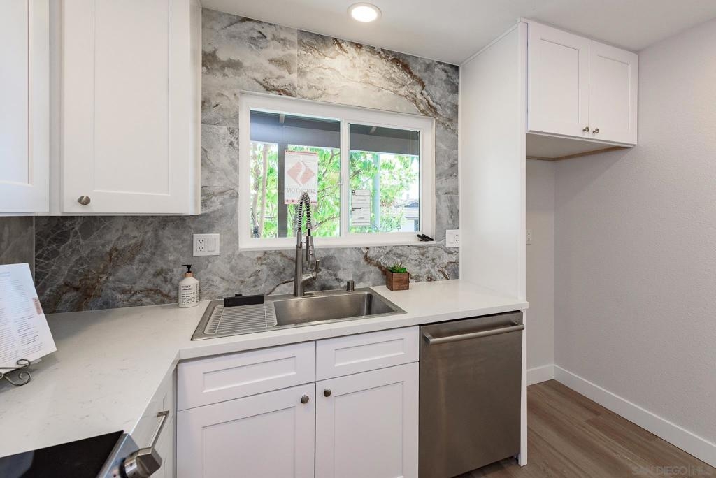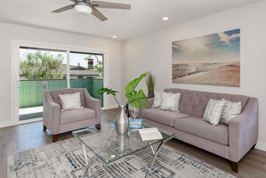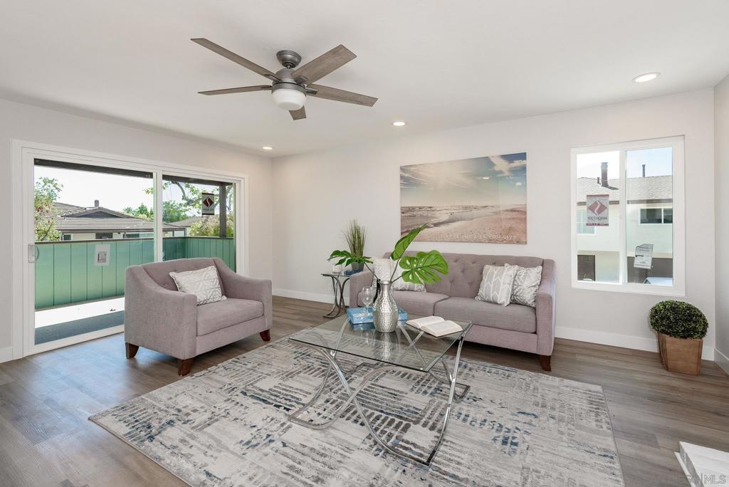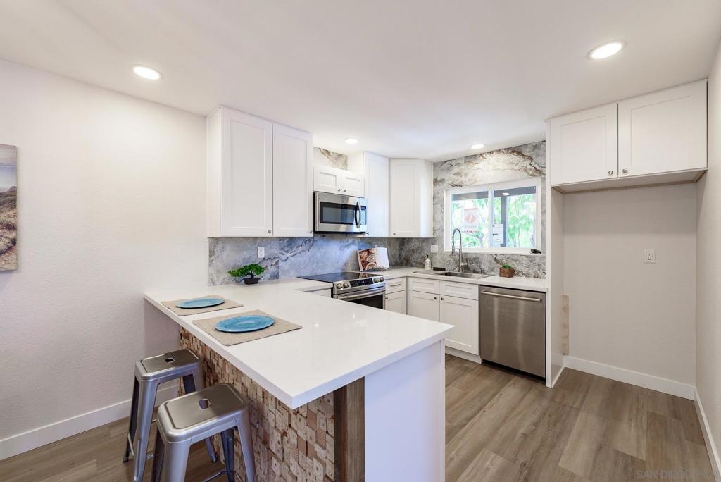 HUGE Price reduction! 2 Bd/1.5BA Beautifully reimagined interior remodel reflects the modern aesthetics of the moment. Optimally situated to capture southern/western exposure, this quiet upper unit single story home captures sunlight all day long through brand new energy efficient windows (warranty transfers to new owner). The dust is still settling from the recent remodel, which includes NEW: LVP flooring, Shaker cabinets, quartz counters, in-ceiling lights and ceiling fan, baseboards and molding, doors, bathroom. See SUPP: Woodworking craftsmanship on display under the peninsula counter and custom stained shelving. Stainless steel appliances. In-unit stacked laundry closet. New epoxy garage floors. Centrally located near HOA pool. Complex has many mature trees offering cool breezes and beautiful landscaping. Walk to Mt Carmel High, shops, restaurants and more. Sited nicely in a quiet part of the complex facing Caminito Cuadro, not a busy street or freeway.